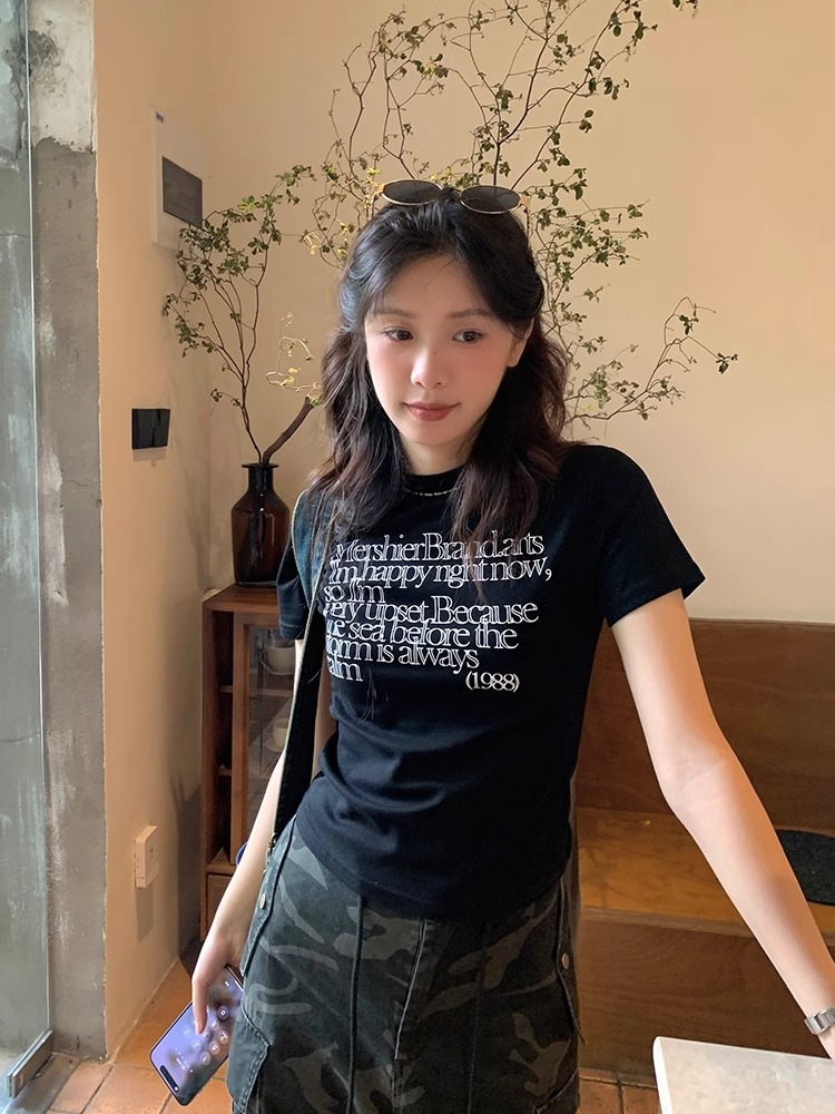 한국 스타일 소녀 2025 년 여름 슬림 핏 반팔 티셔츠 여성 복고풍 편지 인쇄 어깨 반팔 캐주얼 탑스토어 가기