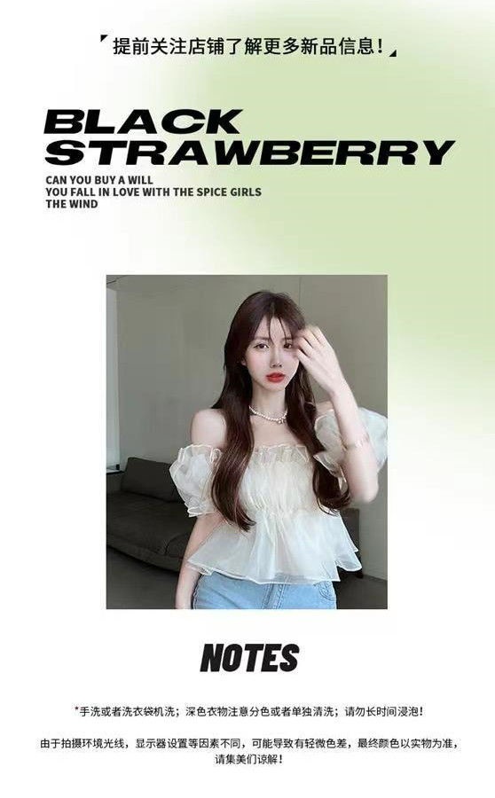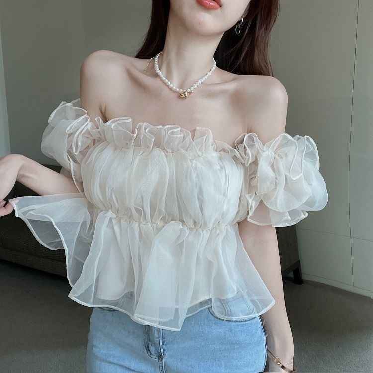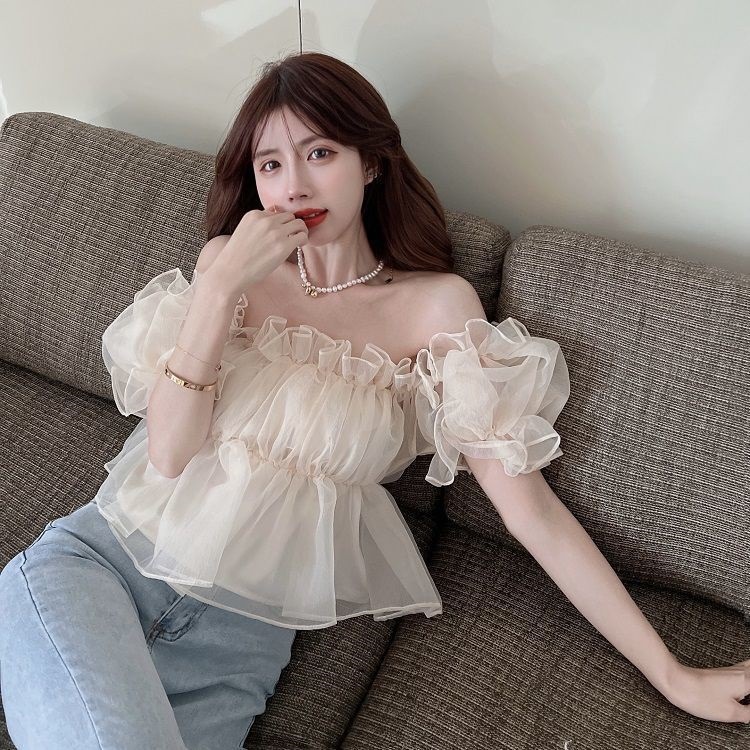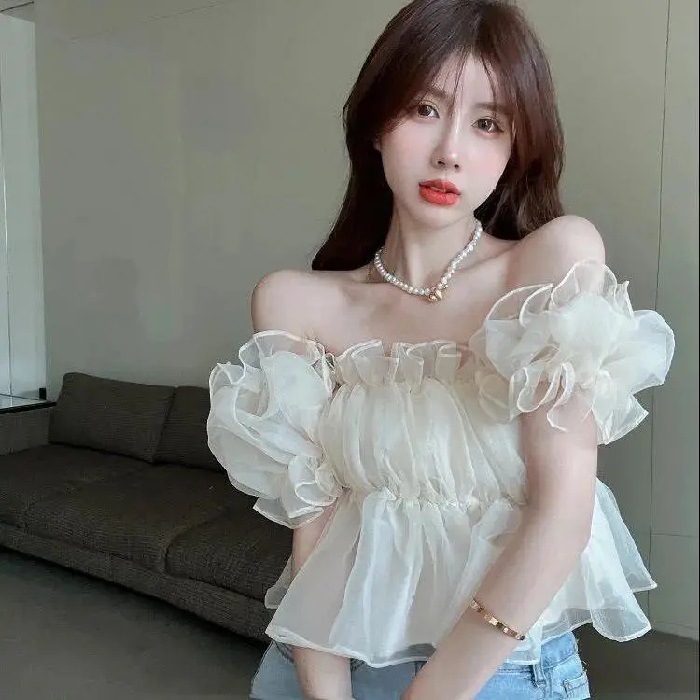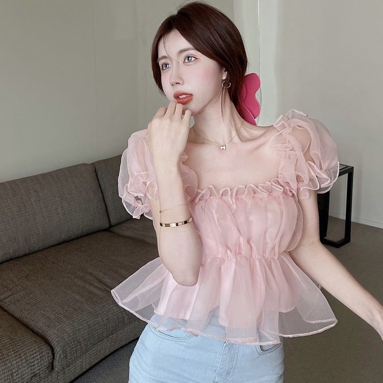 여성용 어깨 쉬폰 셔츠 여름 뜨거운 소녀 디자인 니치 프렌치 퍼프 슬리브 스위트 쇼트 탑스토어 가기