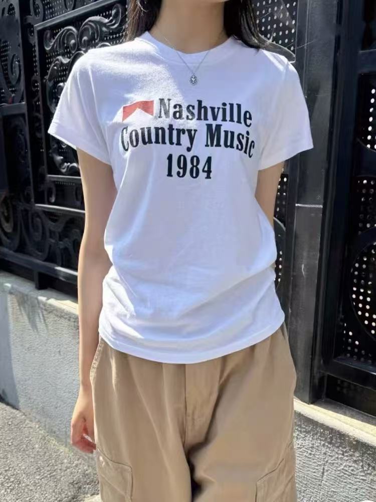 BM 스타일 아메리칸 뉴 스타일 Ouyang Nana 같은 스타일 화이트 레터 라운드 넥 반팔 티셔츠 여성 슬림 피트 숄더 탑 여름스토어 가기