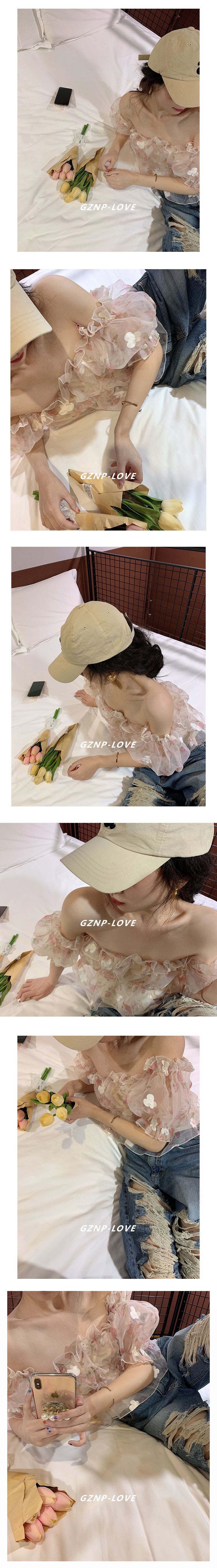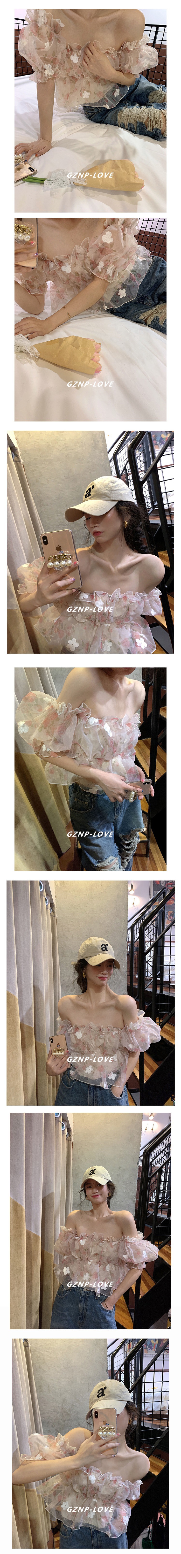프랑스 스타일 달콤한 꽃 쉬폰 셔츠 여성용 여름 순수한 욕망 스파이스 소녀 짧은 세련된 탑 버블 슬리브와 오프 숄더스토어 가기