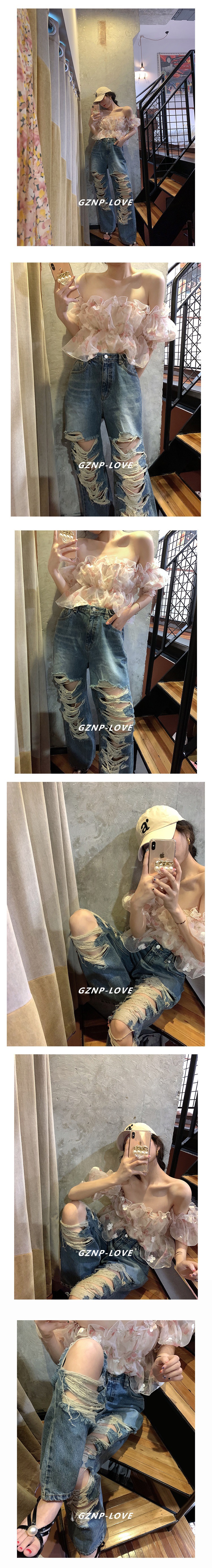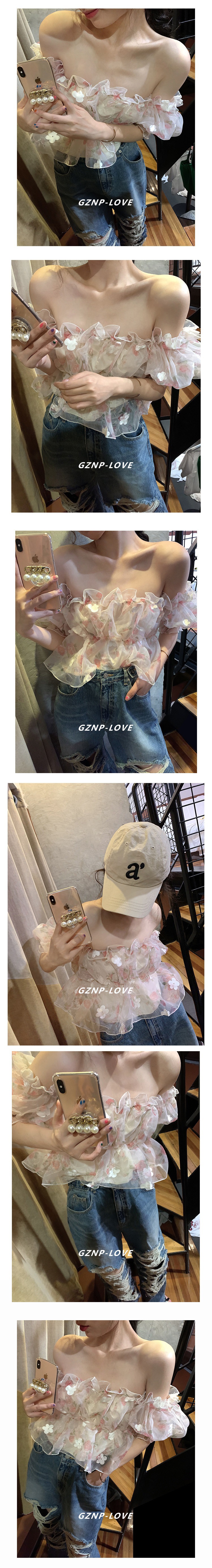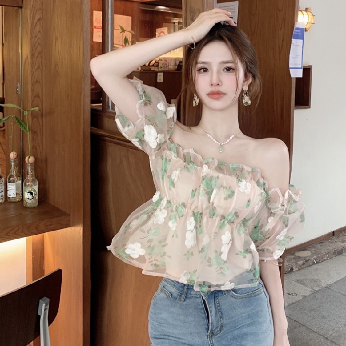 프랑스 스타일 달콤한 꽃 쉬폰 셔츠 여성용 여름 순수한 욕망 스파이스 소녀 짧은 세련된 탑 버블 슬리브와 오프 숄더