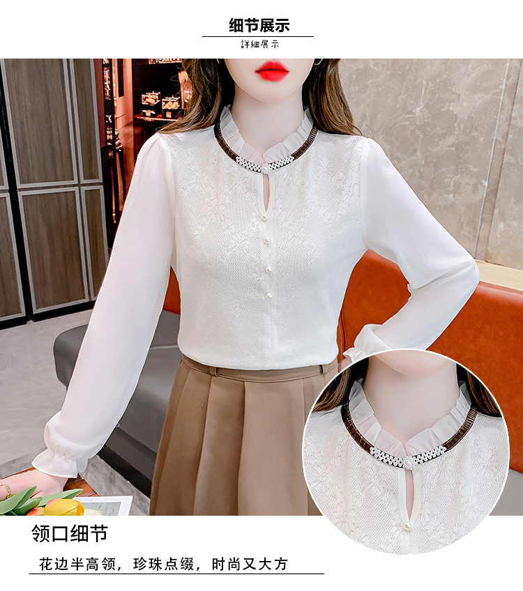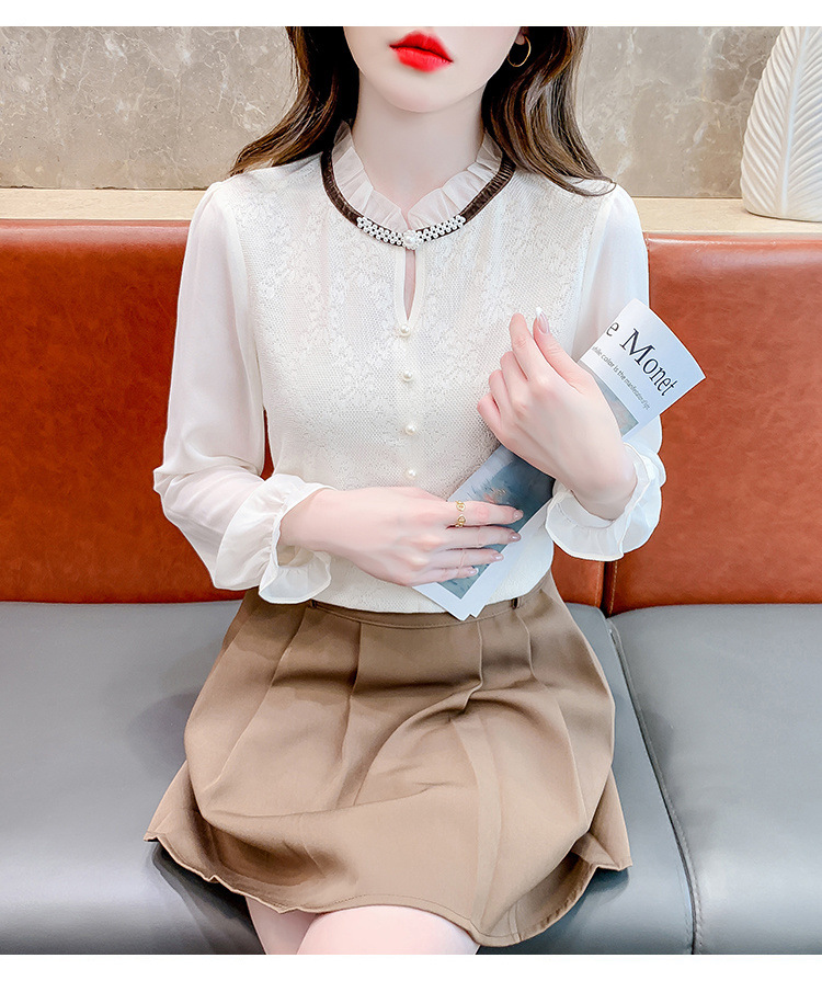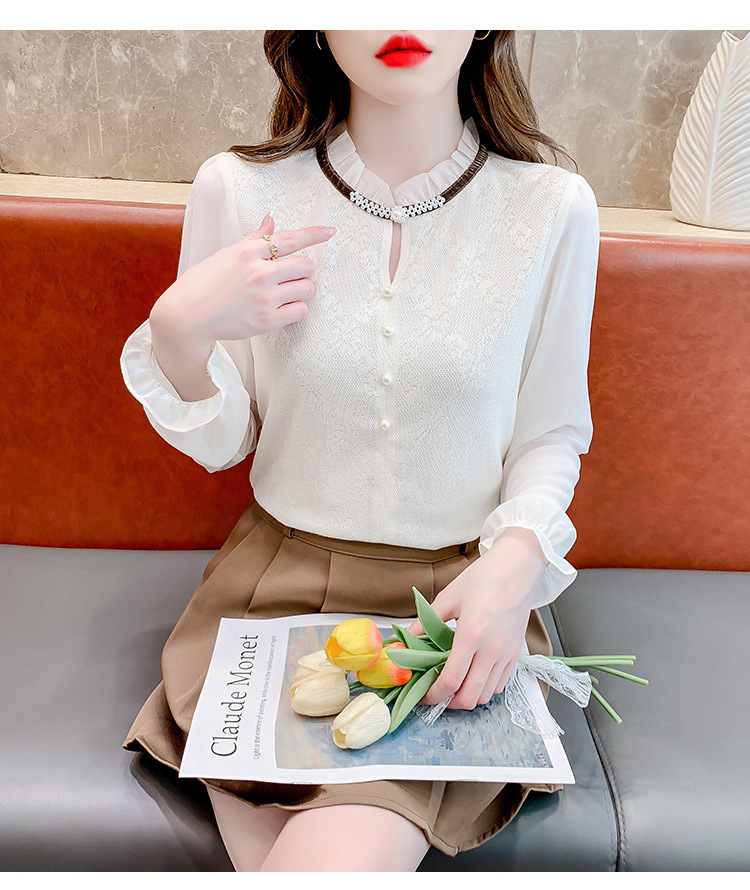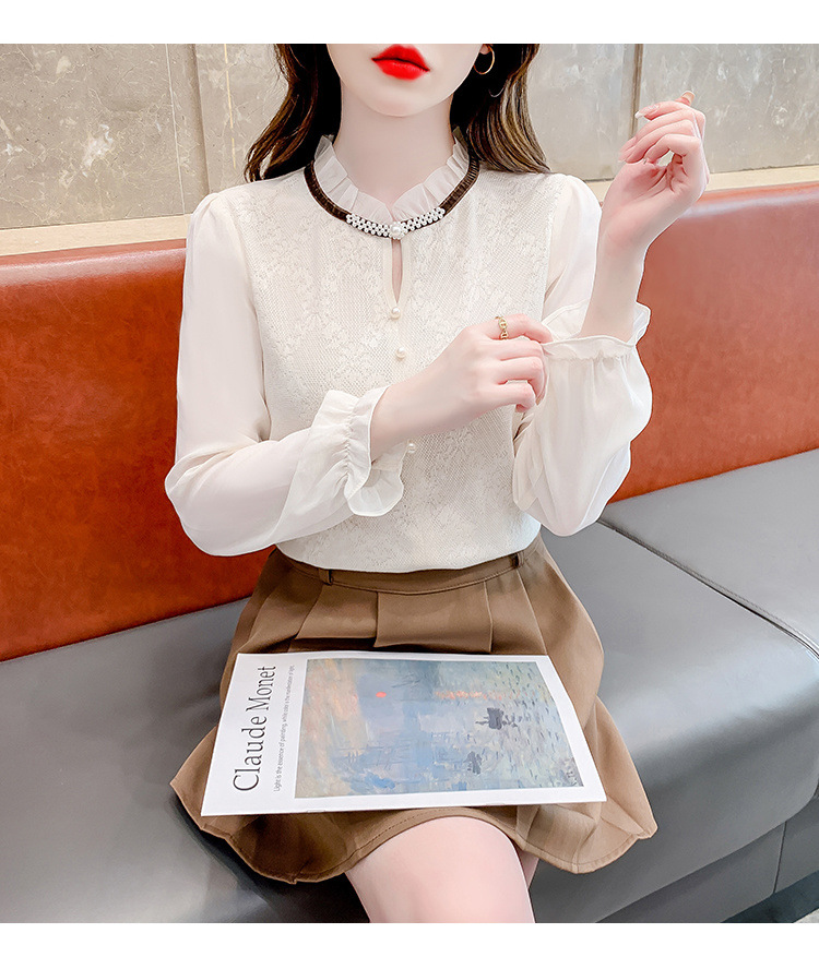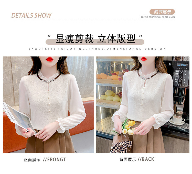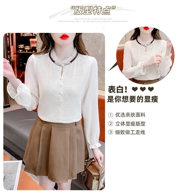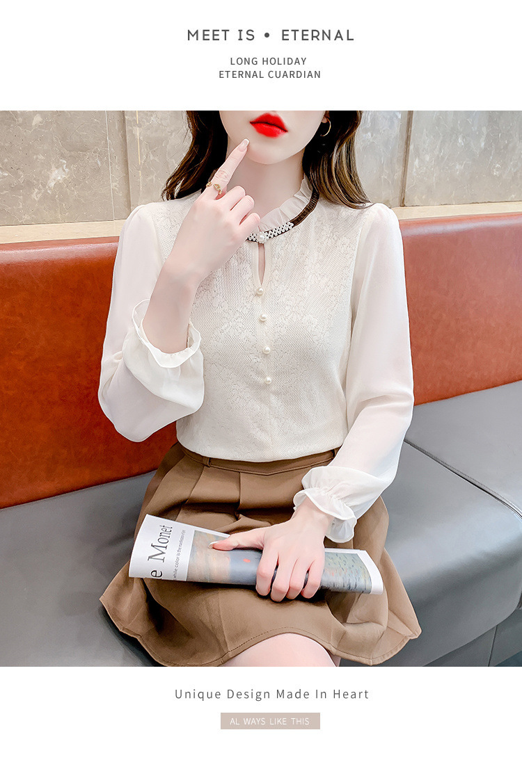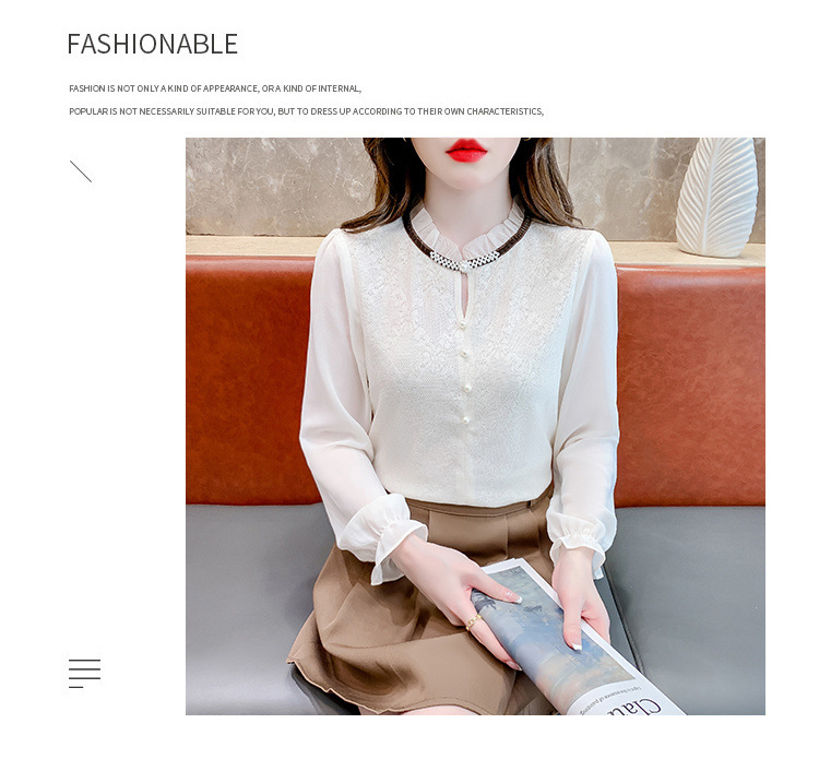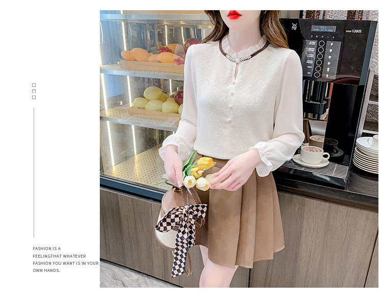 얇은 프랑스 스타일 우아한 봄과 가을 새로운 스타일 셔츠 세련된 패션 최고 연령 감소 긴 소매 레이스 셔츠 쉬폰 셔츠 여성용 트렌디스토어 가기