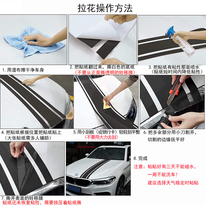 [功能]:自粘,可拆卸,不收缩,防水,长期耐久,汽车装饰,耐高温,表面防污UV涂层,富有光泽,质感如车漆、防晒、不退色,撕除不留残胶、不伤车漆。