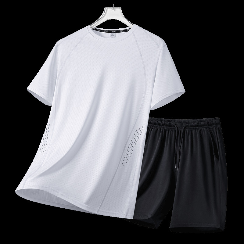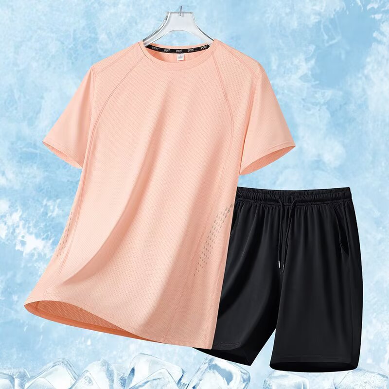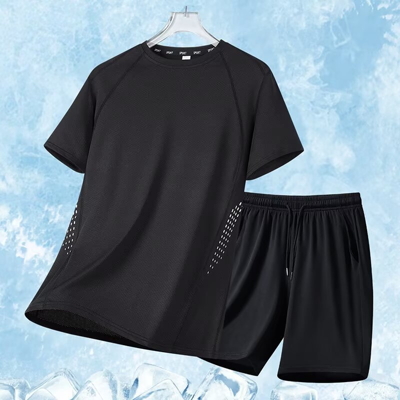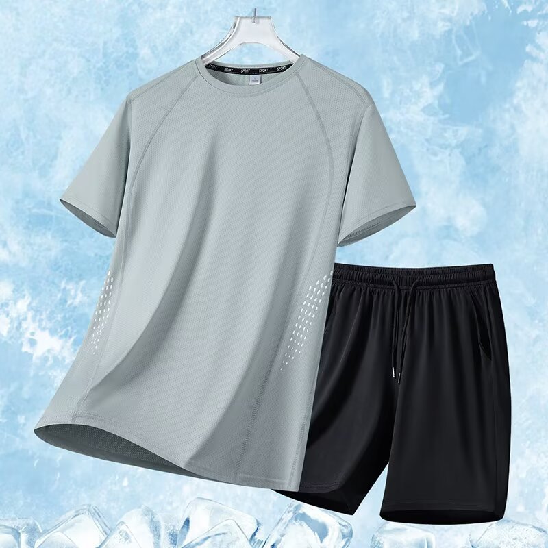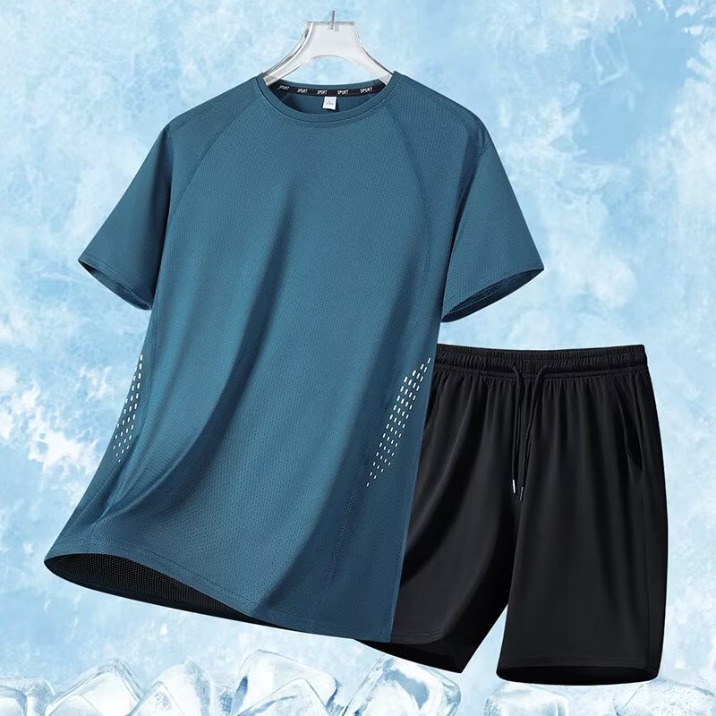 아이스 실크 스포츠 세트 남자 여름 얇은 빠른 건조 통기성 소년 느슨한 캐주얼 반팔 티셔츠 반바지 세트
