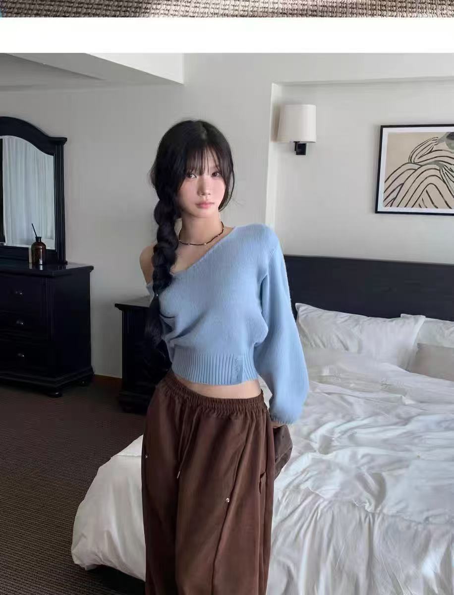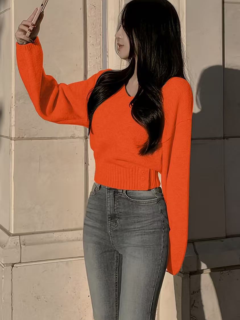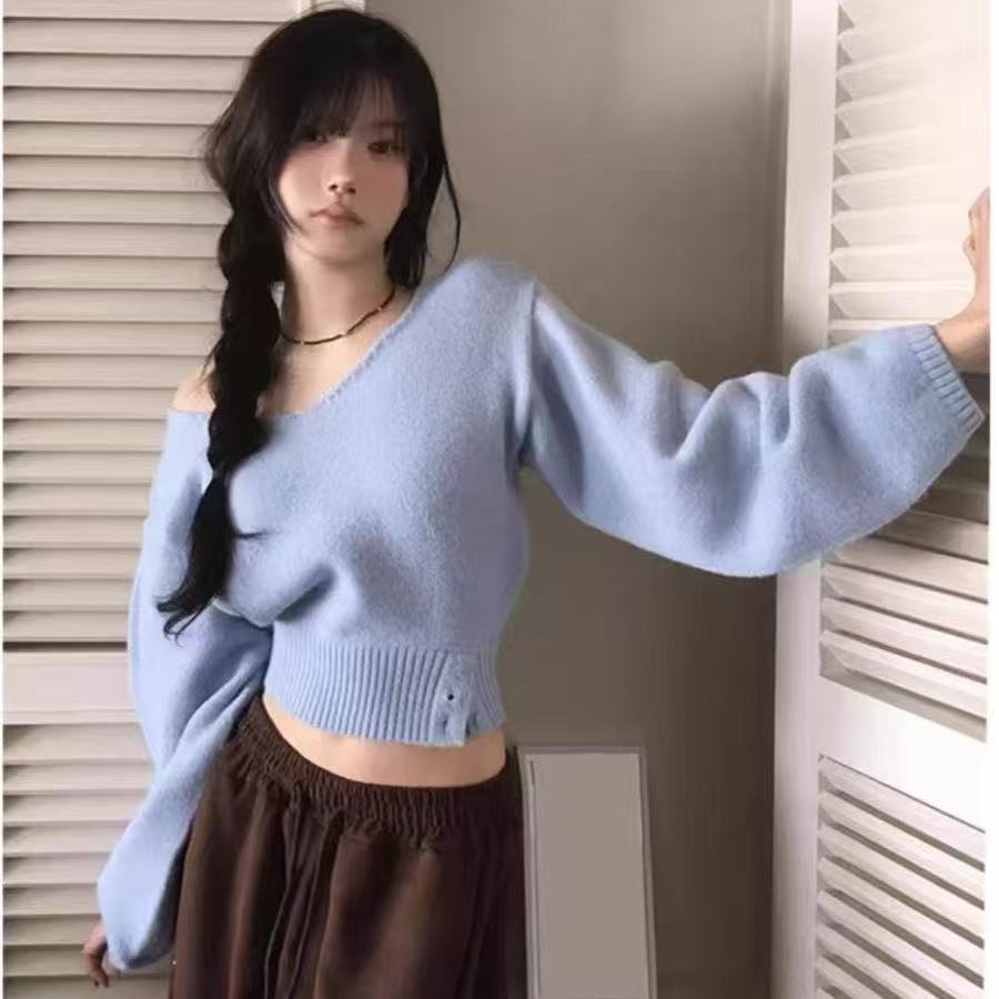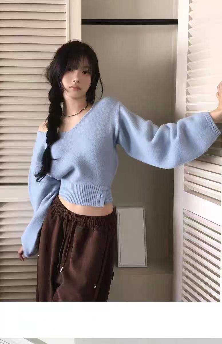 한국 가을 겨울 단색 브이넥 옆단추 허리 조임 슬림핏 우아한 짧은 니트 여성 풀오버 스웨터 한국 스타일스토어 가기