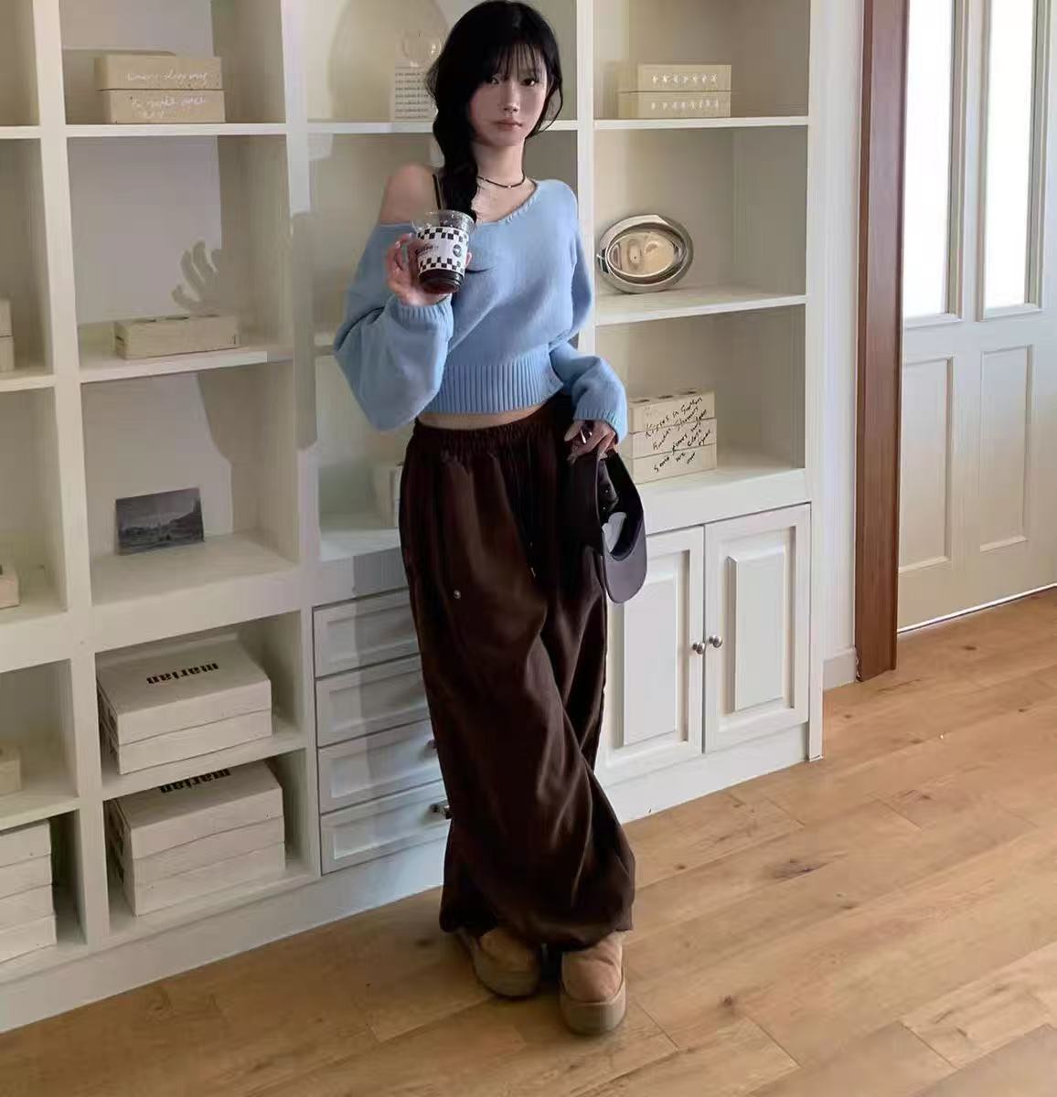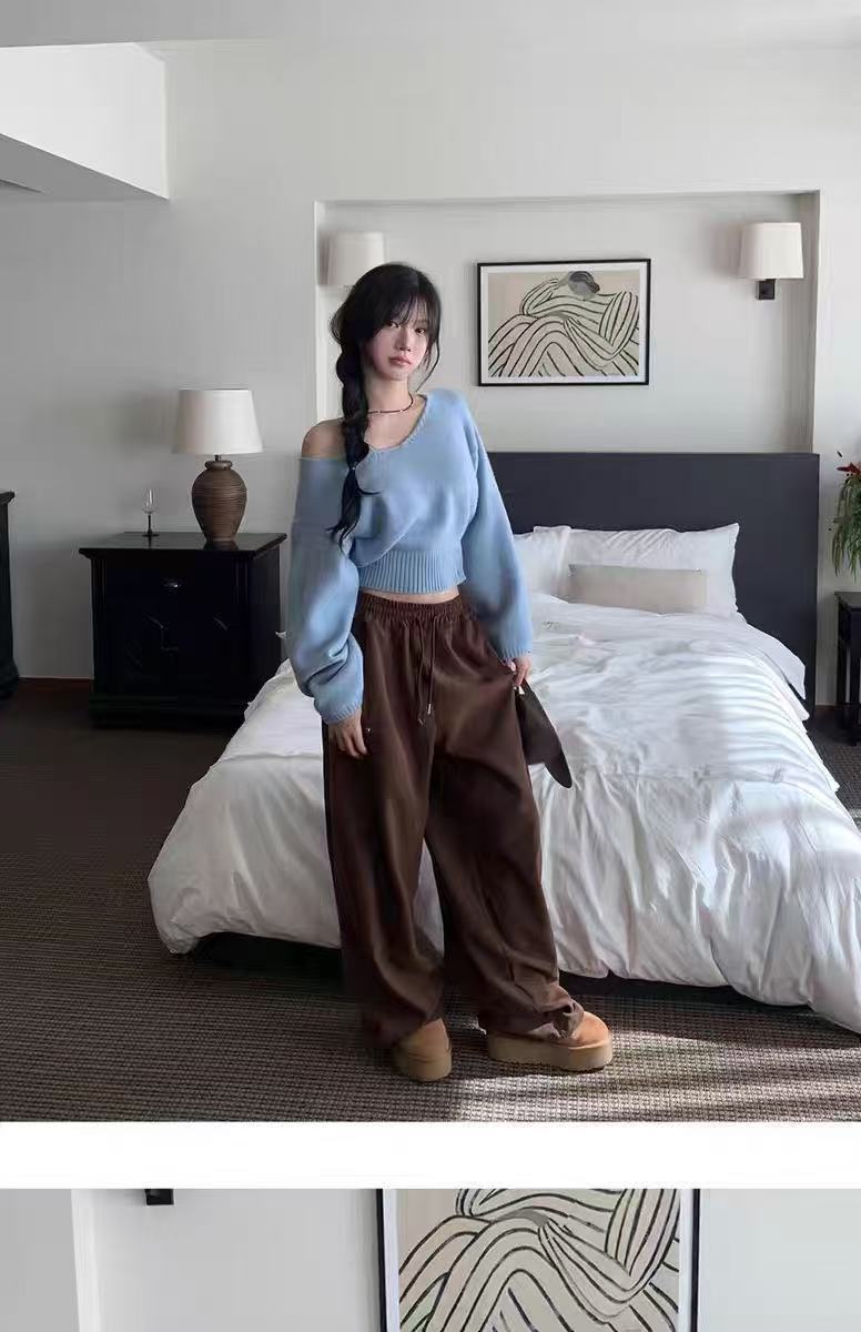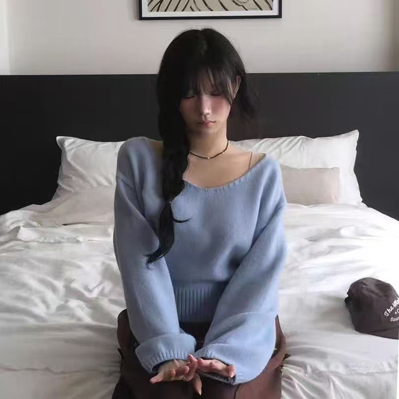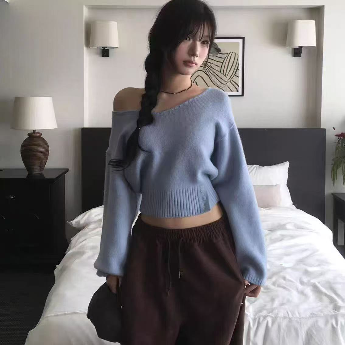 한국 가을 겨울 단색 브이넥 옆단추 허리 조임 슬림핏 우아한 짧은 니트 여성 풀오버 스웨터 한국 스타일스토어 가기