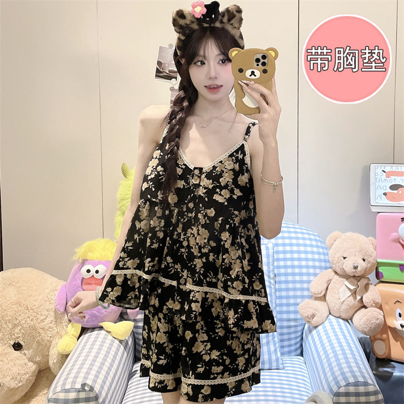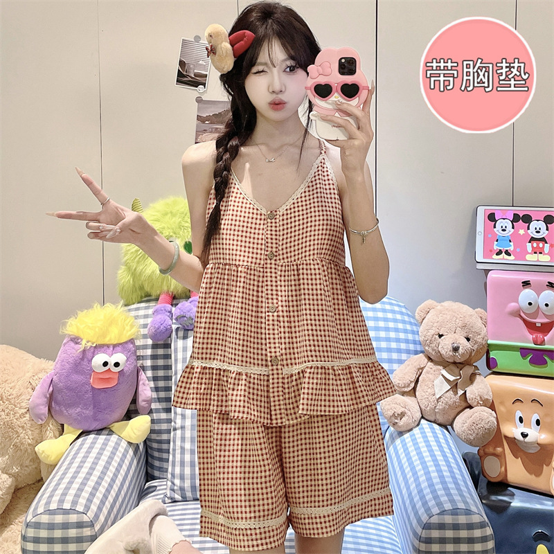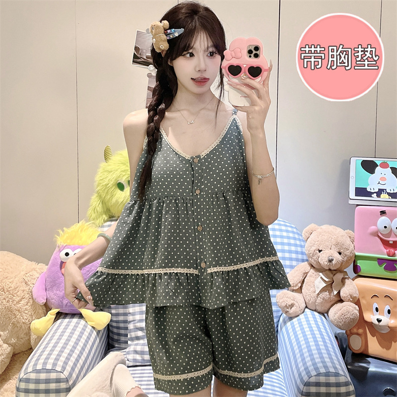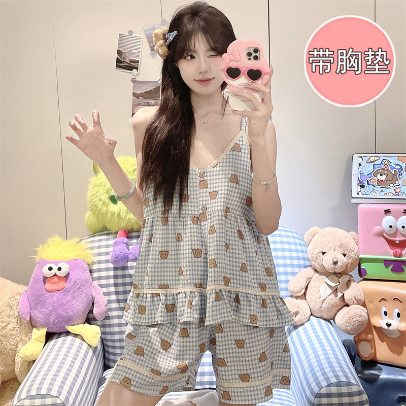 여성용 여름 클라우드 코튼 패딩 잠옷, 달콤하고 상큼한 루즈핏 멜빵 반바지 투피스 세트, 요정 스타일 홈웨어스토어 가기