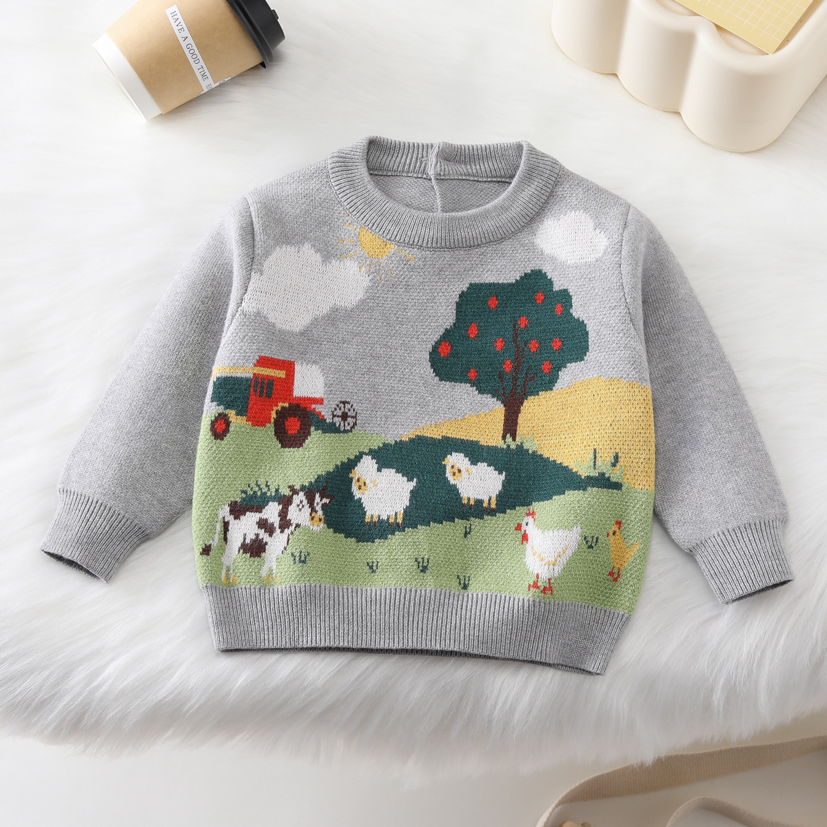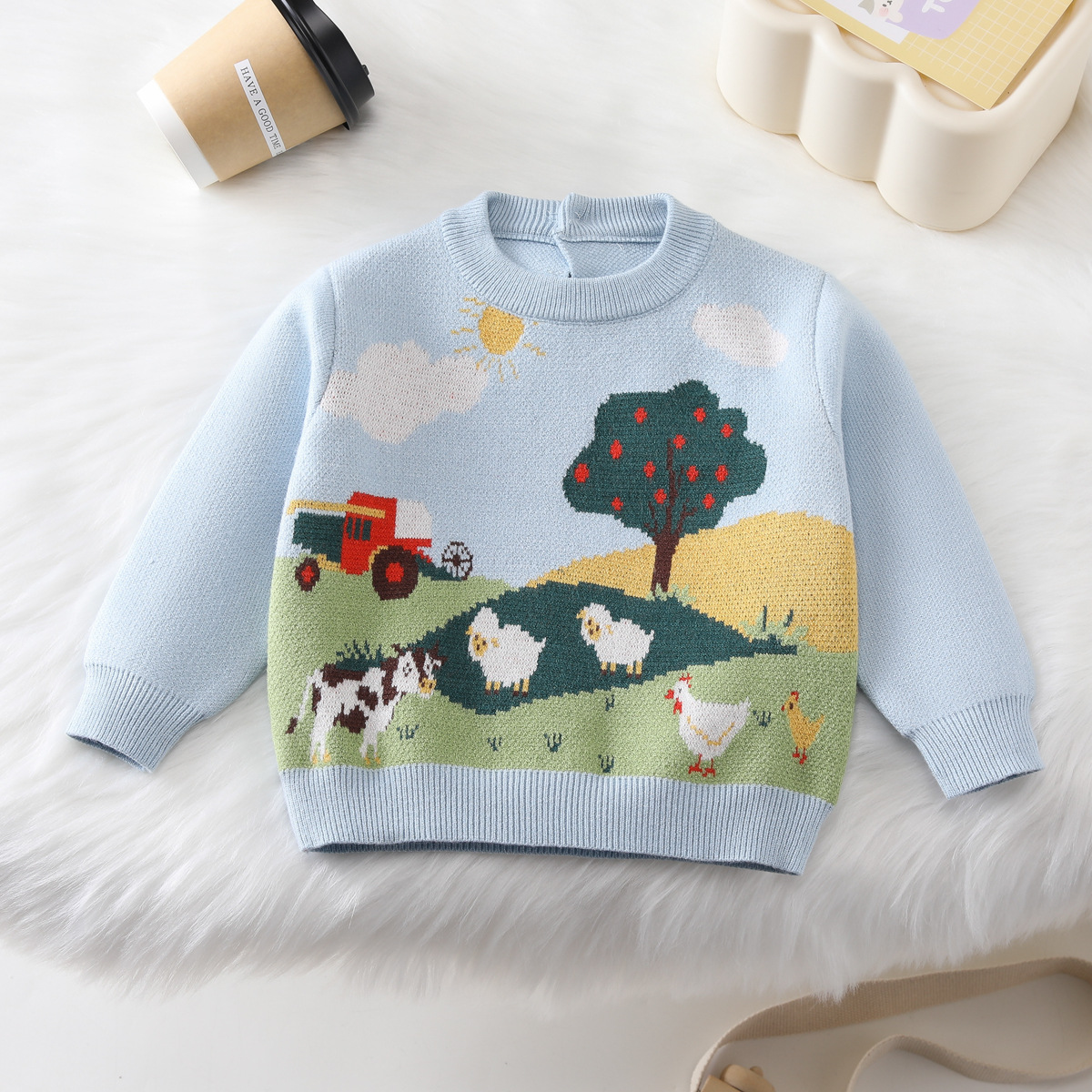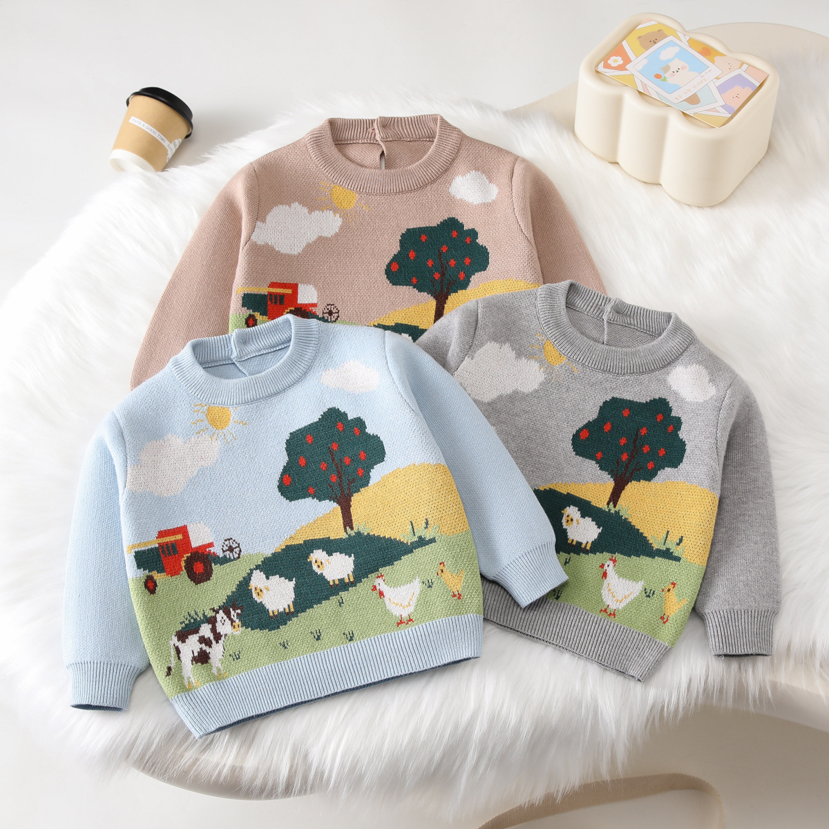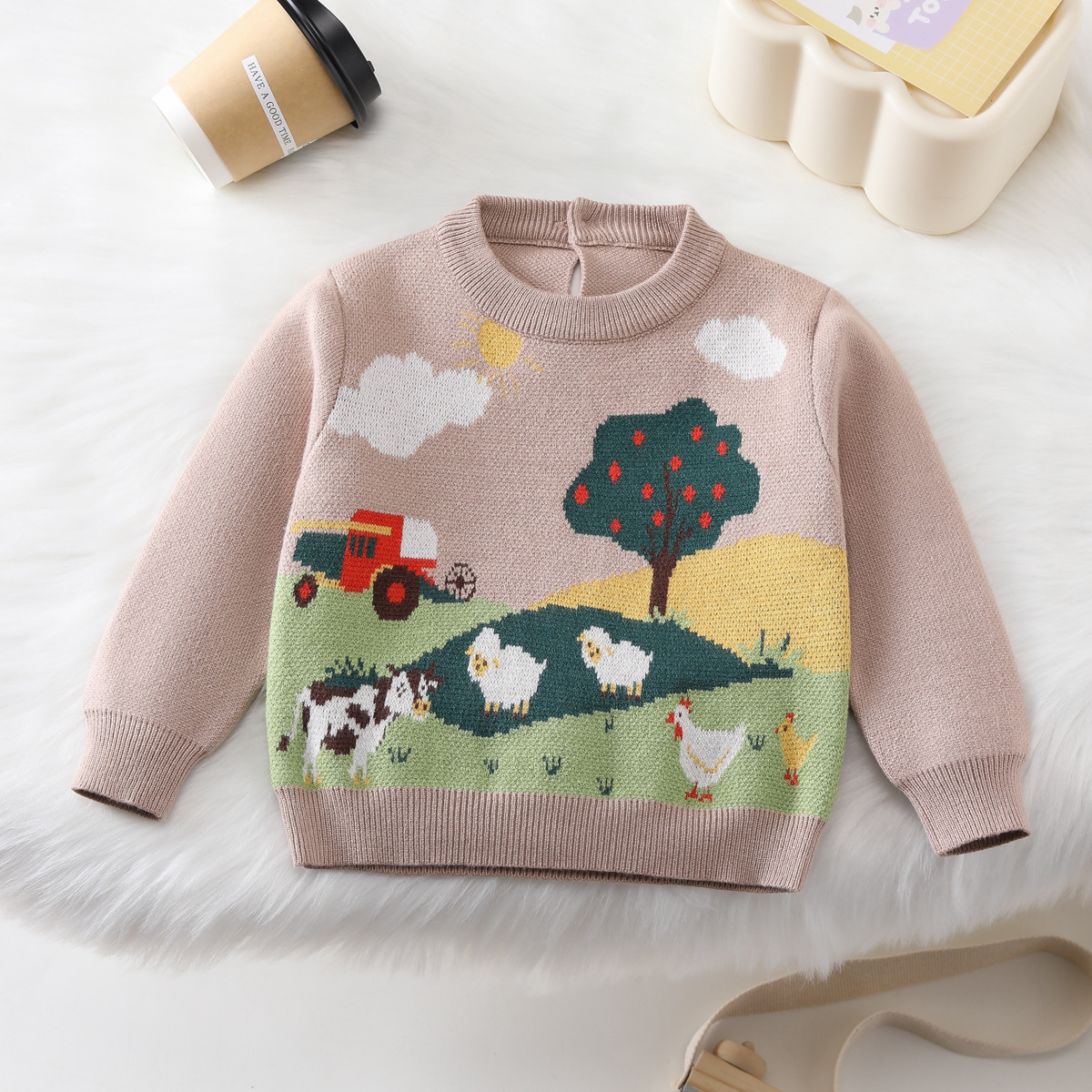 2025 국경 간 폭발 소년 소녀 아기 둥근 목 긴팔 스웨터 자연 만화 동물 자카드 풀오버 스웨터