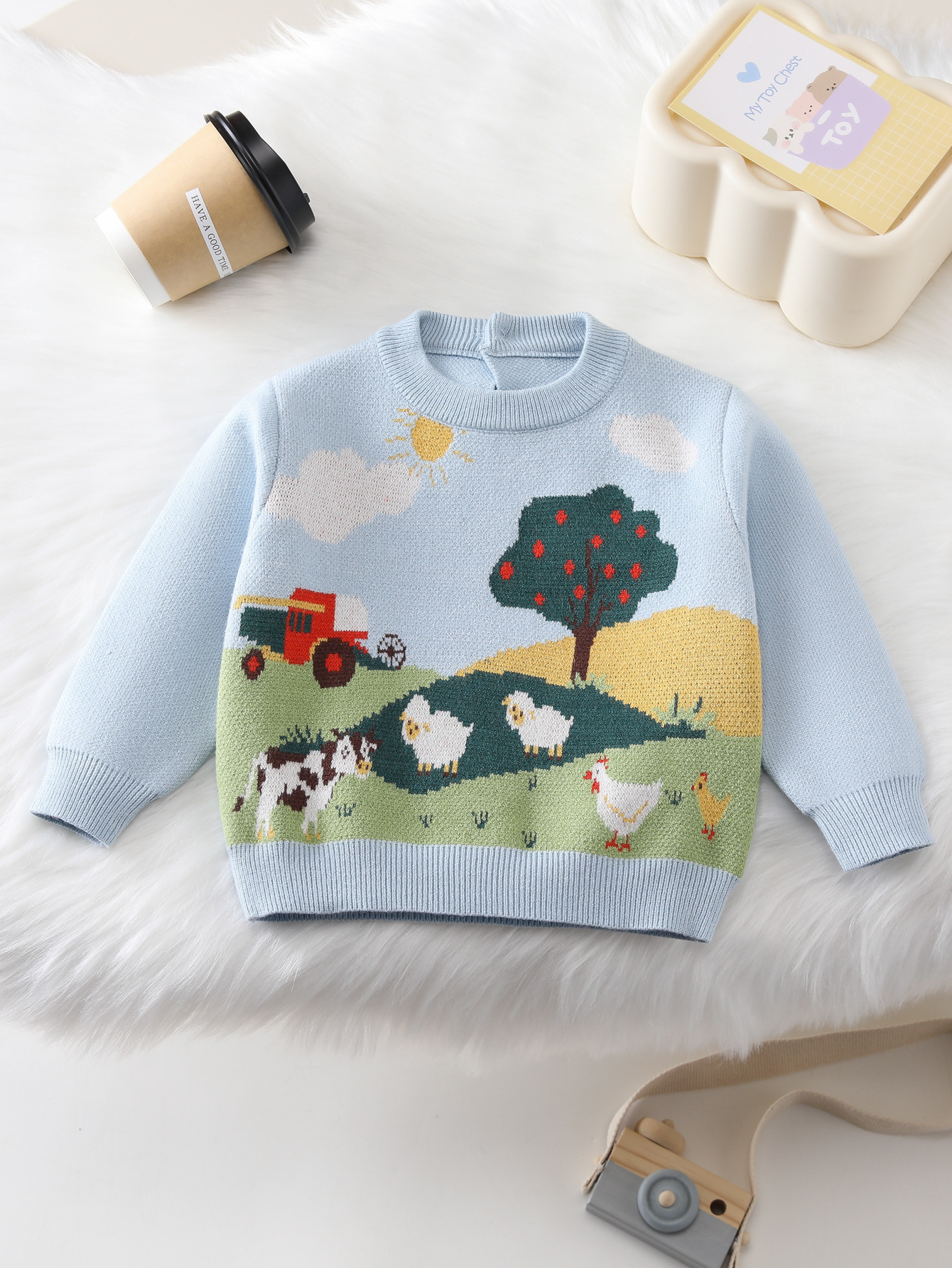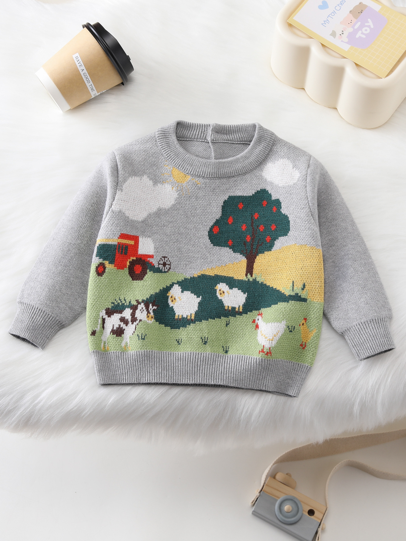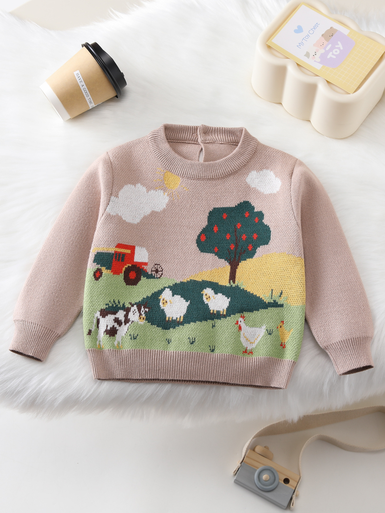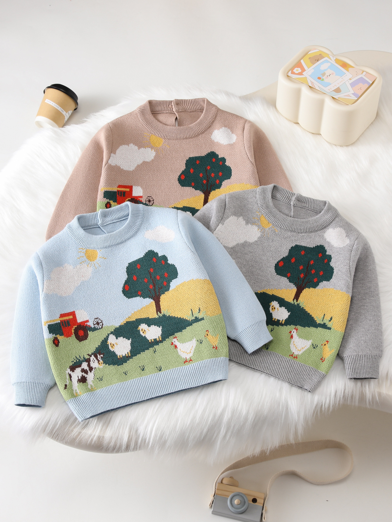 2025 국경 간 폭발 소년 소녀 아기 둥근 목 긴팔 스웨터 자연 만화 동물 자카드 풀오버 스웨터