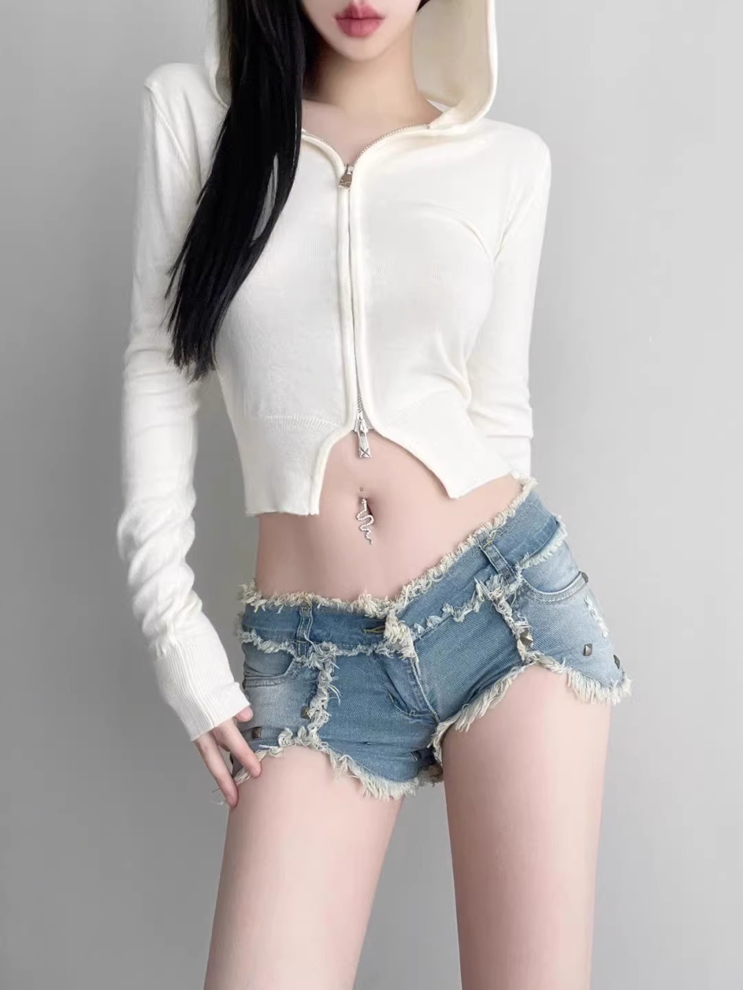 미국 스타일의 뜨거운 소녀 낮은 허리 디자인 감각 데님 반바지 여성의 가을 꽉 엉덩이 포장 뜨거운 바지 유럽 스트레이트 바지