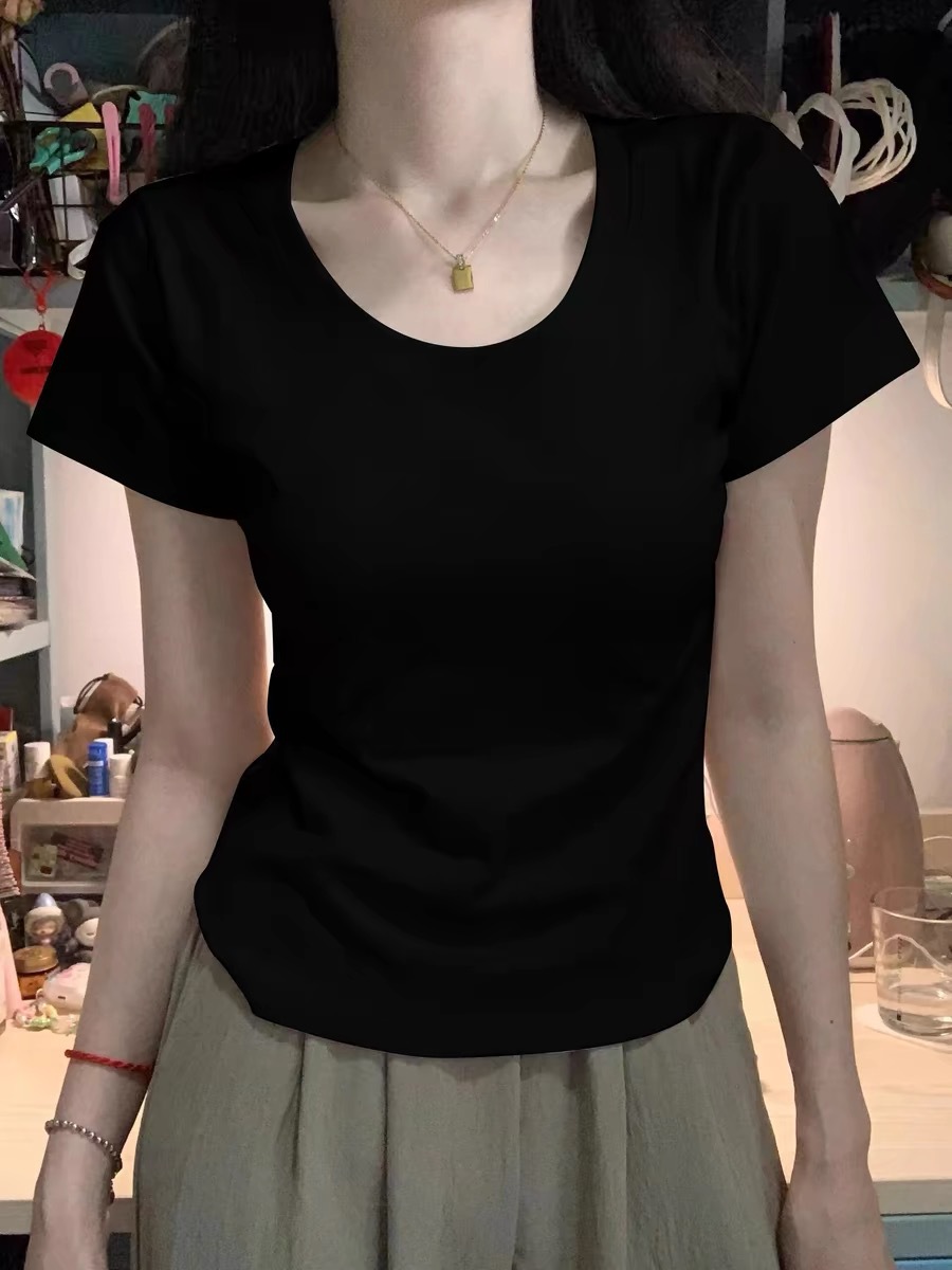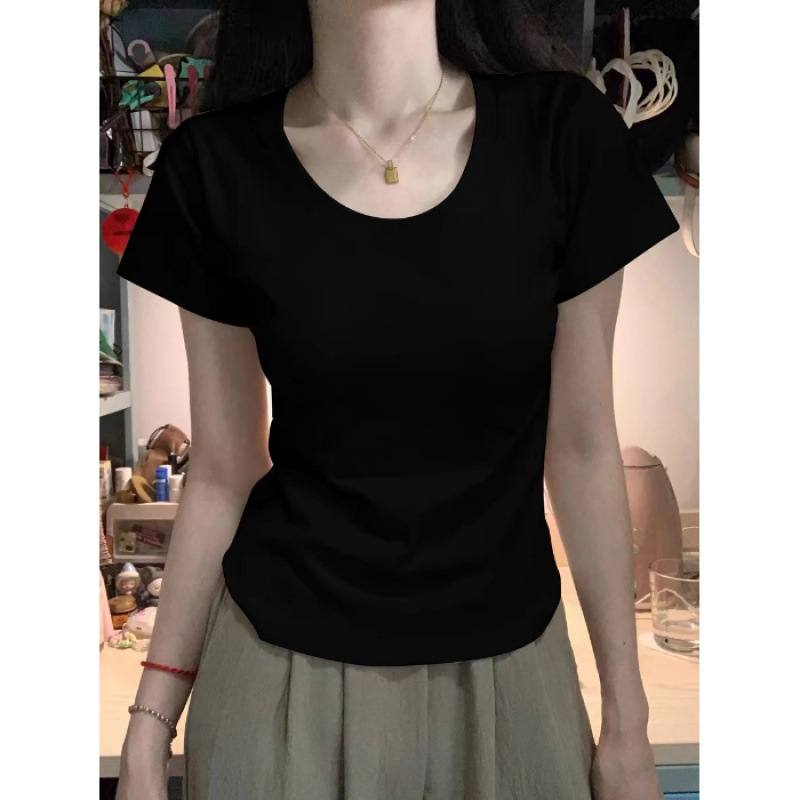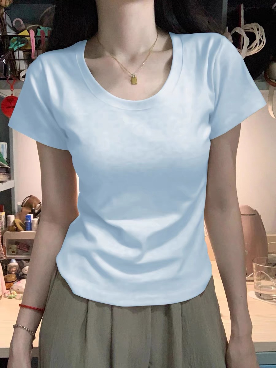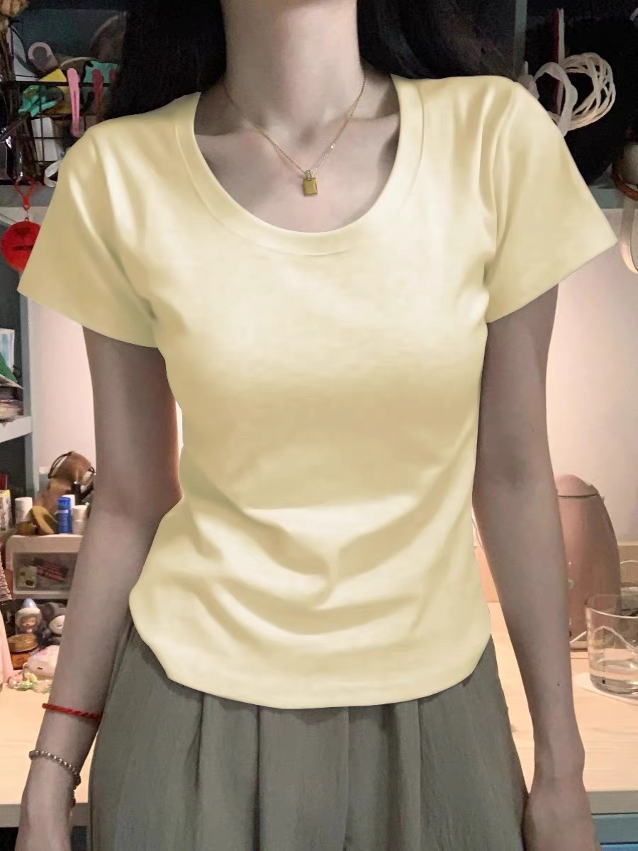 크림 옐로우 디자인 센스 숄더 퓨어 코튼 U-칼라 반팔 티셔츠 여성의 2025 년 여름 핫 걸 짧은 슬림 핏 허리 탑스토어 가기
