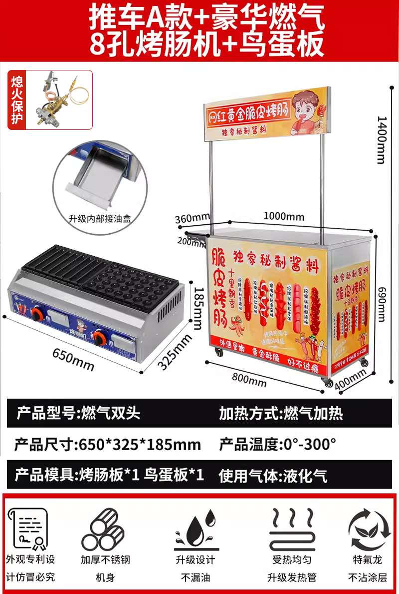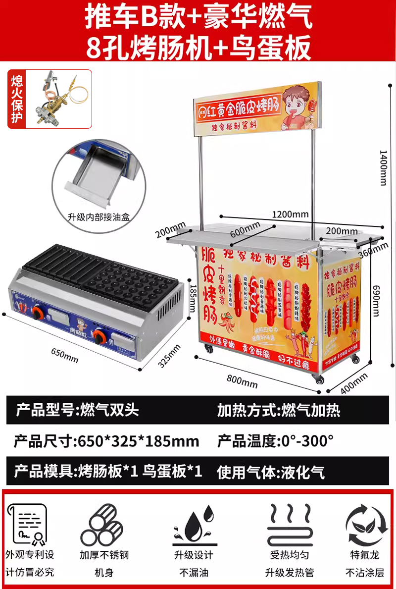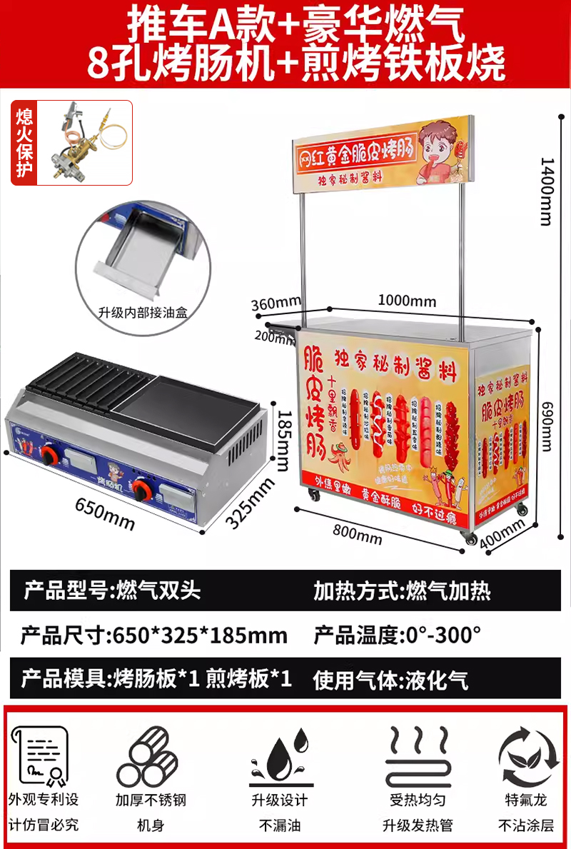 • 업그레이드된 [접이식 A형 카트] 가스 8구 소시지 그릴 + 철판구이|화염정지 보호