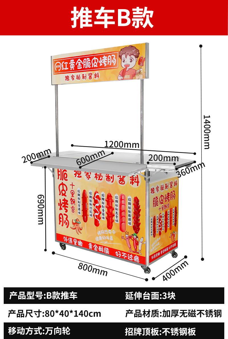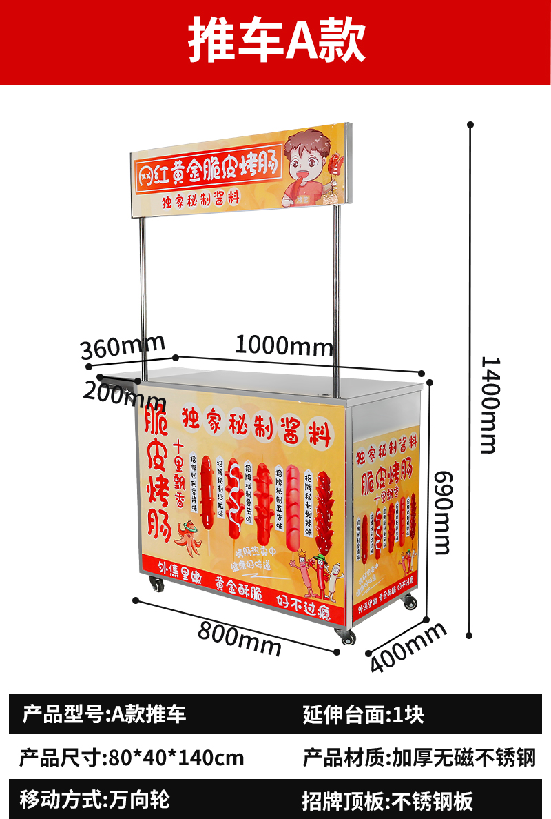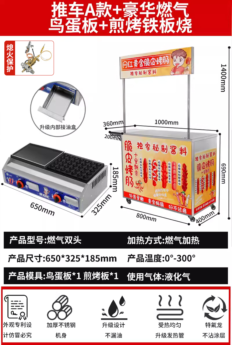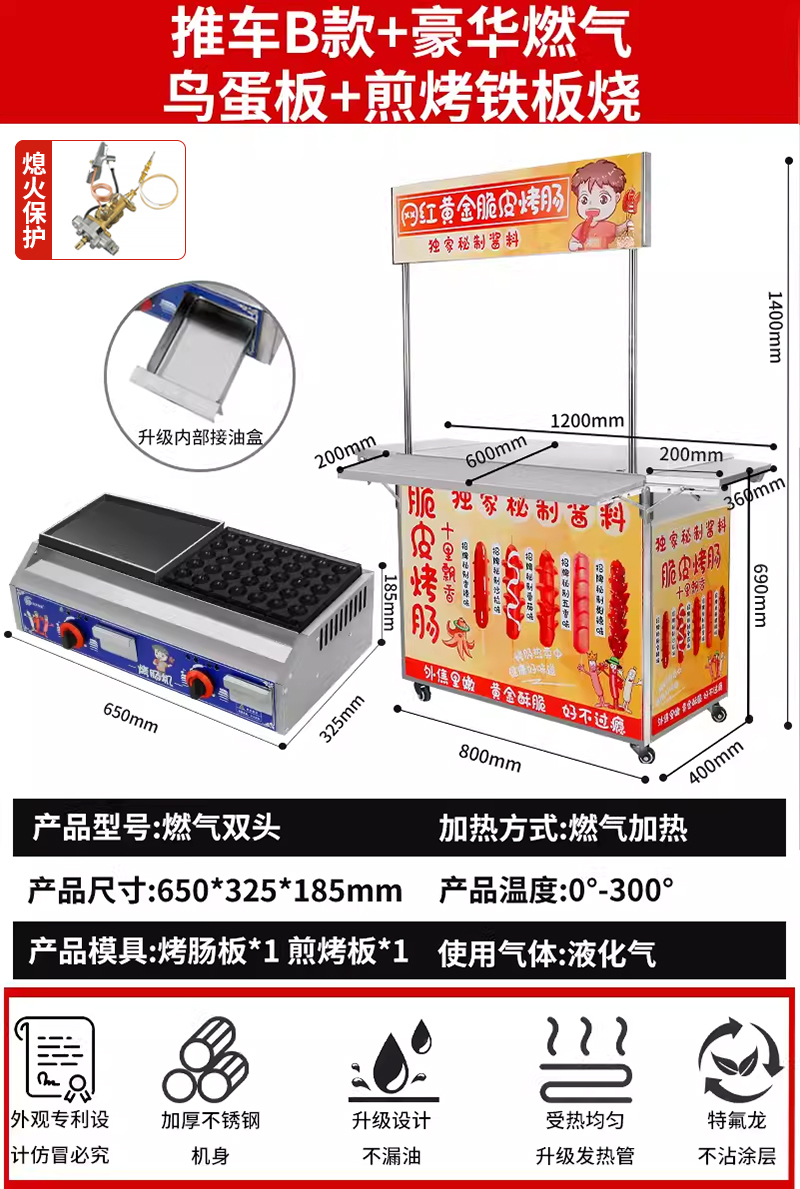 • 업그레이드된 [접이식 A형 카트] 가스 8구 소시지 그릴 + 철판구이|화염정지 보호
