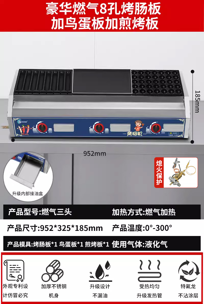• 3가지 컨트롤 [가스모델 > 8구 소시지 그릴] + 새알판 + 철판구이|화염정지 보호