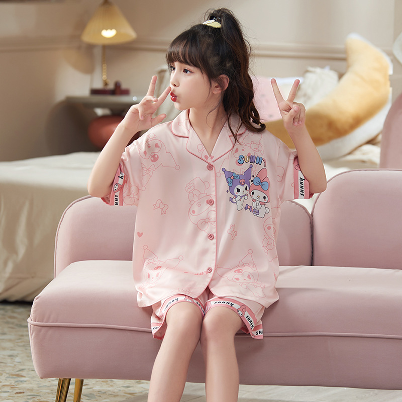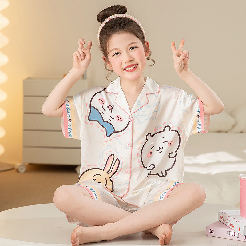새로운 어린이 아이스 실크 잠옷 소녀 여름 반팔 얇은 귀여운 홈 옷 아기의 큰 어린이 소녀 세트