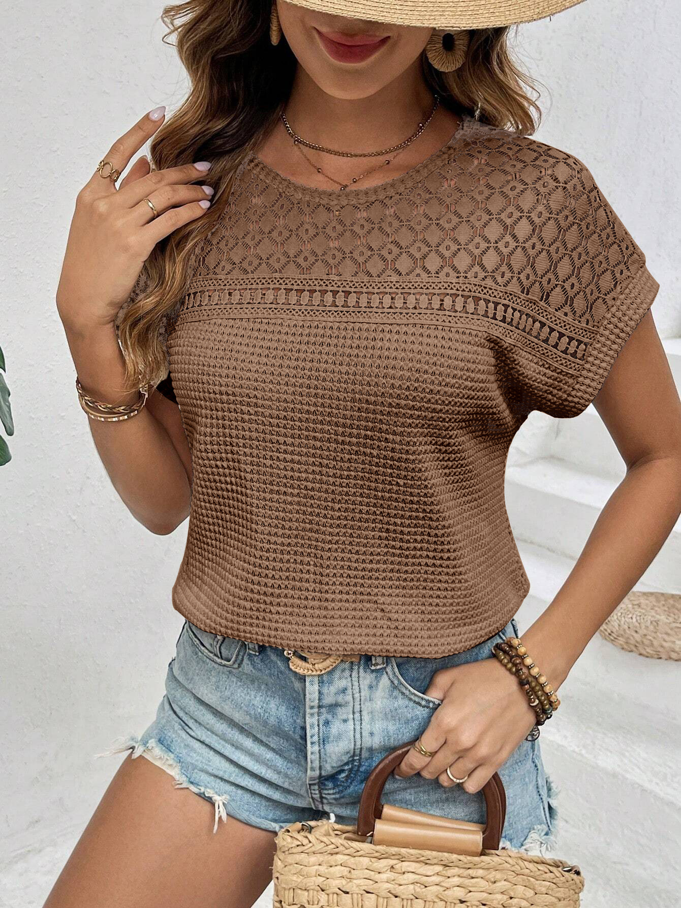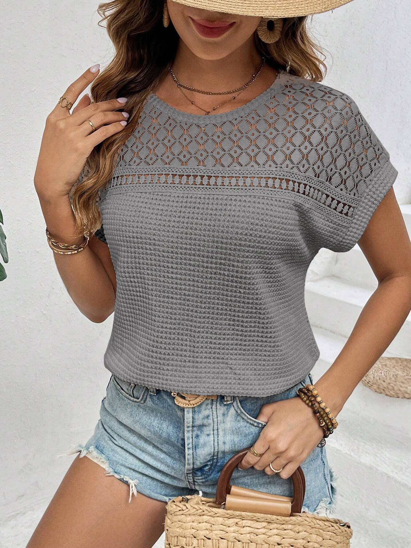2025 유럽과 미국 아마존 국경 여자 여름 새 탑 어깨 네트 할로우 레이스 올 매치 반팔 티셔츠