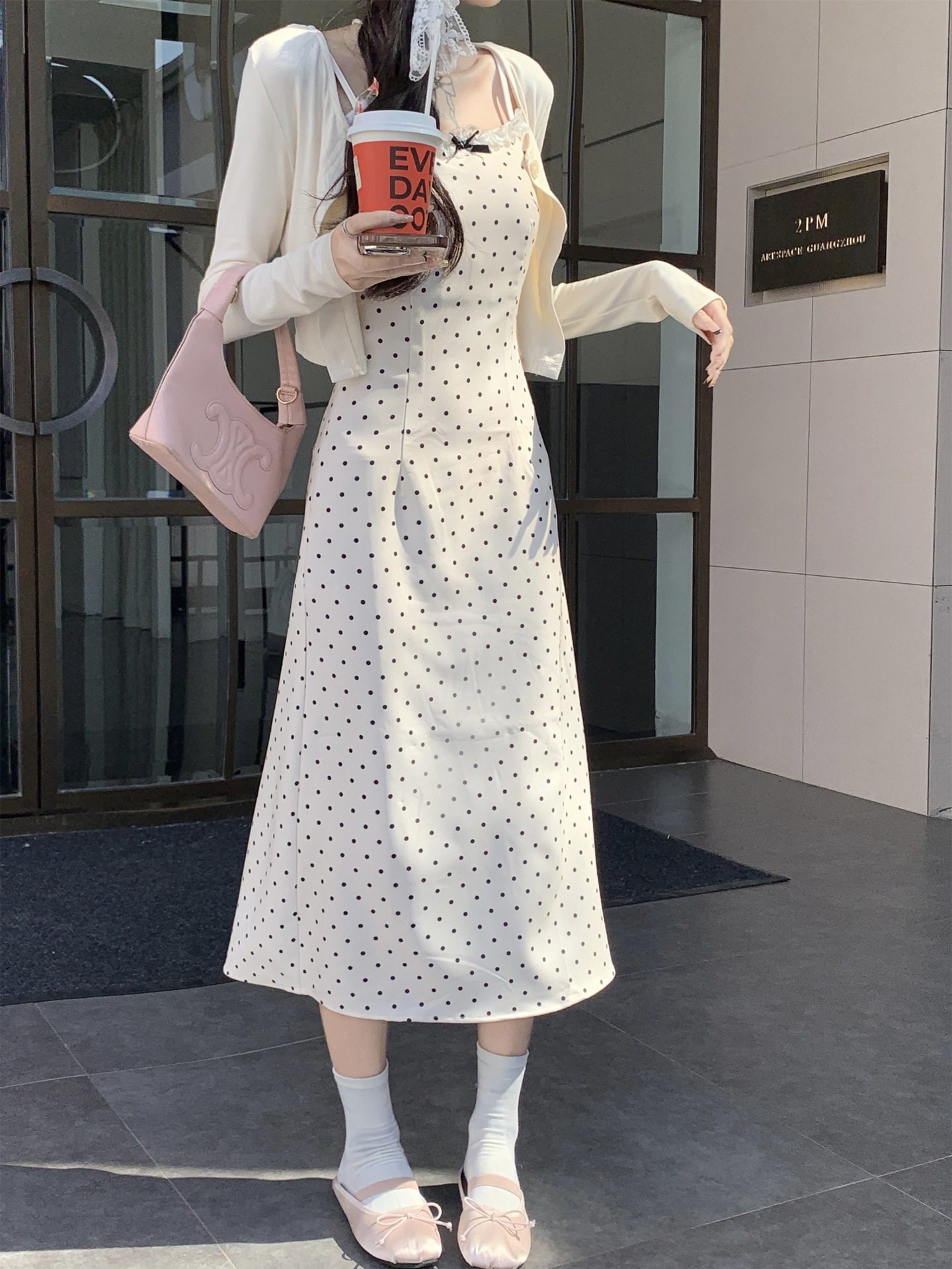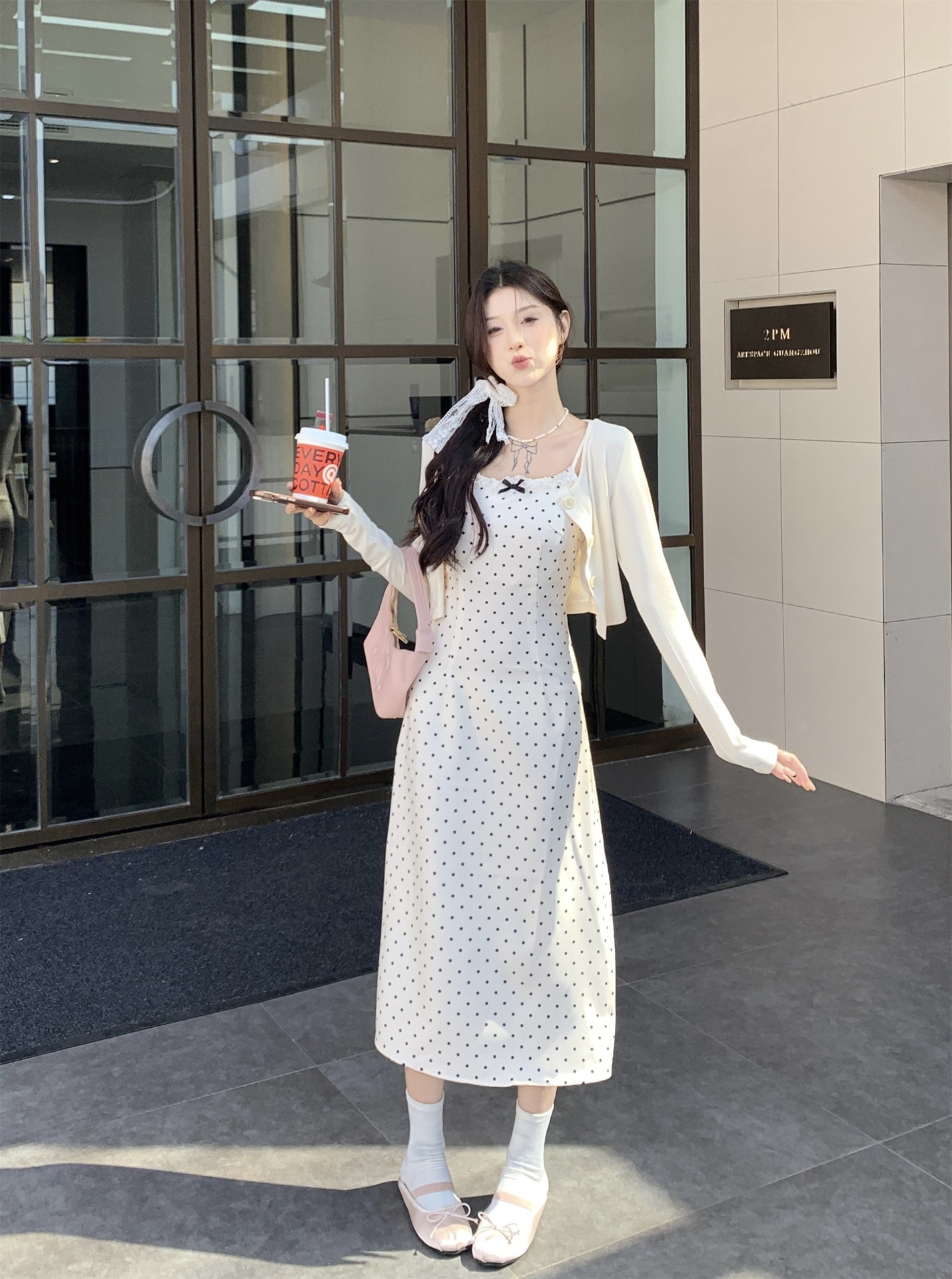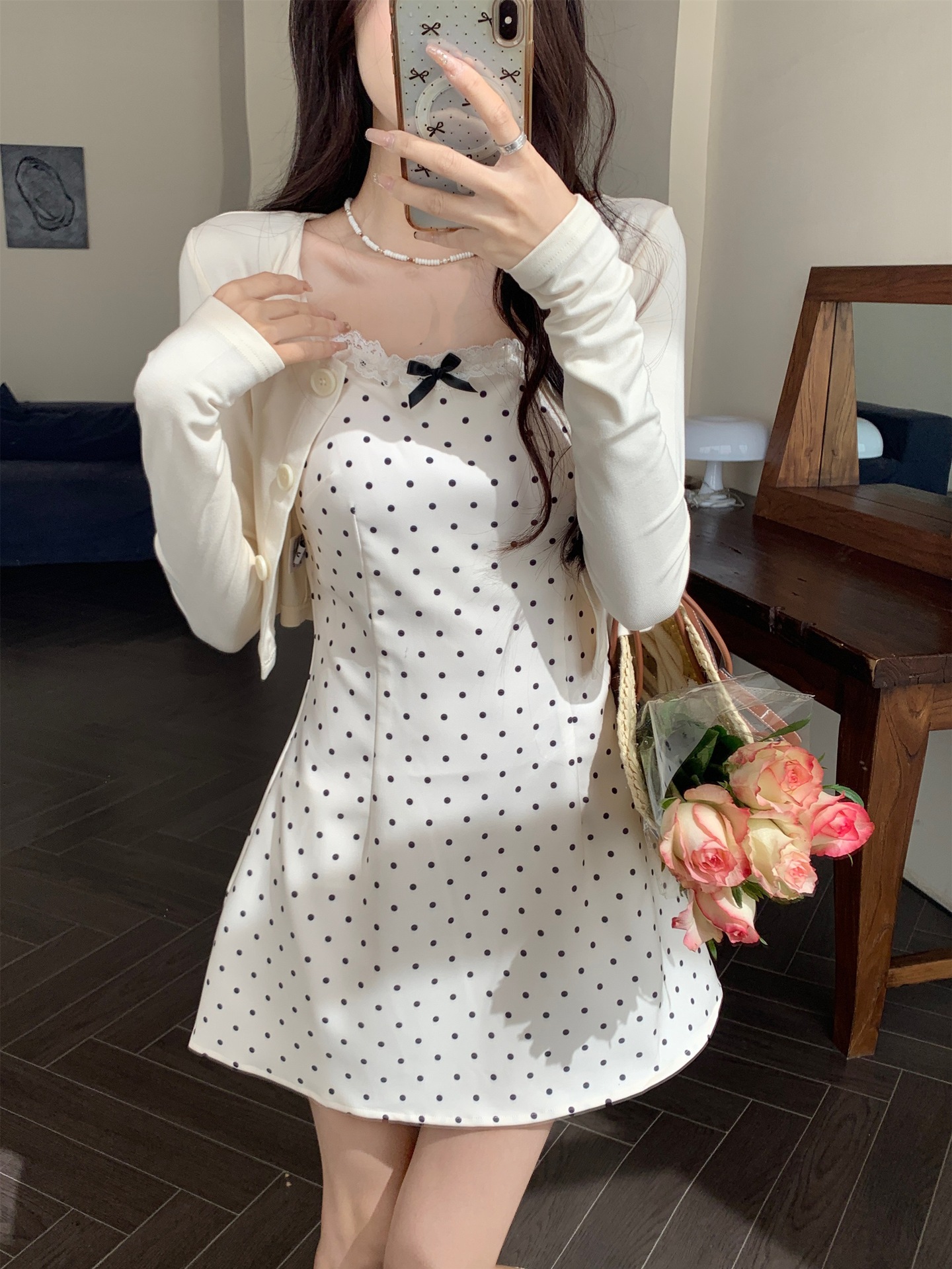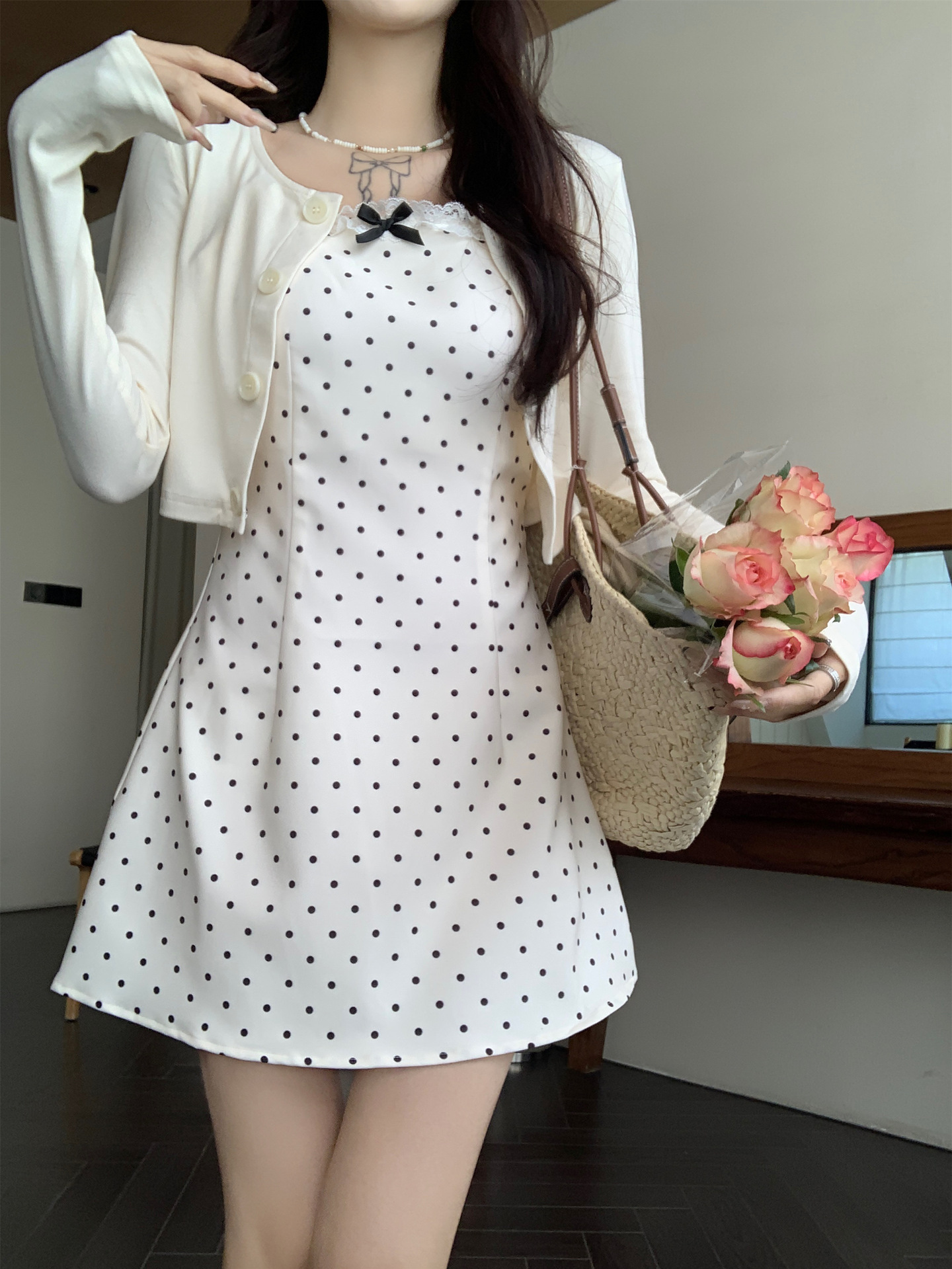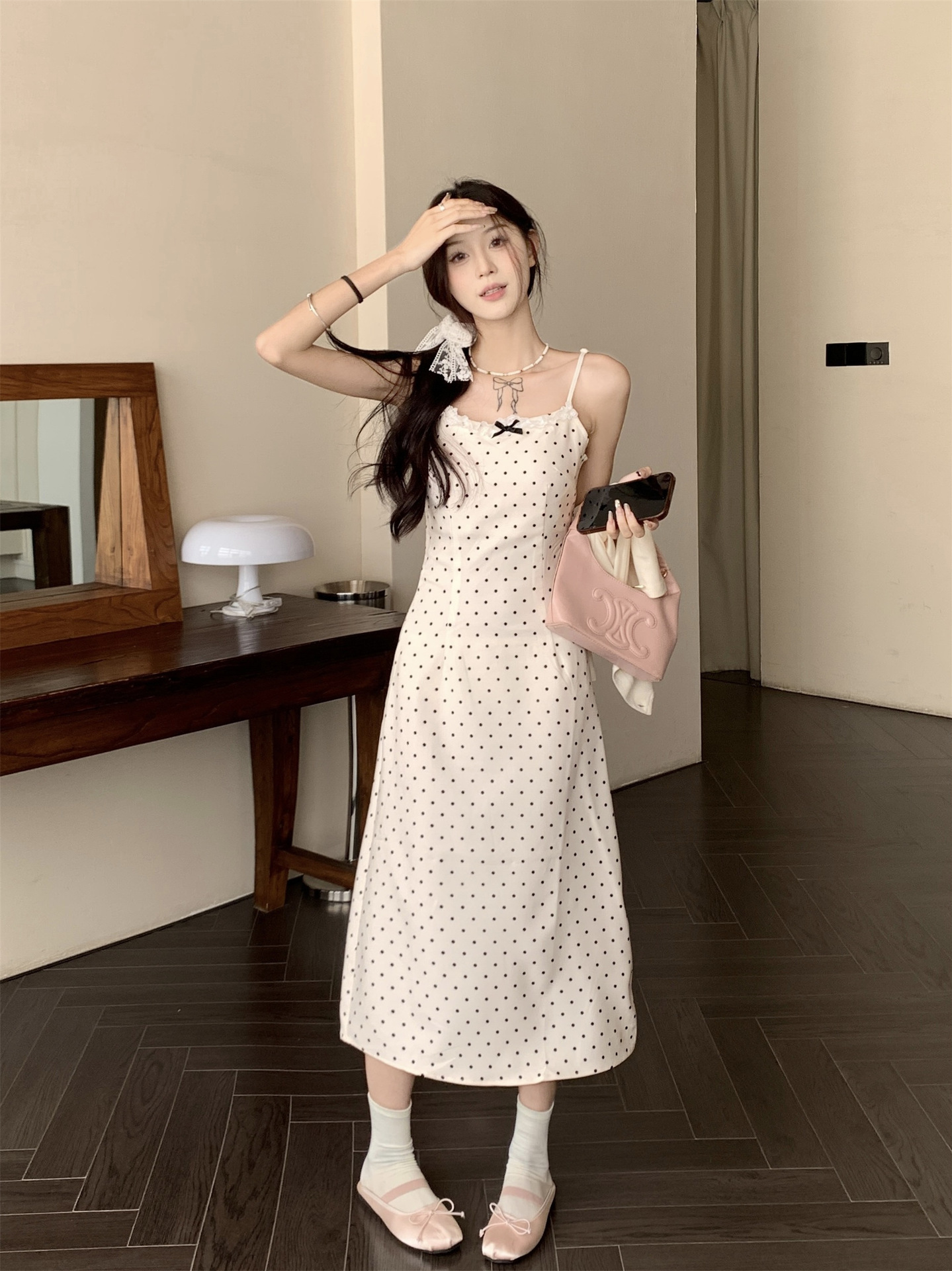 한국 스타일 활 폴로 도트 슬링 원피스 여자 봄 2025 새로운 꽉 허리 A 라인 슬리밍 짧은 치마스토어 가기