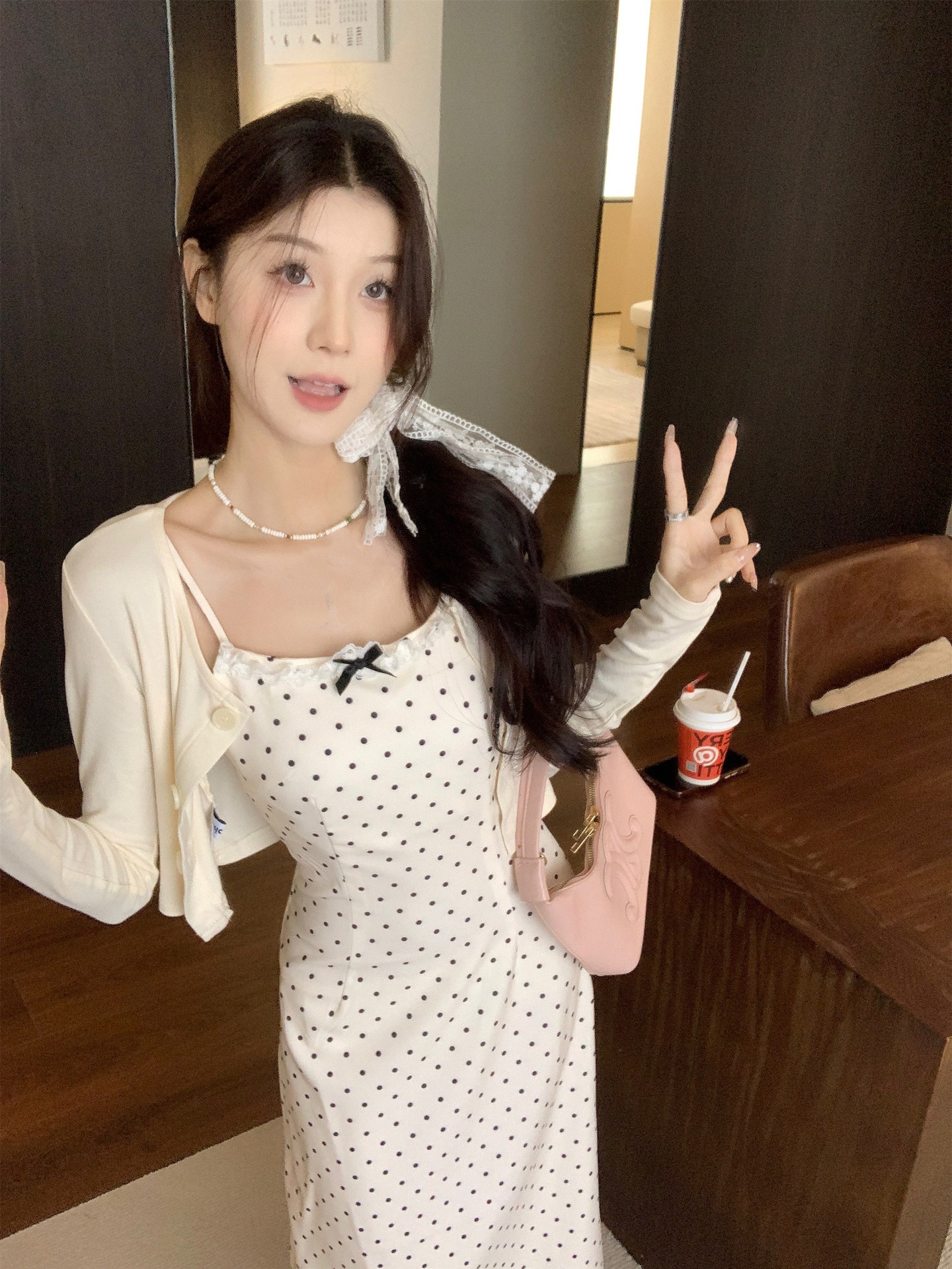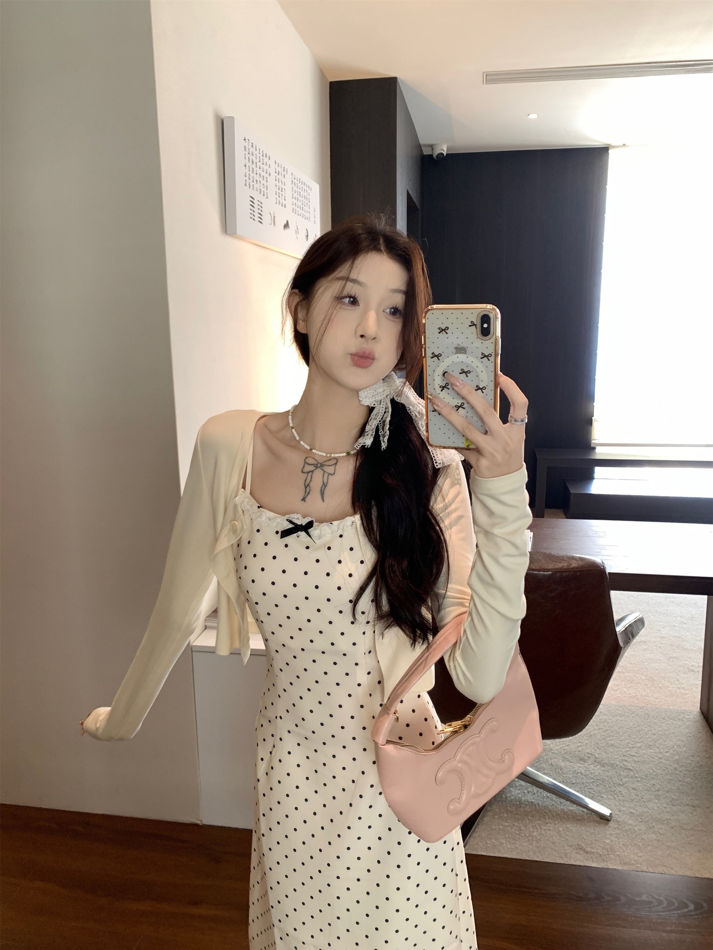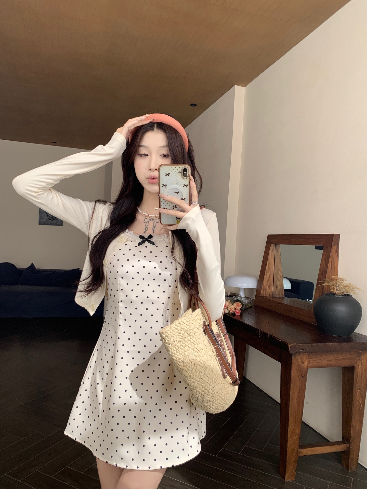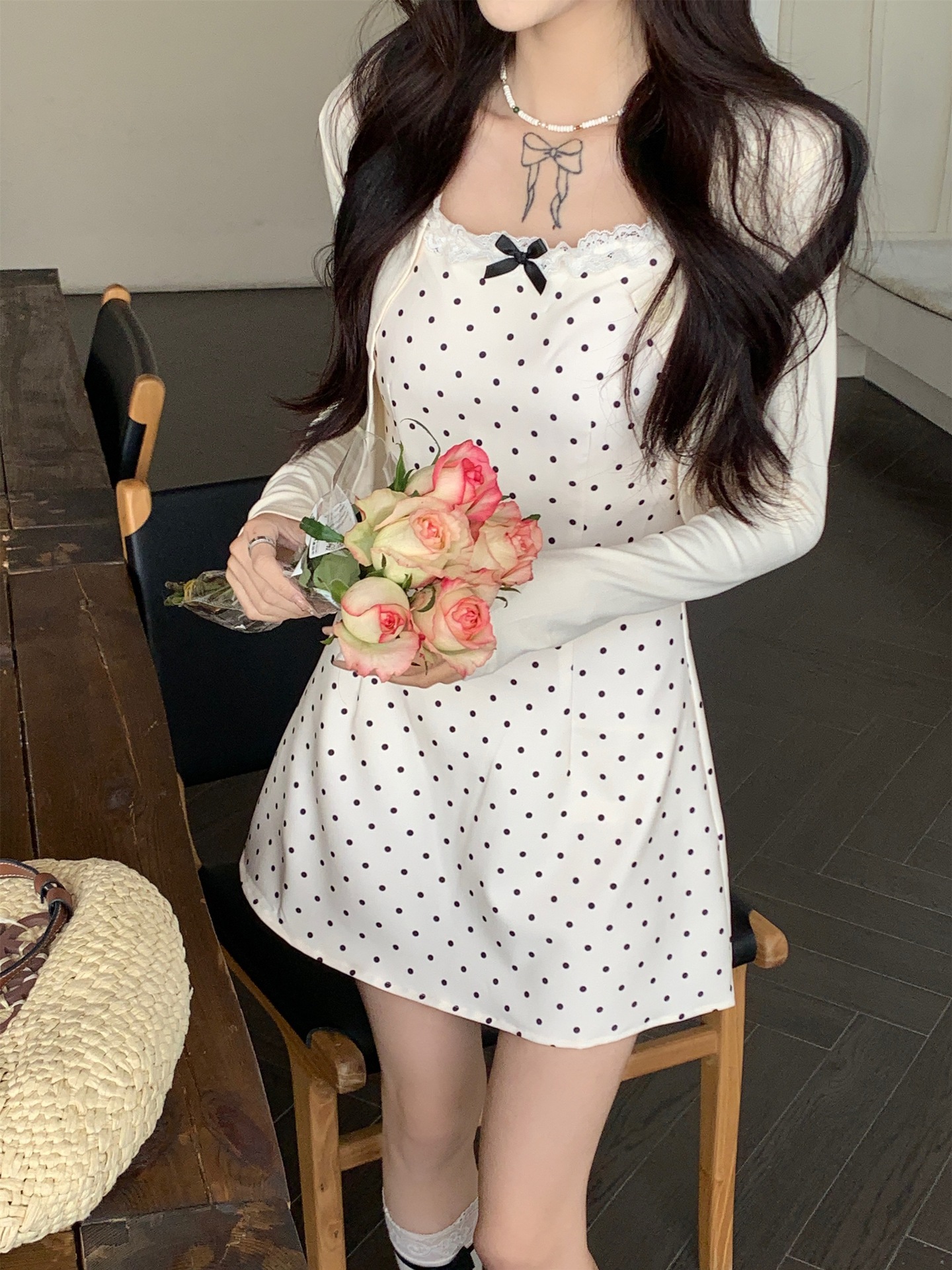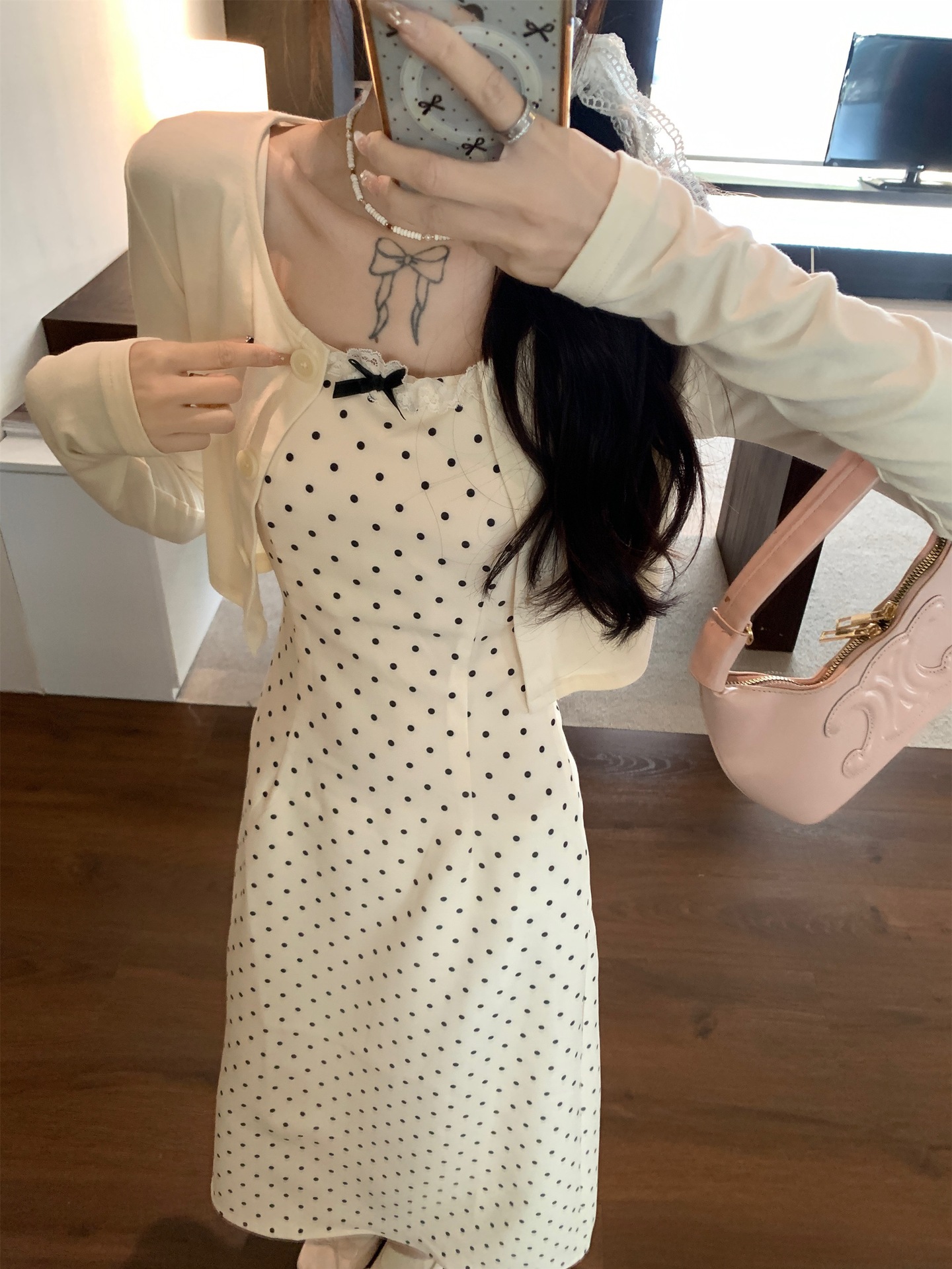 한국 스타일 활 폴로 도트 슬링 원피스 여자 봄 2025 새로운 꽉 허리 A 라인 슬리밍 짧은 치마스토어 가기