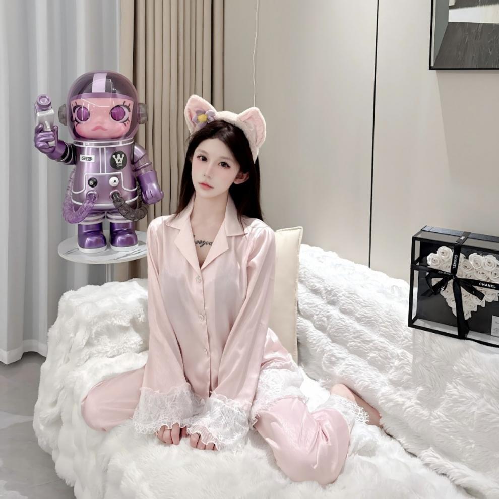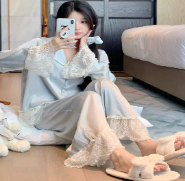 프랑스 잠옷 여성용 긴 소매 바지 달콤한 공주 스타일 아이스 실크 세트 가을 잠옷 홈 의류 누에 실크스토어 가기