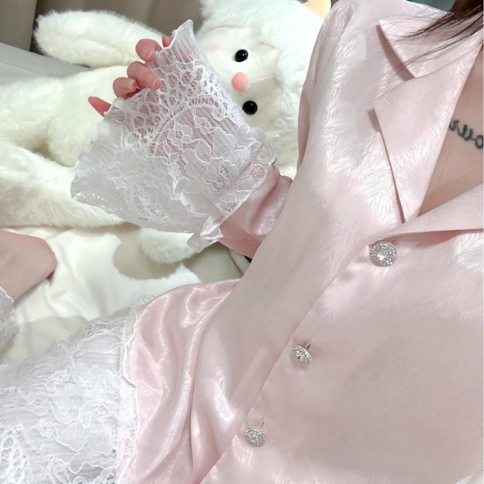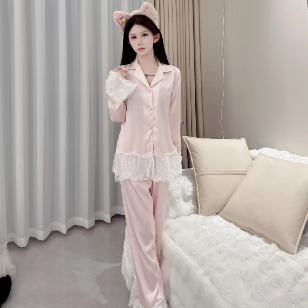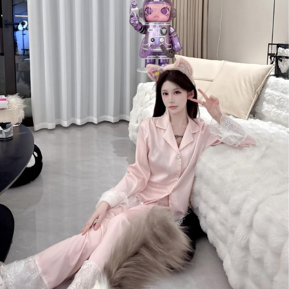 프랑스 잠옷 여성용 긴 소매 바지 달콤한 공주 스타일 아이스 실크 세트 가을 잠옷 홈 의류 누에 실크