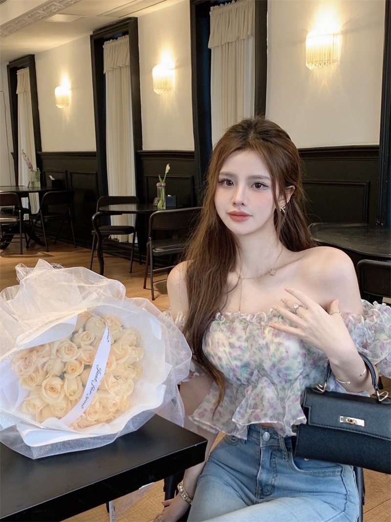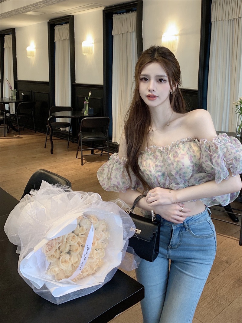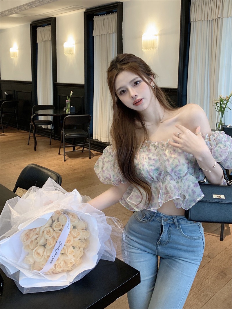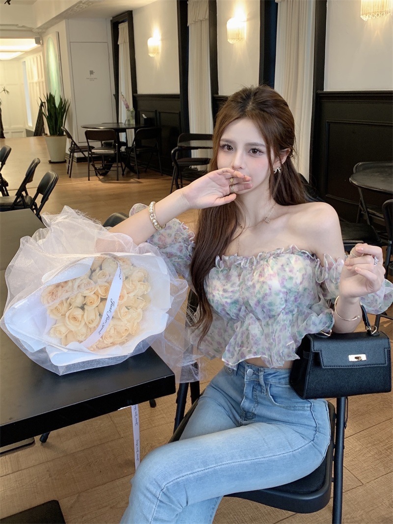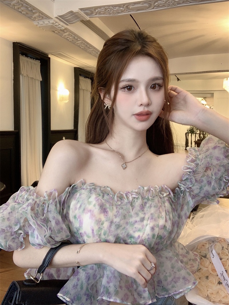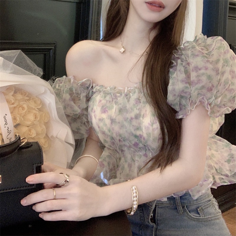 프랑스 스타일 달콤한 꽃 쉬폰 셔츠 여성용 여름 순수한 욕망 스파이스 소녀 짧은 세련된 탑 버블 슬리브와 오프 숄더스토어 가기