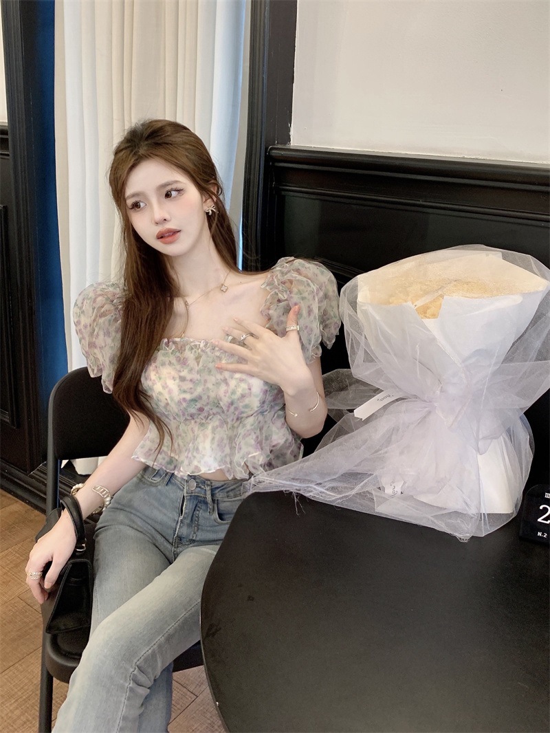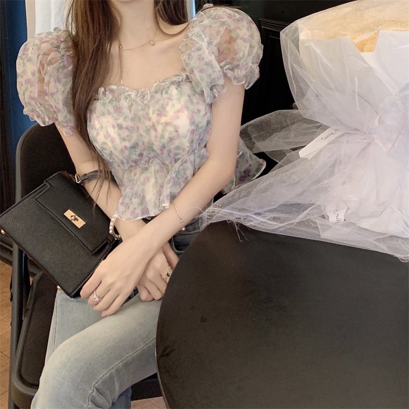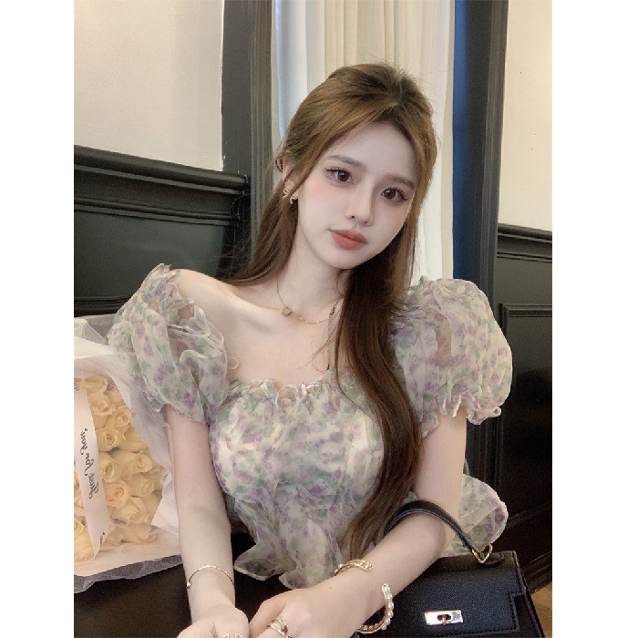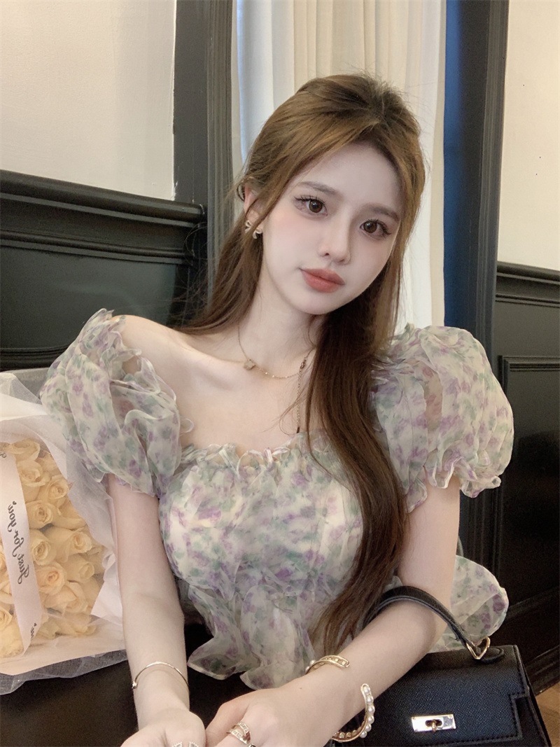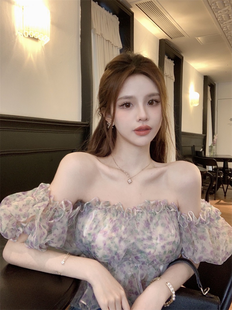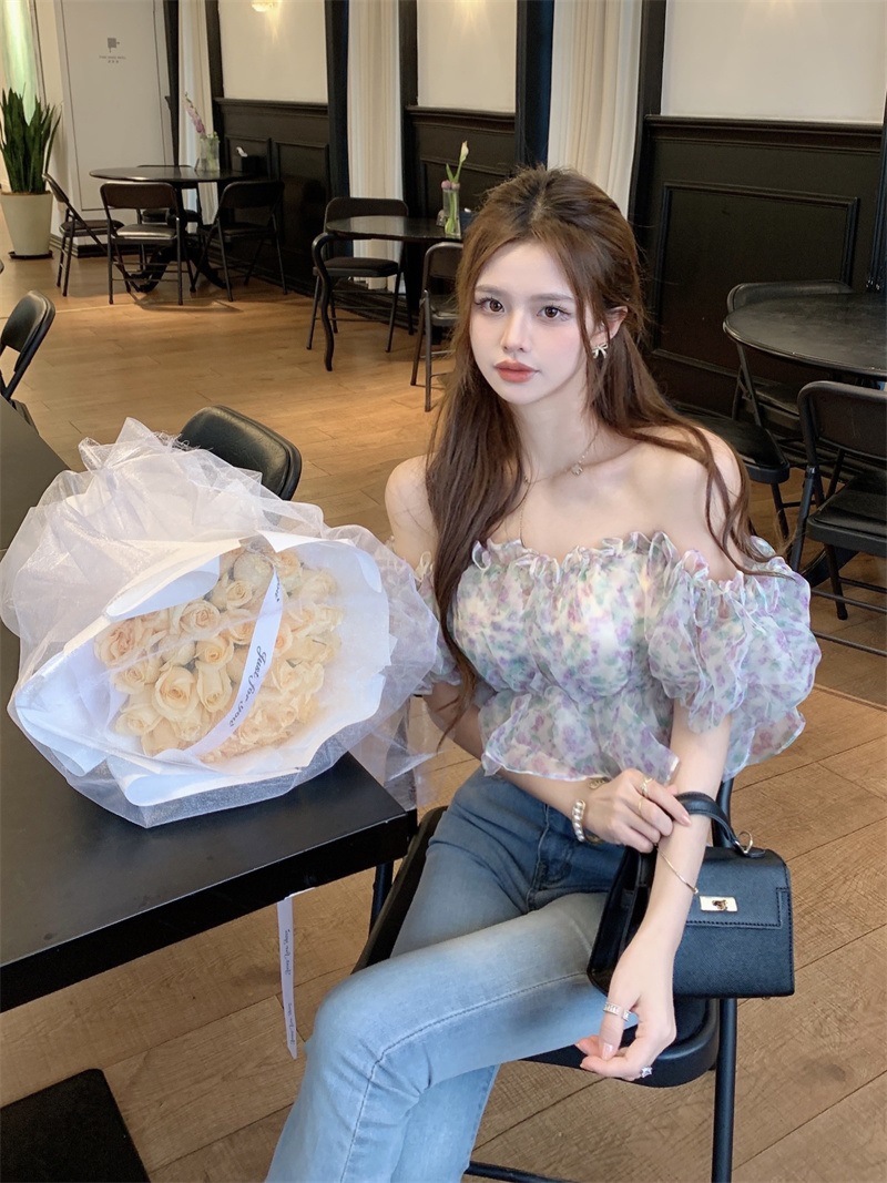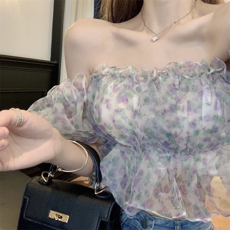 프랑스 스타일 달콤한 꽃 쉬폰 셔츠 여성용 여름 순수한 욕망 스파이스 소녀 짧은 세련된 탑 버블 슬리브와 오프 숄더스토어 가기