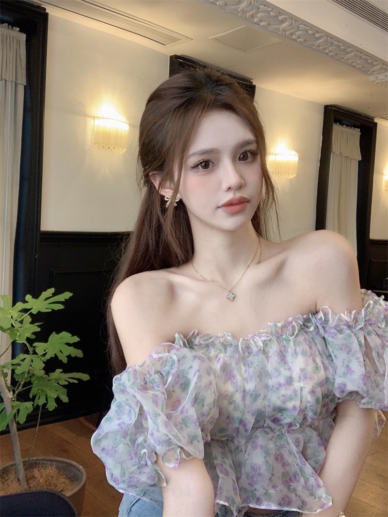 프랑스 스타일 달콤한 꽃 쉬폰 셔츠 여성용 여름 순수한 욕망 스파이스 소녀 짧은 세련된 탑 버블 슬리브와 오프 숄더