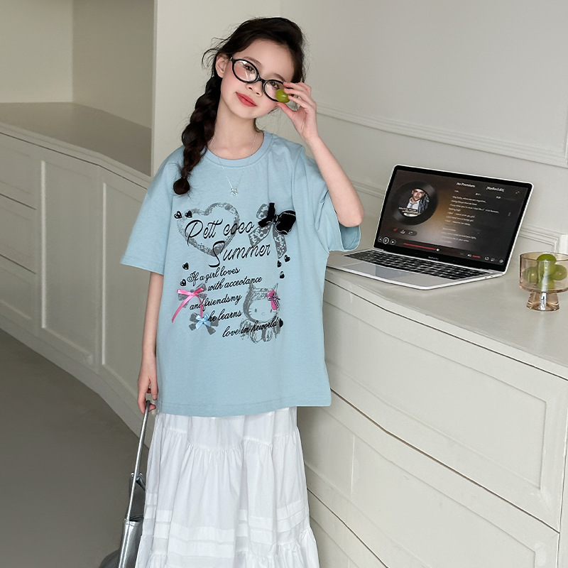 소녀 여름 티셔츠 2025 새로운 스타일 중대형 어린이 유행 우아한 편지 활 반팔 메쉬 원피스스토어 가기