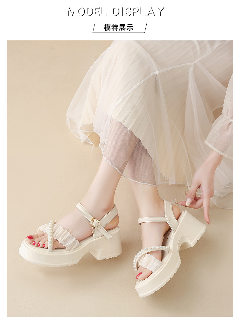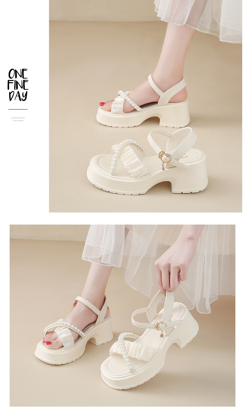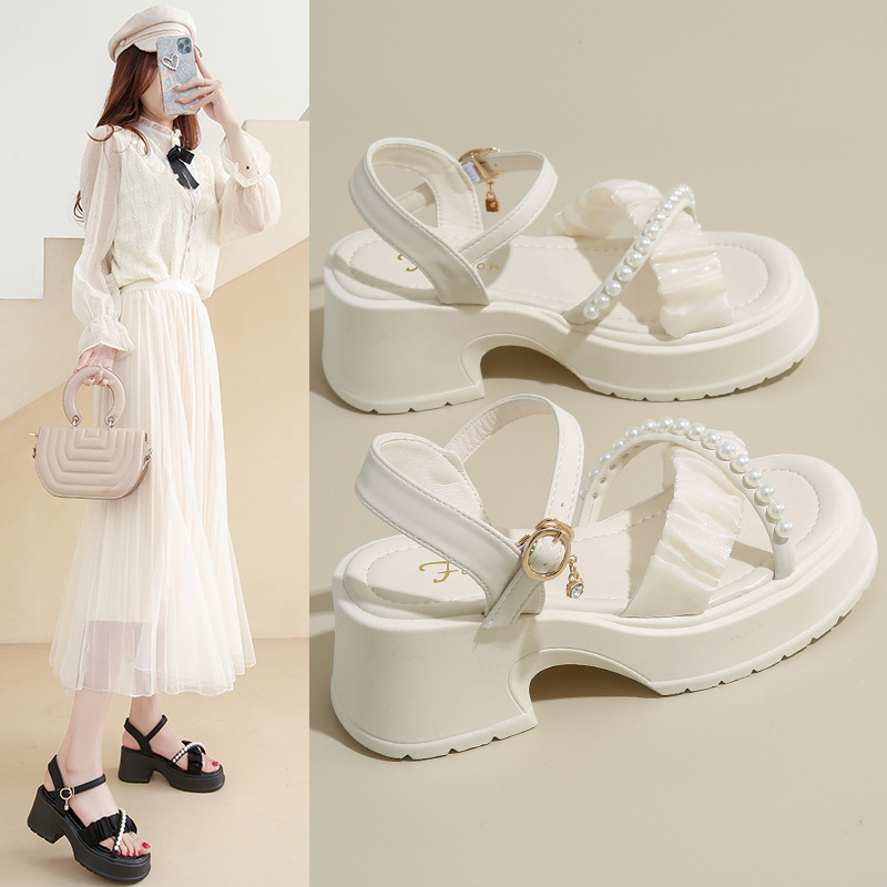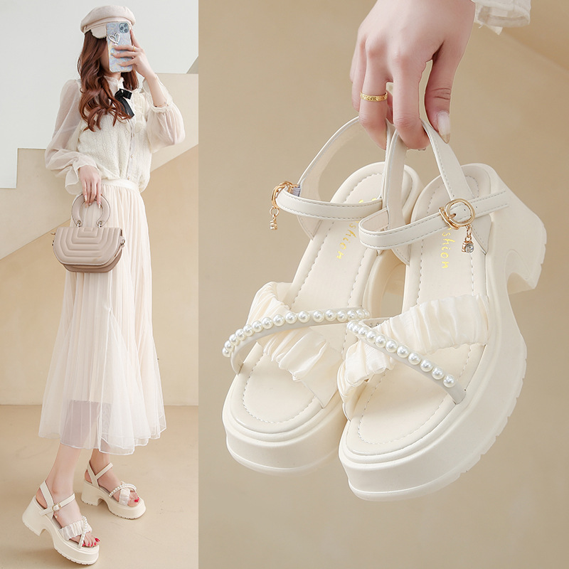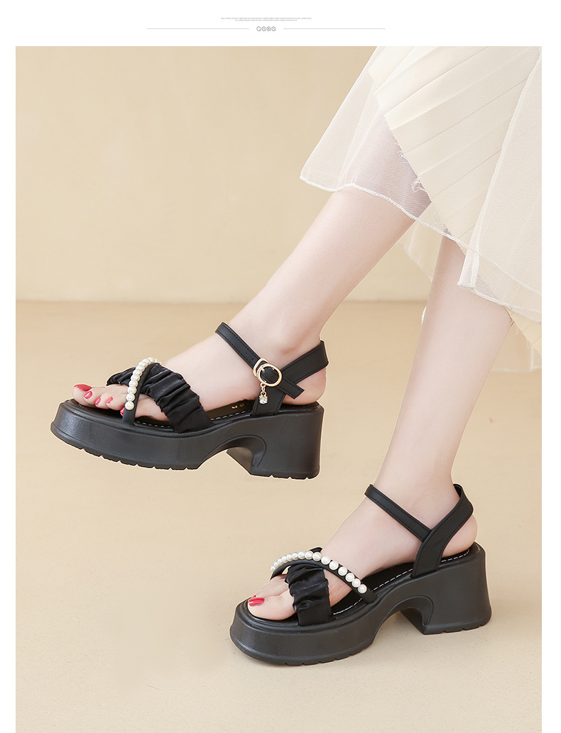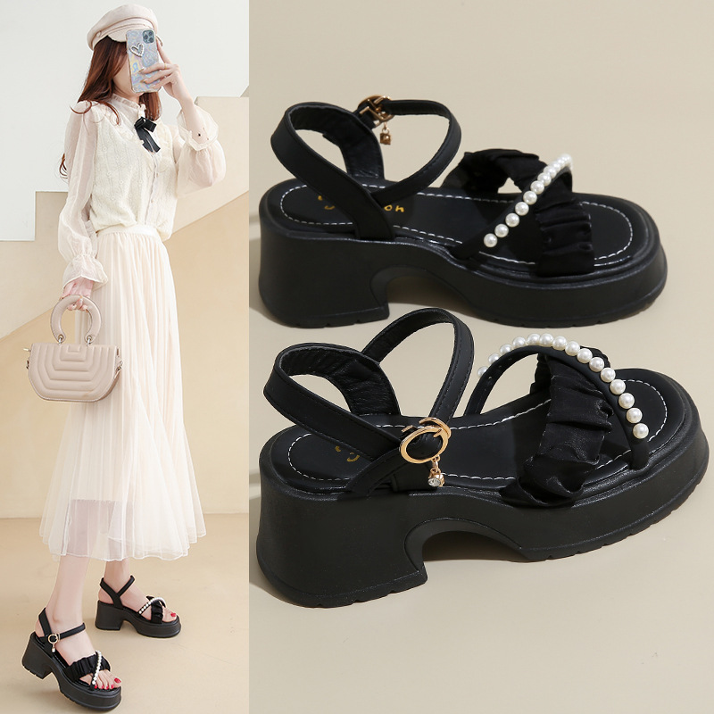 하이힐 샌들 여자 2025 년 새로운 여름 진주 액세서리 모든 경기 샤넬 스타일 여성 두꺼운 밑창 로마 샌들 스커트