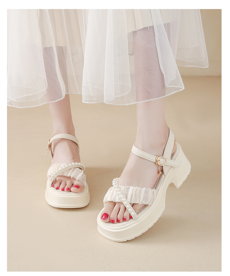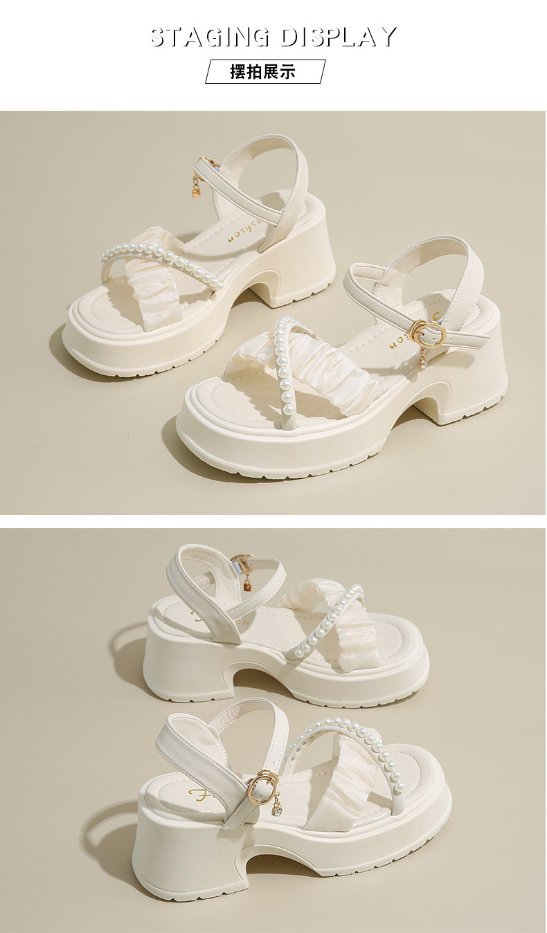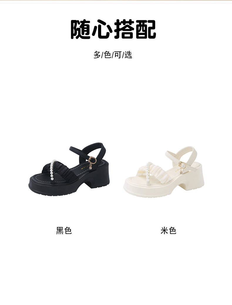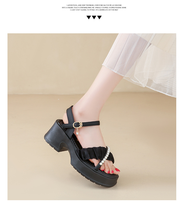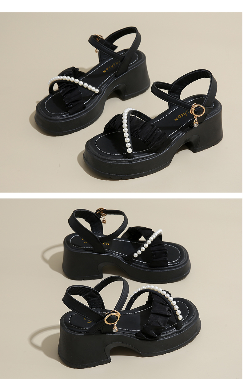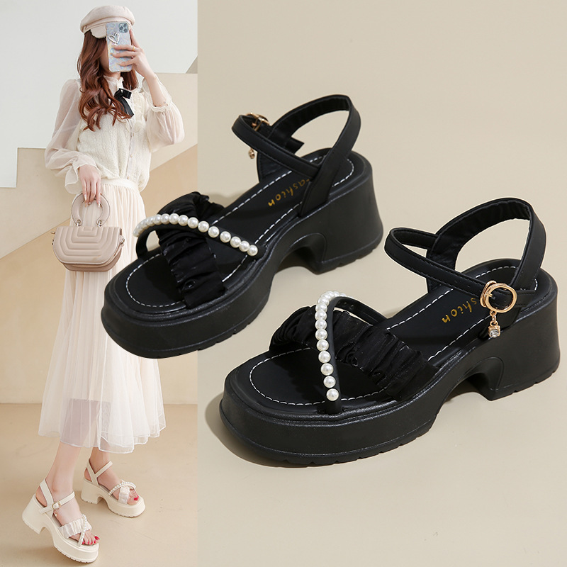 하이힐 샌들 여자 2025 년 새로운 여름 진주 액세서리 모든 경기 샤넬 스타일 여성 두꺼운 밑창 로마 샌들 스커트
