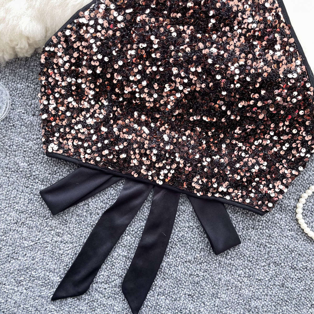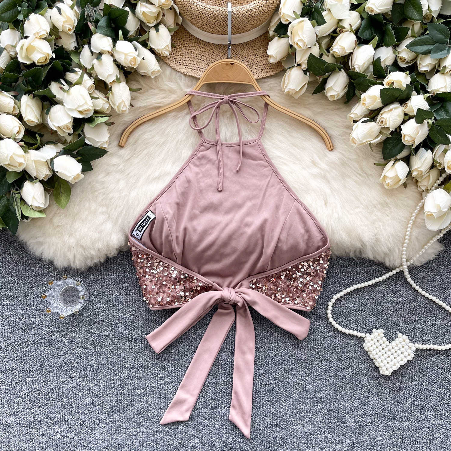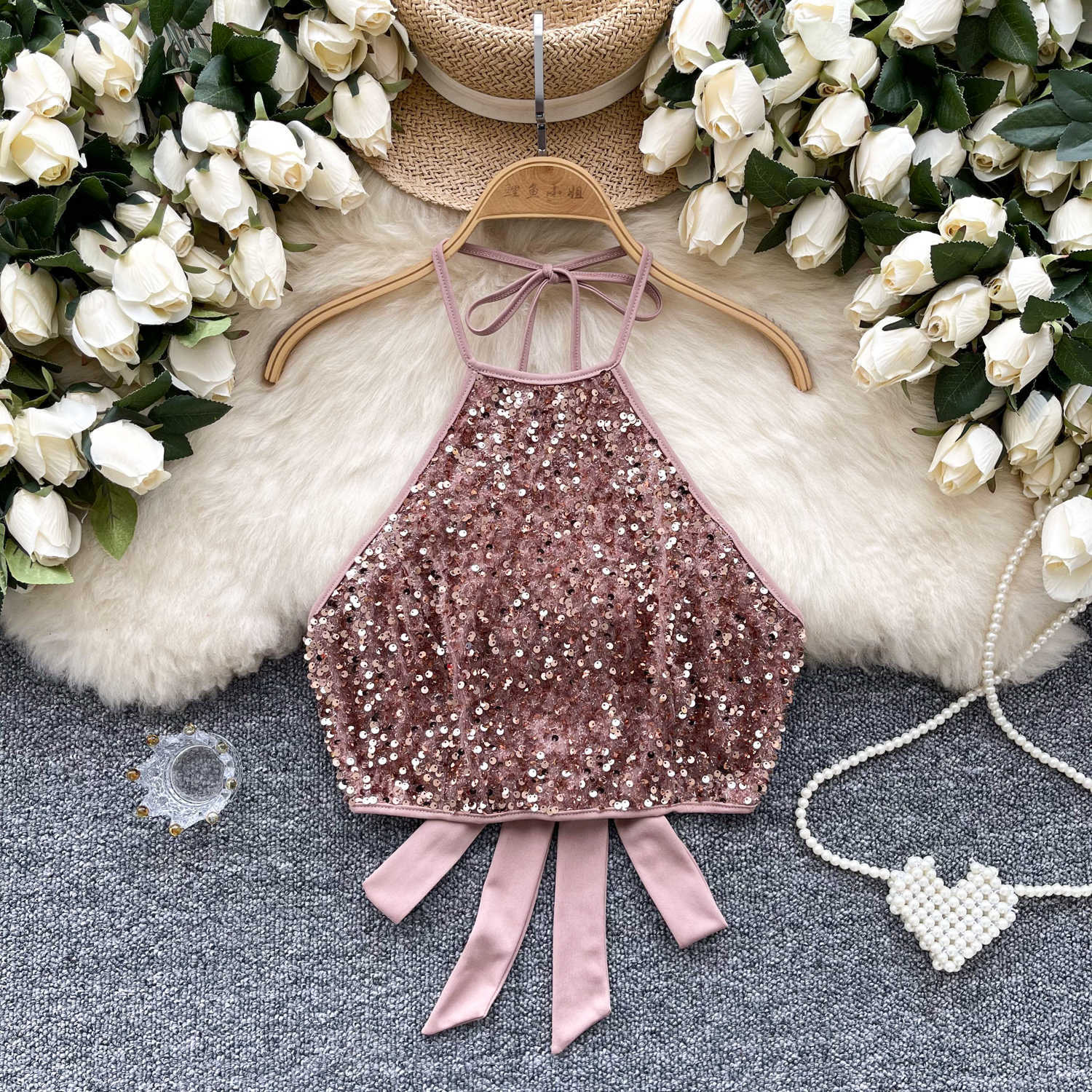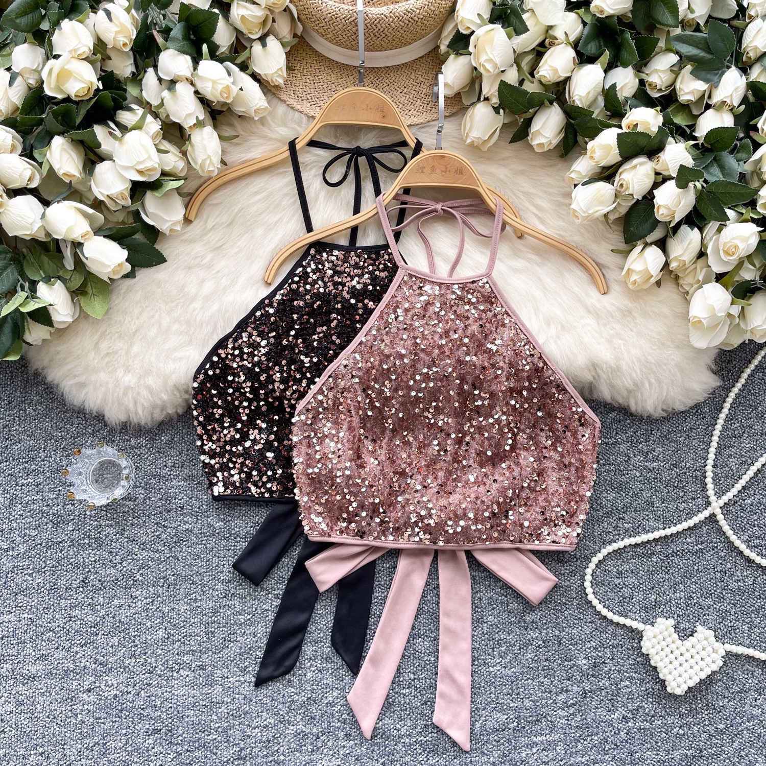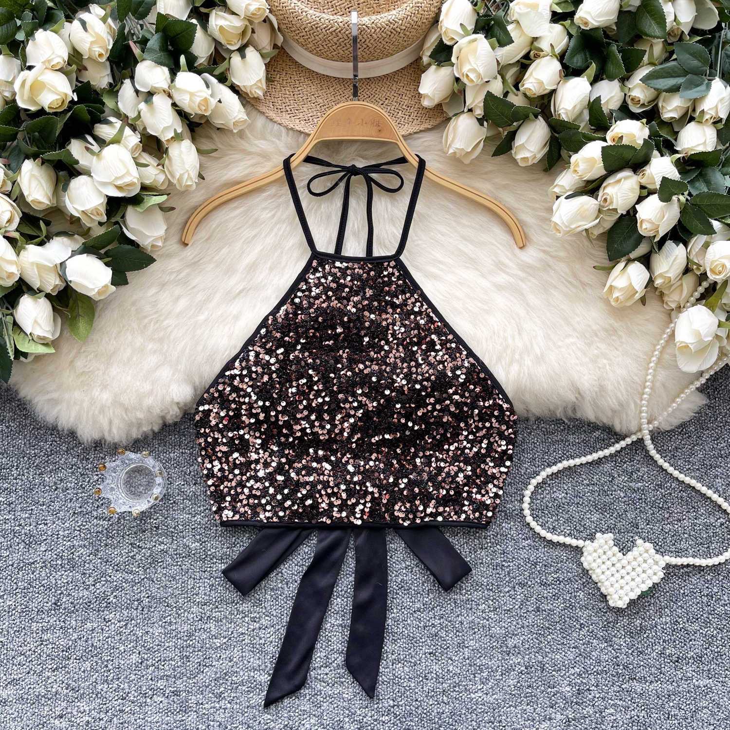 소녀 유럽과 미국 스타일 교수형 목 스트랩 끈없는 조끼 2025 여름 새로운 도착 스트랩 백리스 패셔너블 세퀸 탑 트렌디스토어 가기