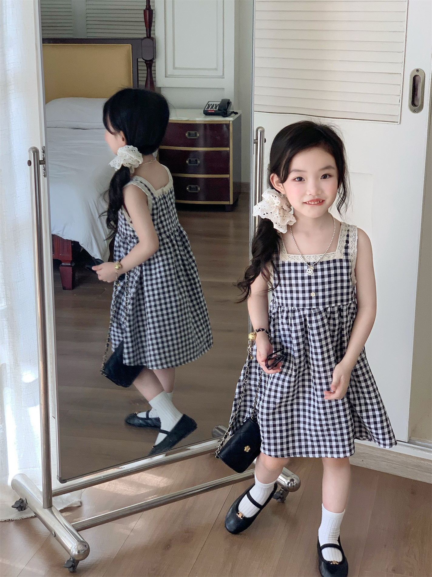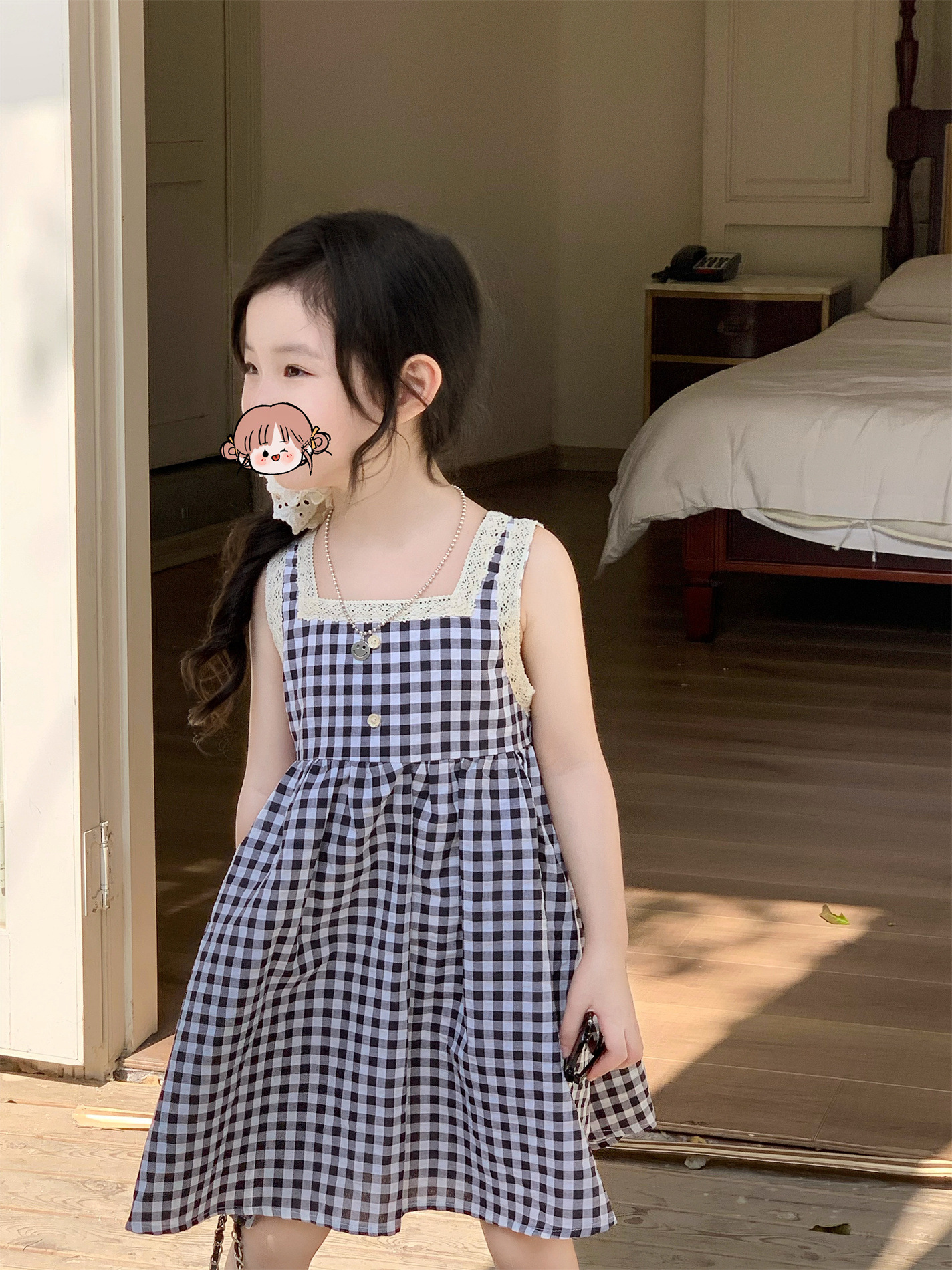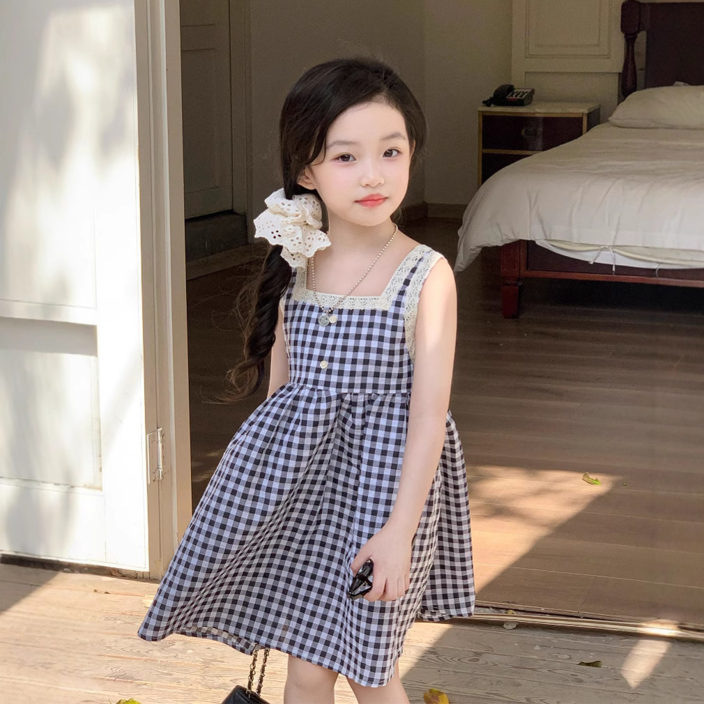 2025 년 여름 새 여아 원피스 격자 무늬 민소매 레이스 디자인 한국 스타일 서양식 휴가 원피스스토어 가기