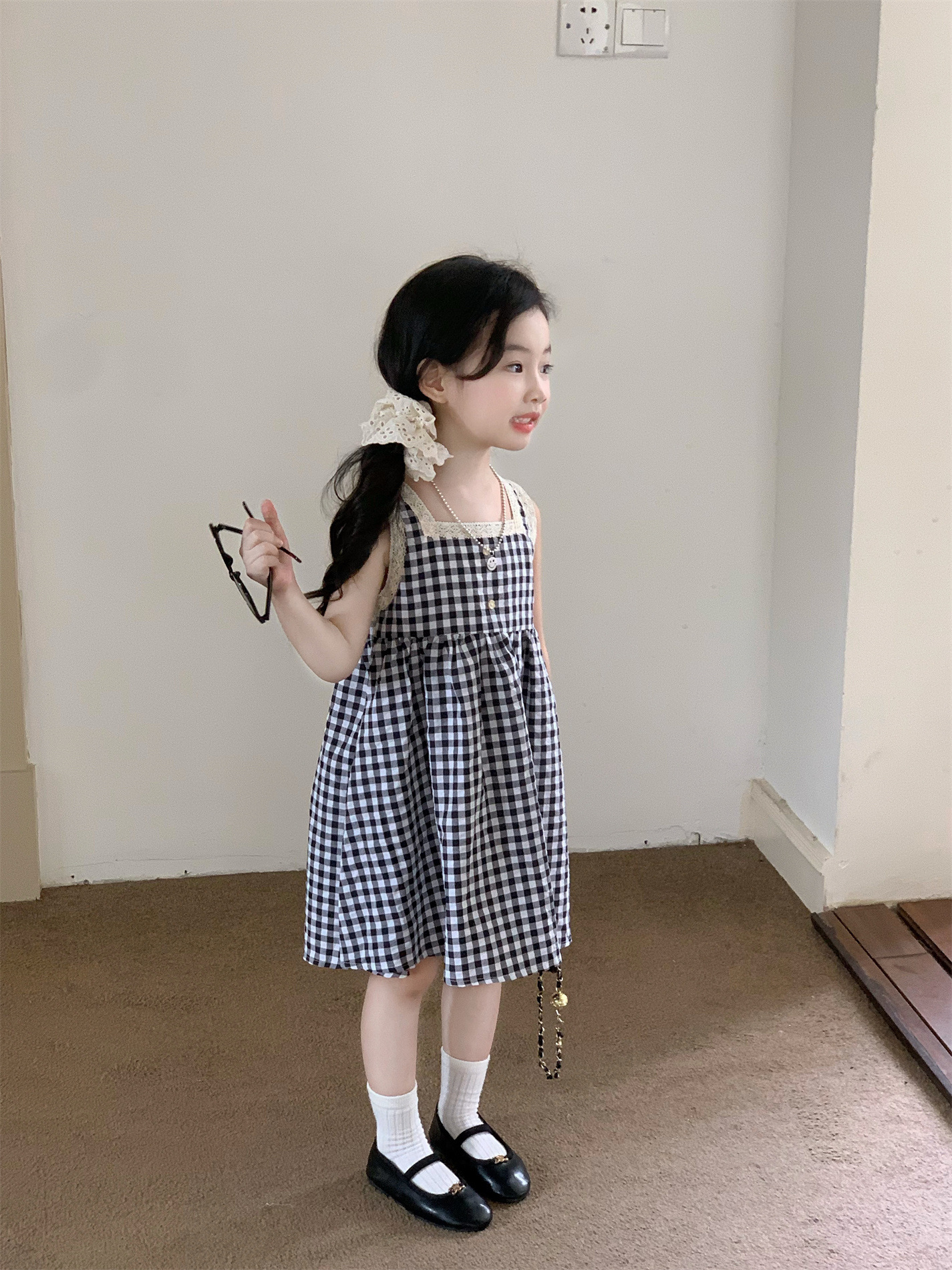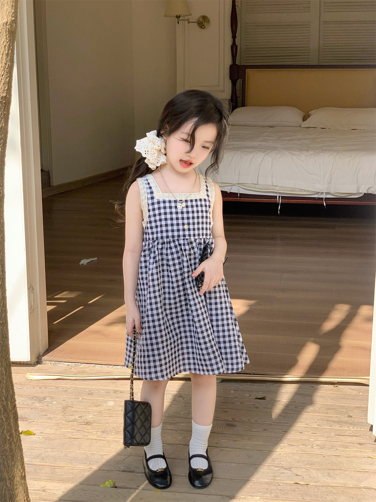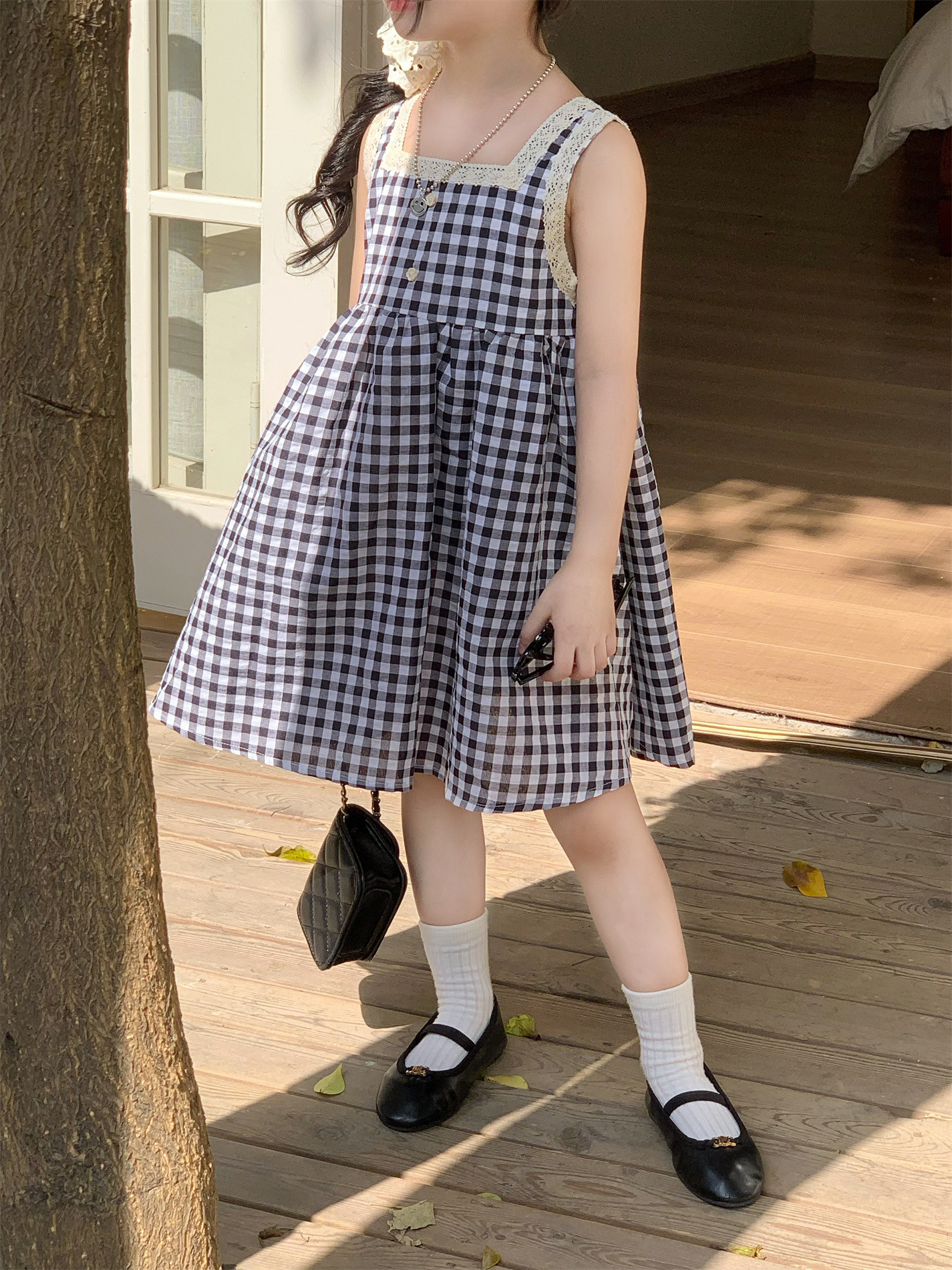 2025 년 여름 새 여아 원피스 격자 무늬 민소매 레이스 디자인 한국 스타일 서양식 휴가 원피스스토어 가기