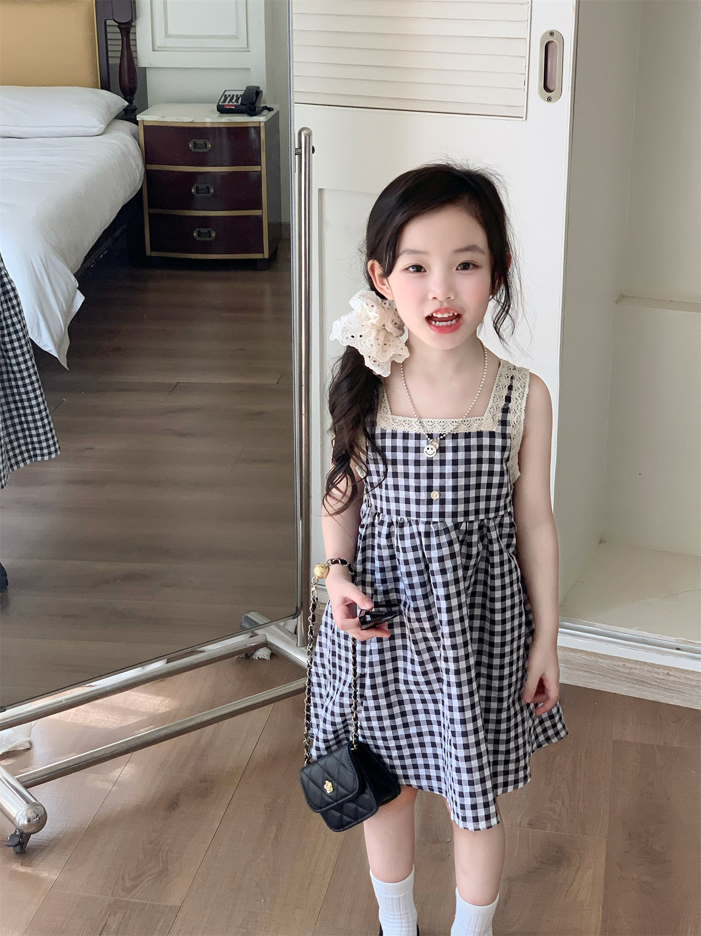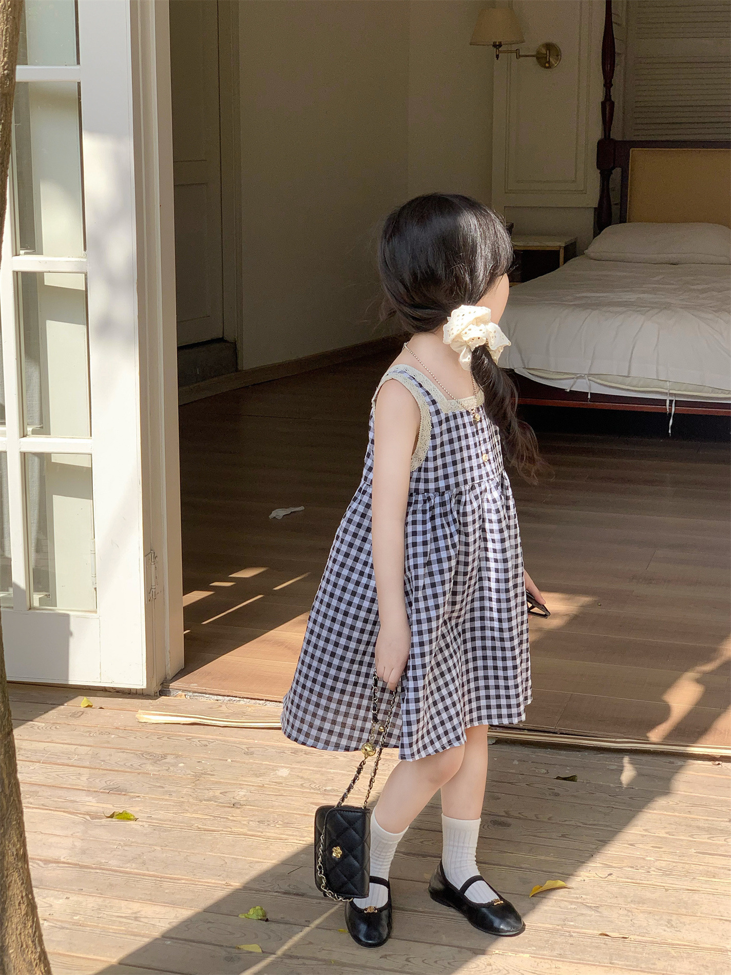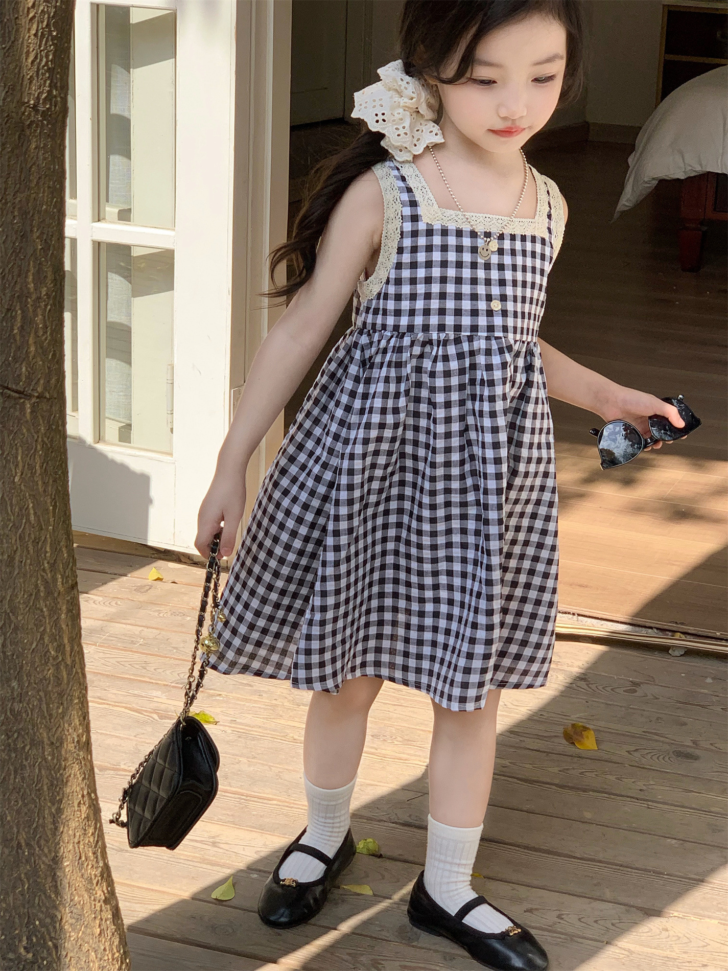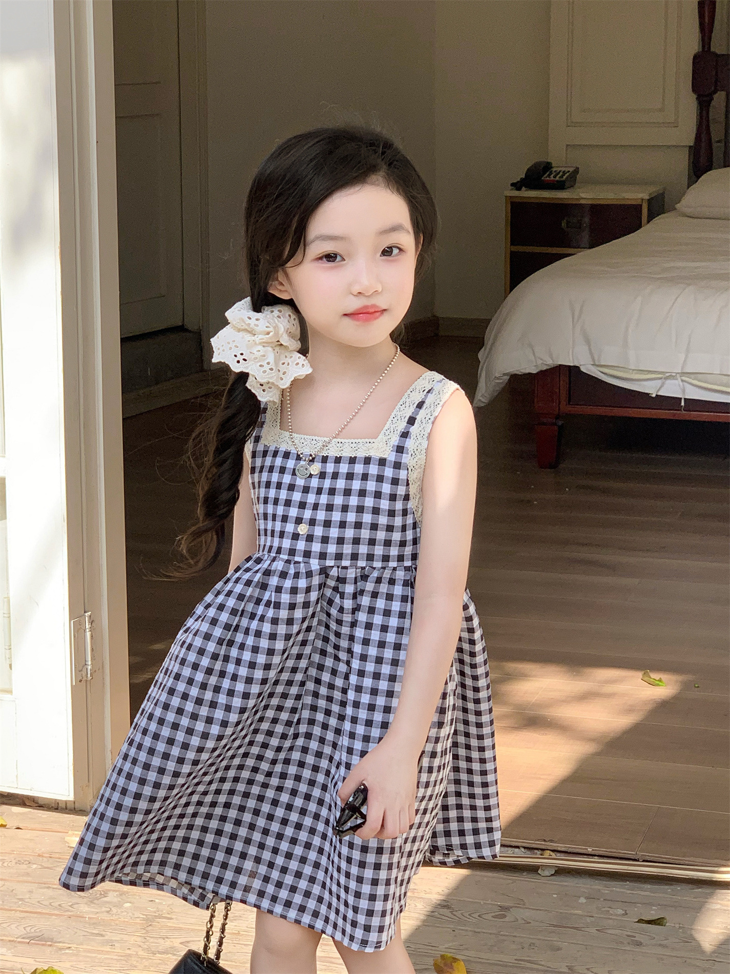 2025 년 여름 새 여아 원피스 격자 무늬 민소매 레이스 디자인 한국 스타일 서양식 휴가 원피스