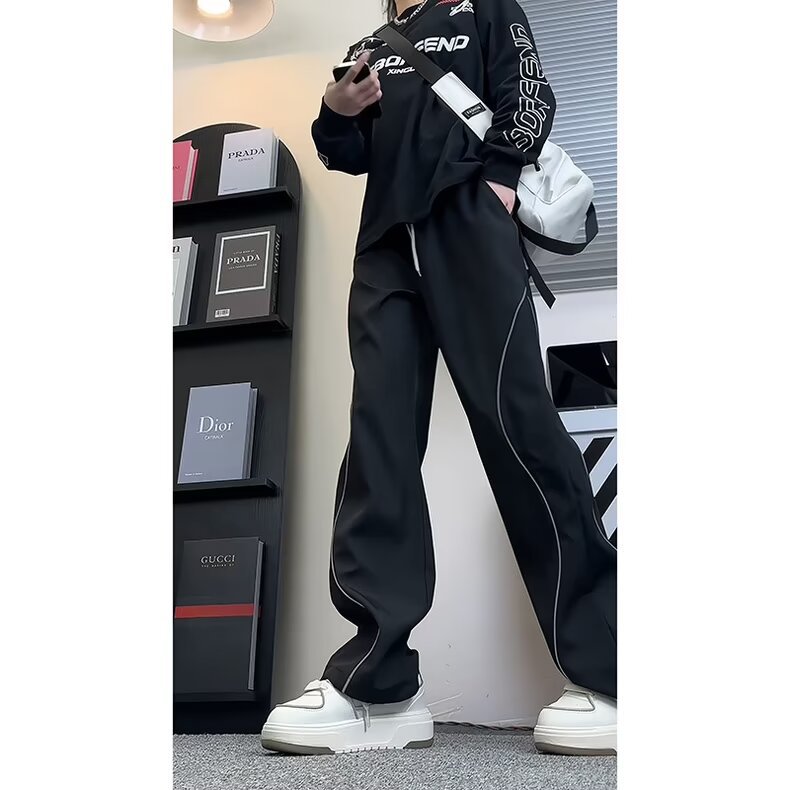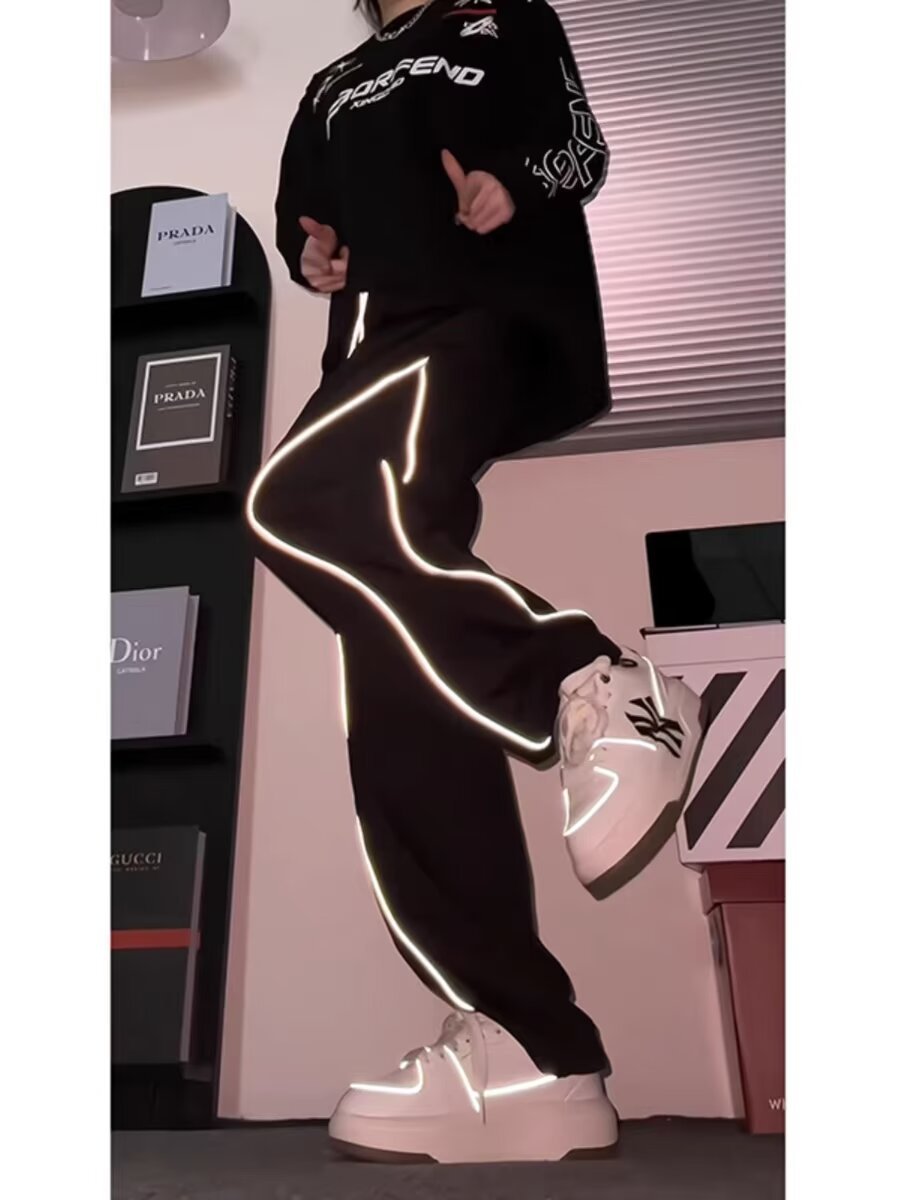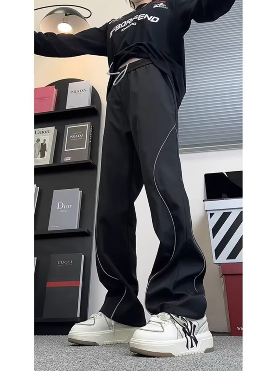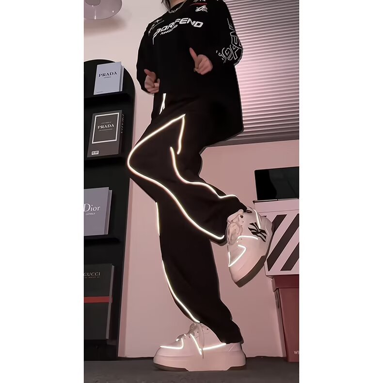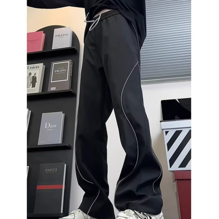 미국식 하이 스트리트 반사 스트립 러시 바지 남자 여름 아이스 실크 얇은 야외 등산 바지 힙합 디자인 센스 스트레이트 바지