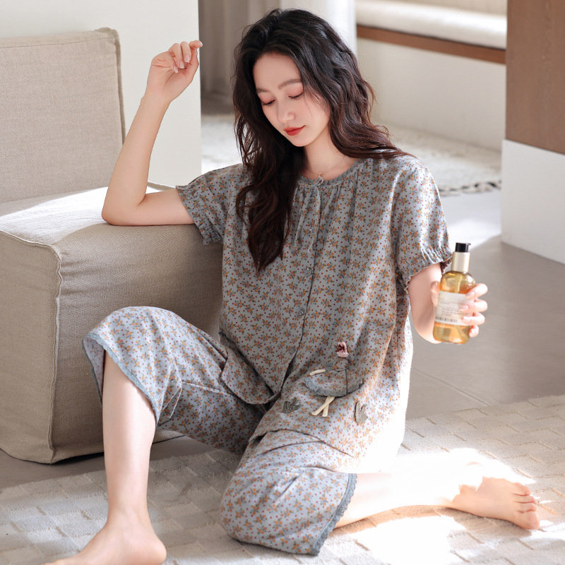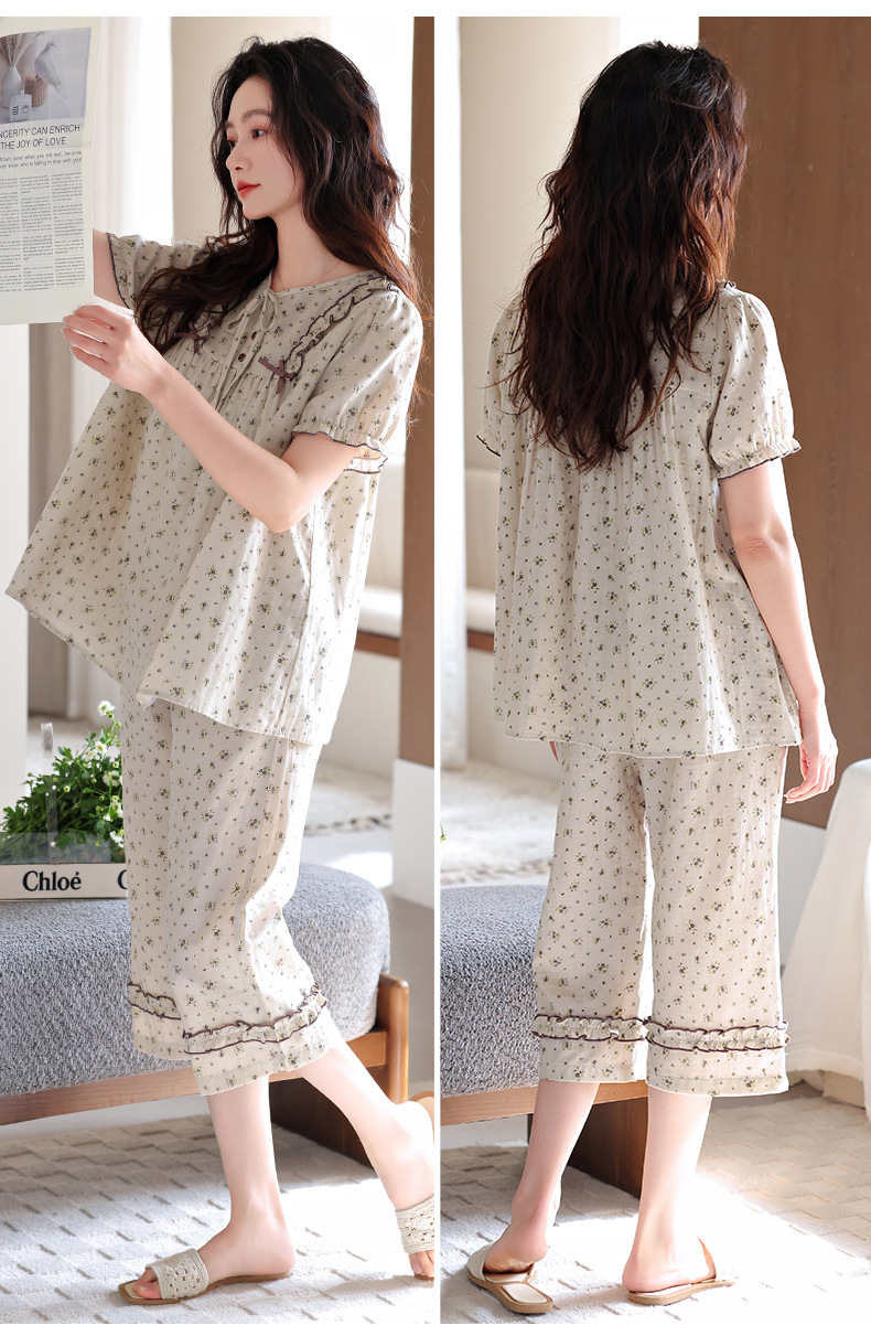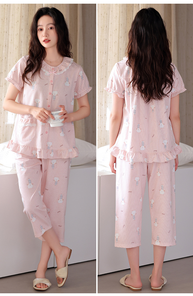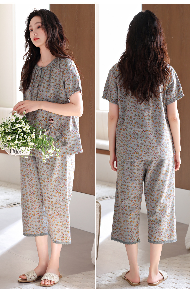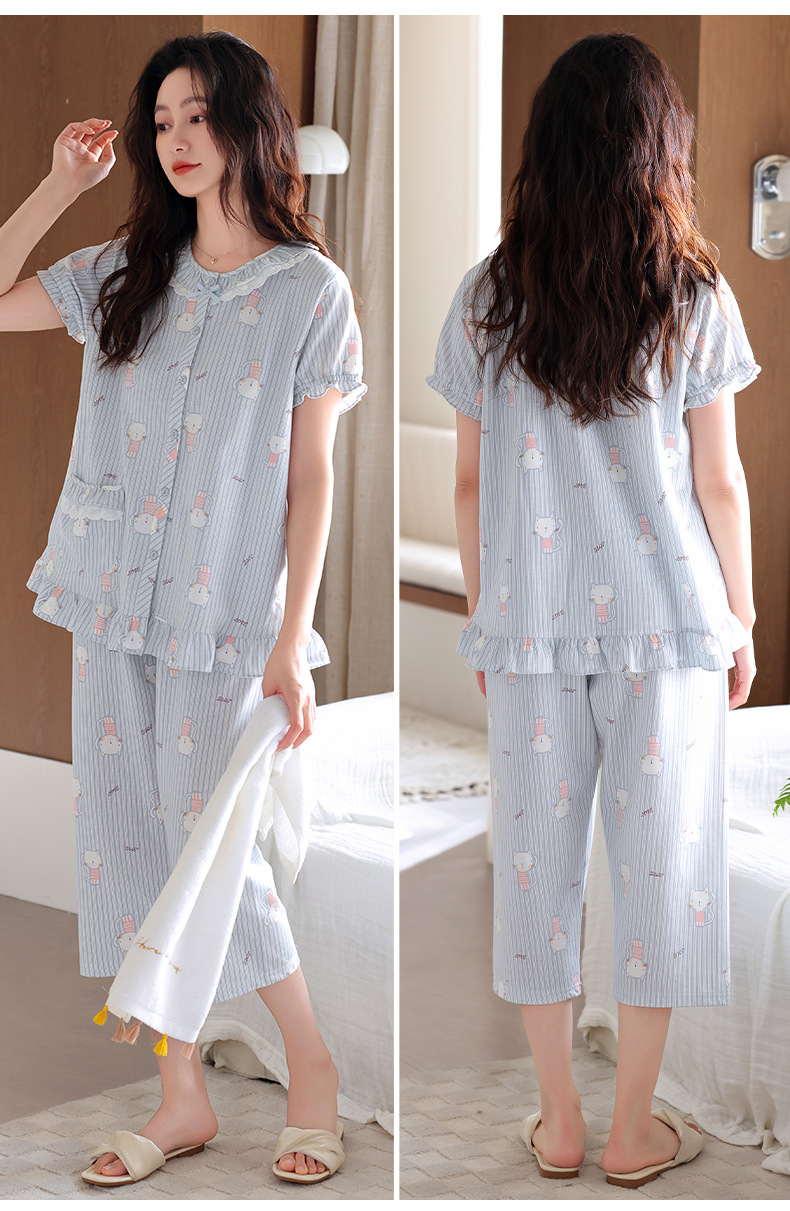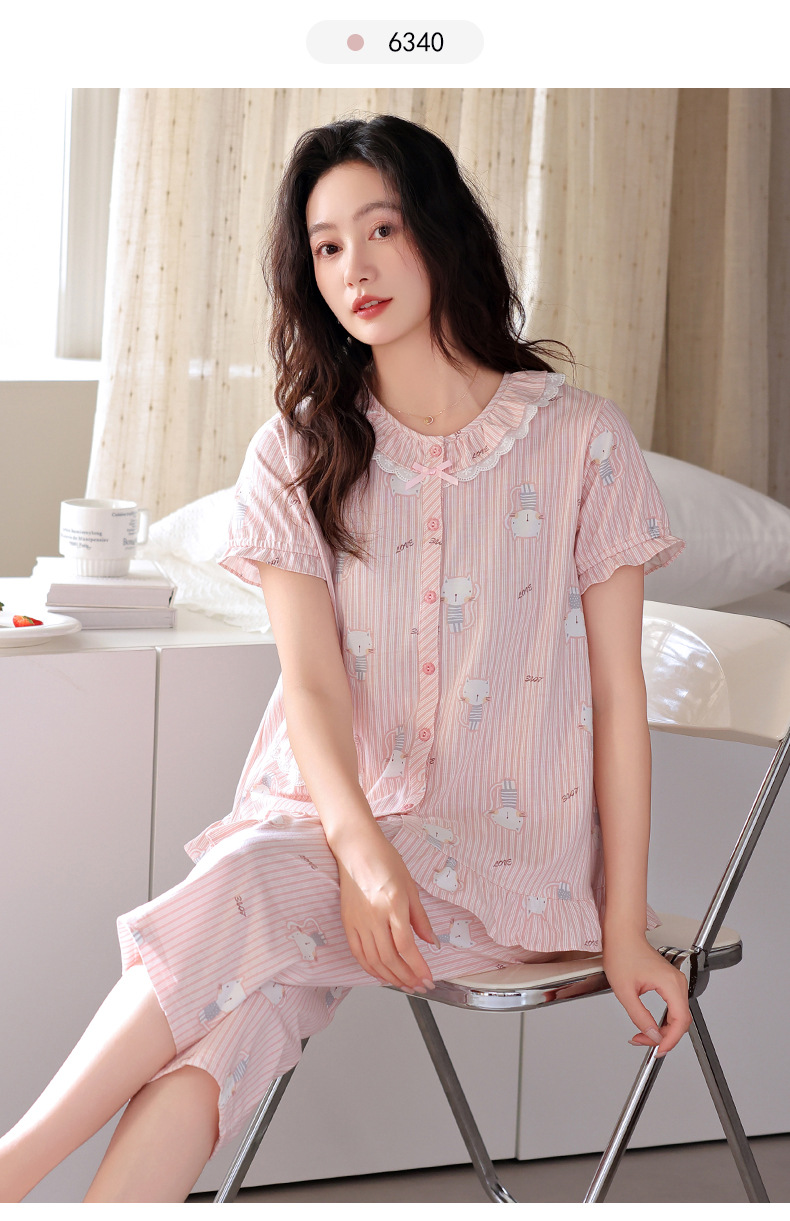 잠옷 여성 여름 순면 반팔 카프리 바지 여름 얇은 순면 캐주얼 플러스 사이즈 의류 홈 세트스토어 가기