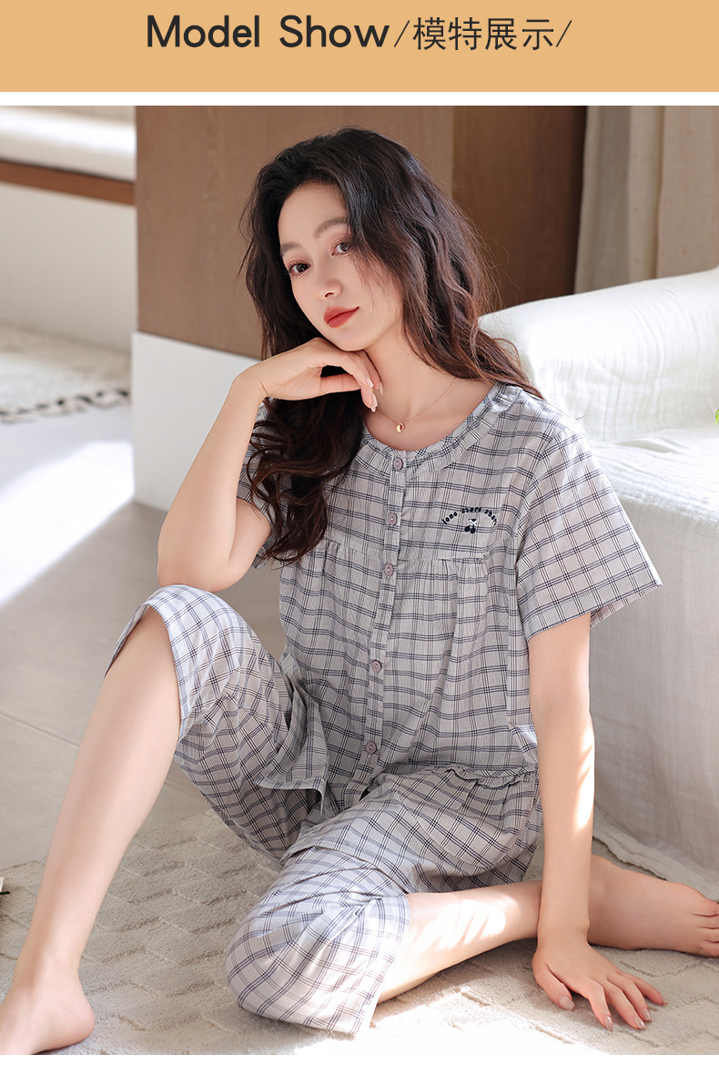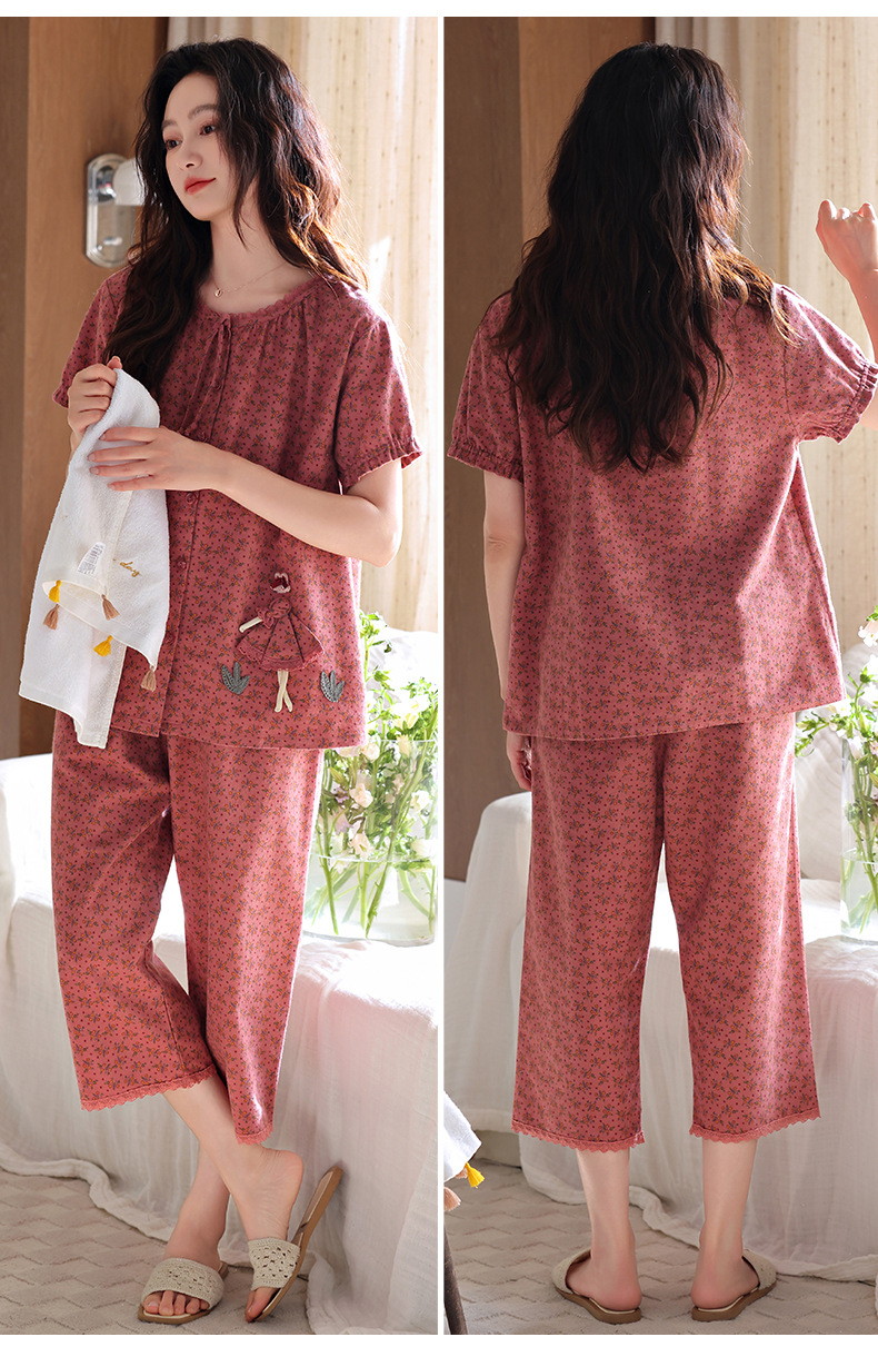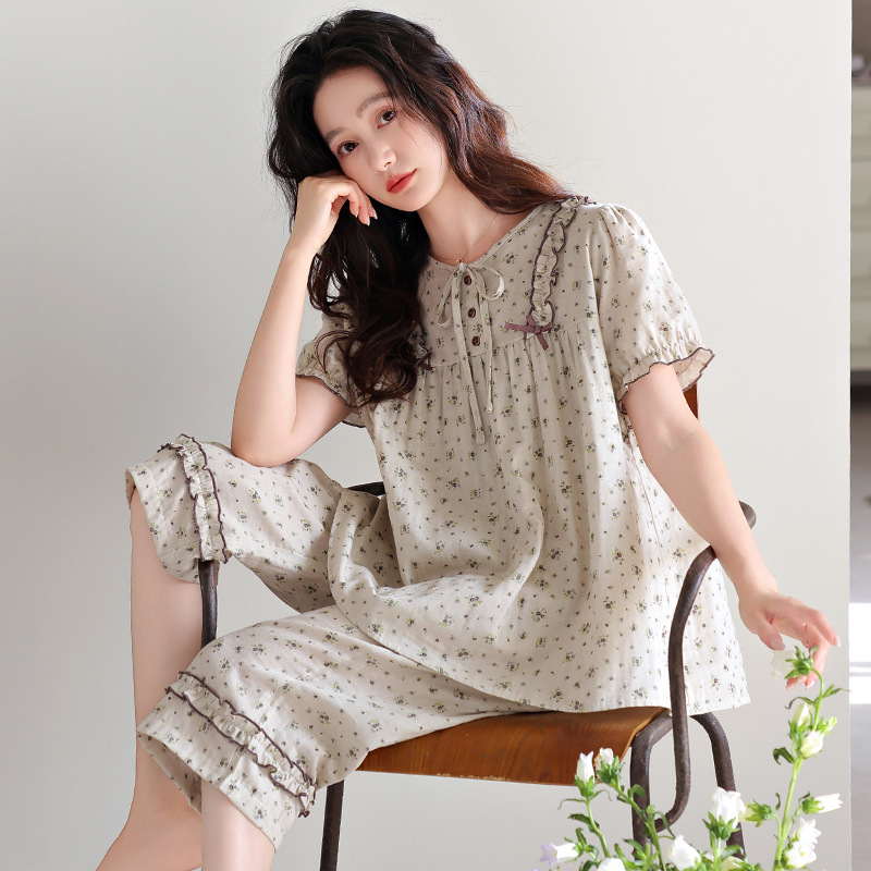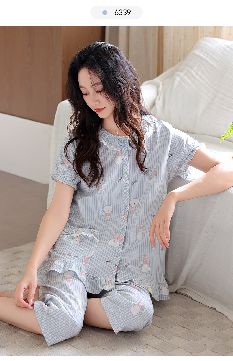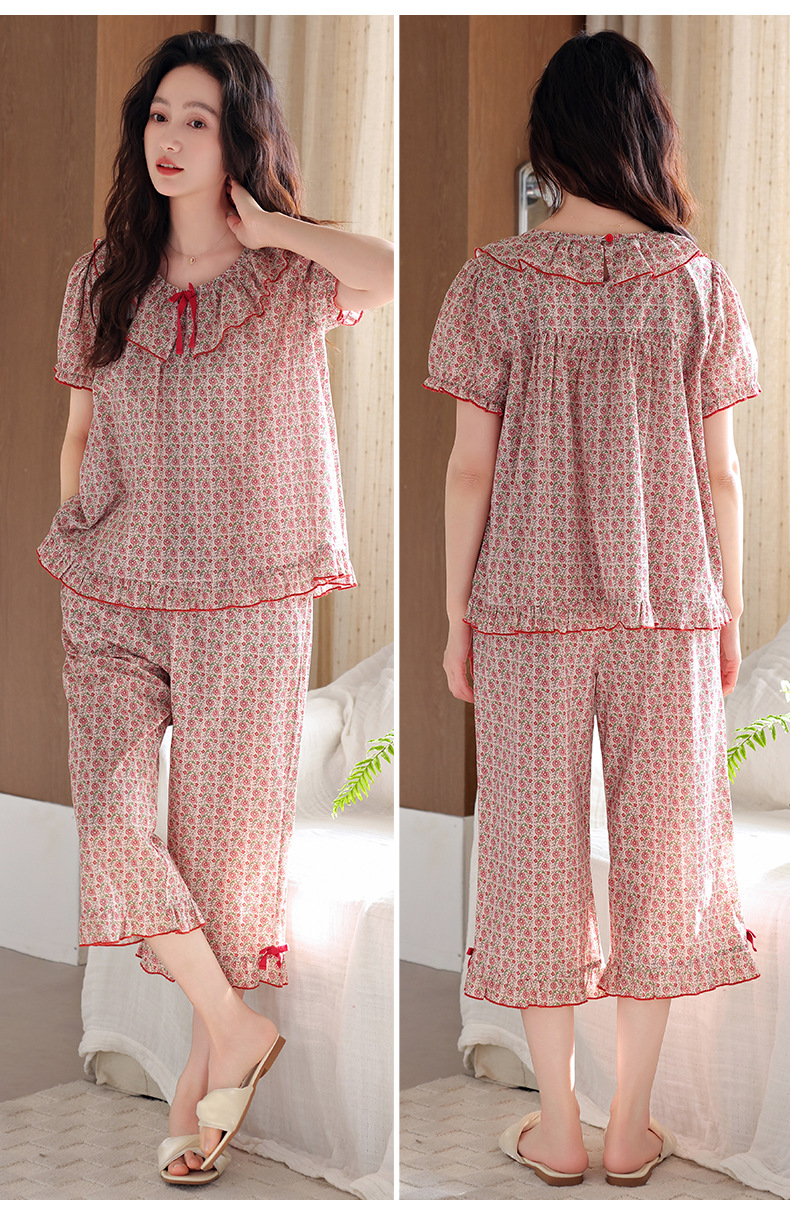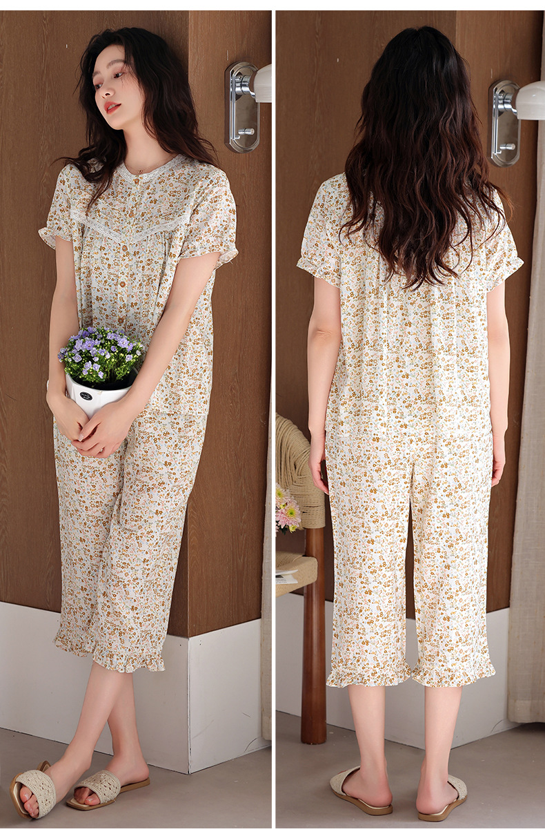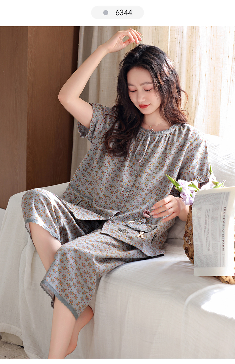 잠옷 여성 여름 순면 반팔 카프리 바지 여름 얇은 순면 캐주얼 플러스 사이즈 의류 홈 세트스토어 가기