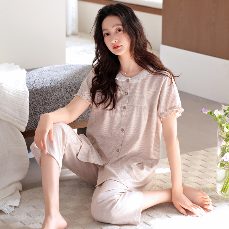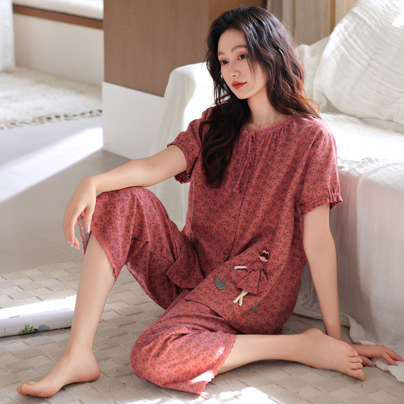잠옷 여성 여름 순면 반팔 카프리 바지 여름 얇은 순면 캐주얼 플러스 사이즈 의류 홈 세트