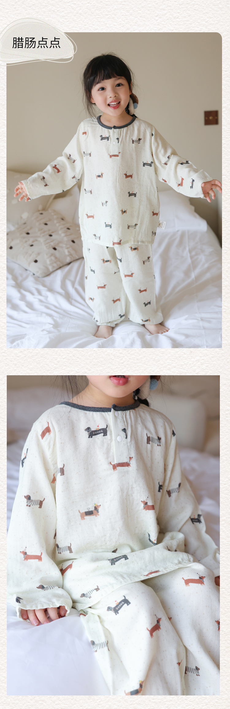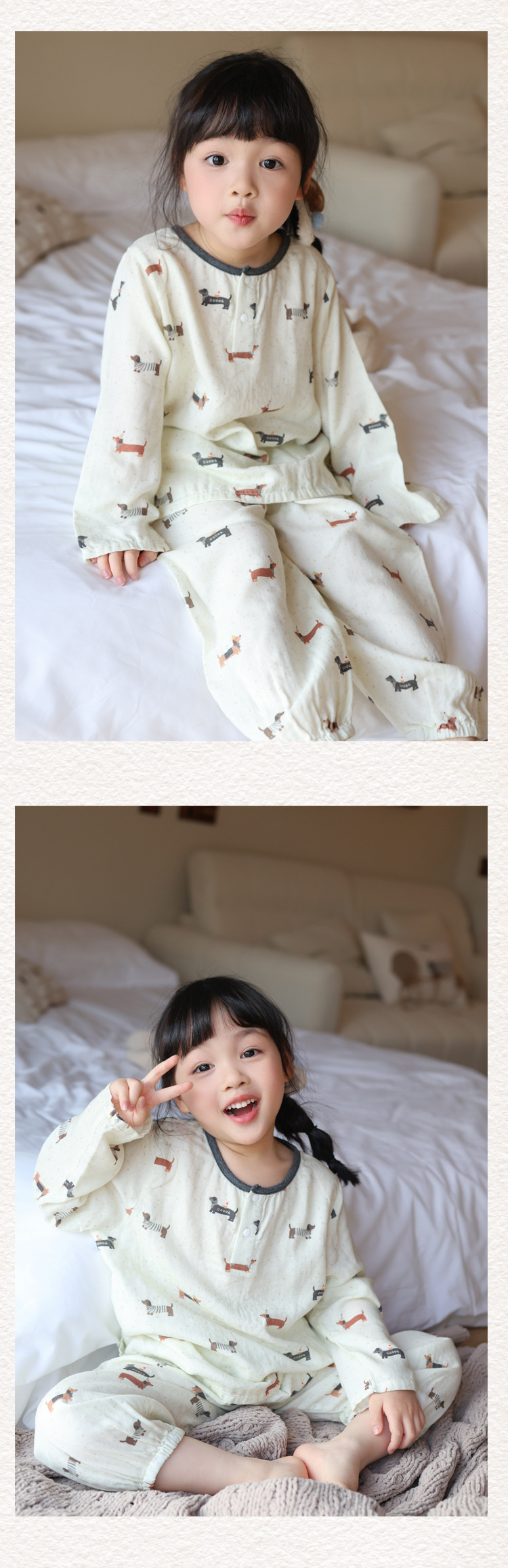 • 닥스훈트 도트 아동용 더블 레이어 거즈 긴팔 바지 홈웨어 세트