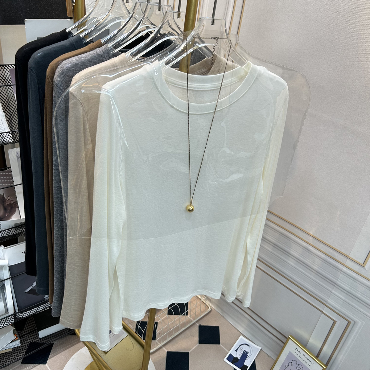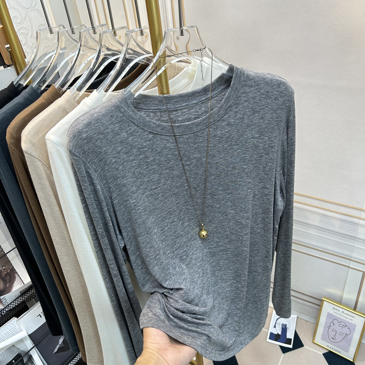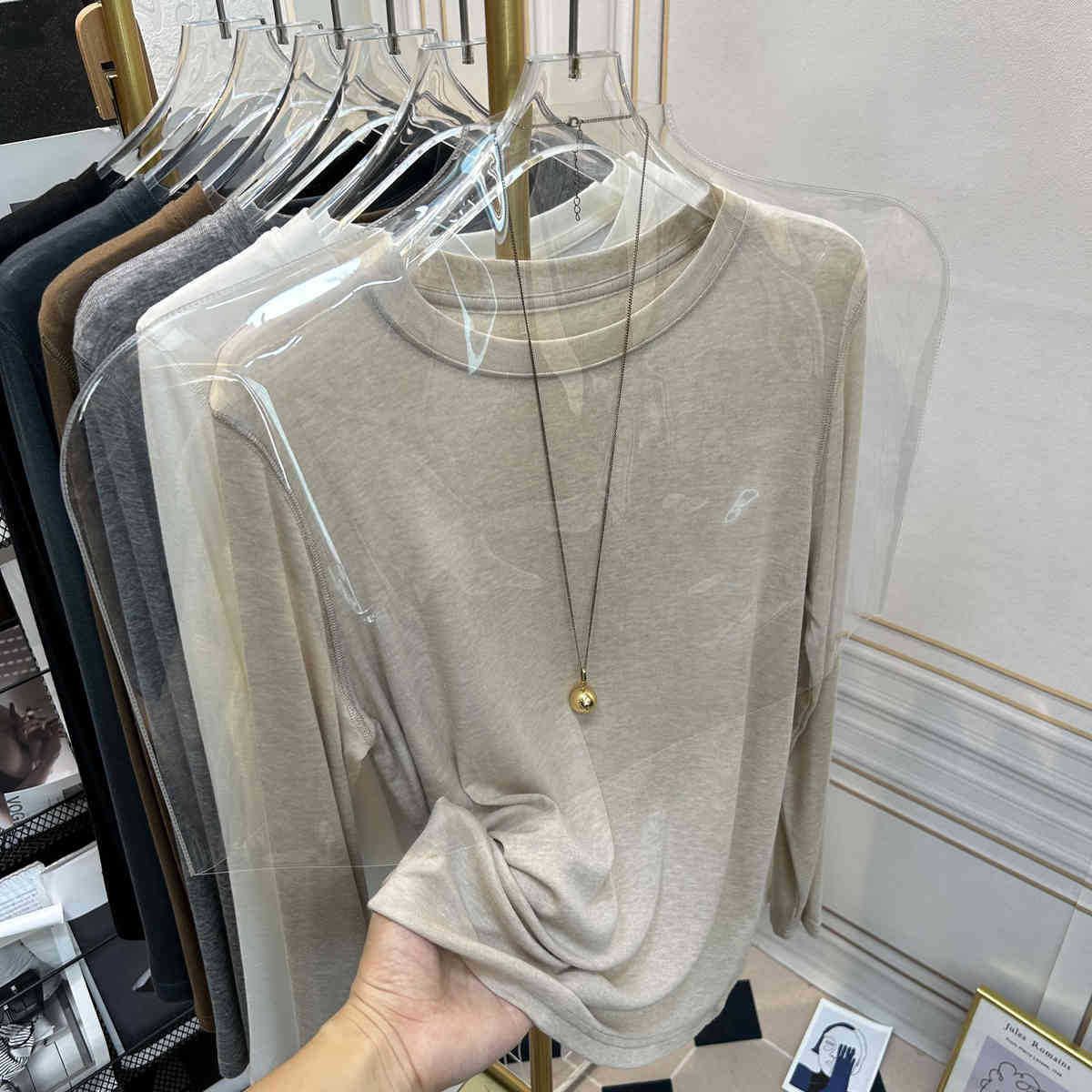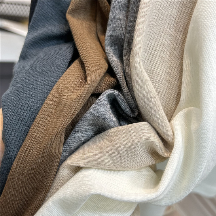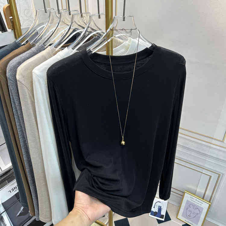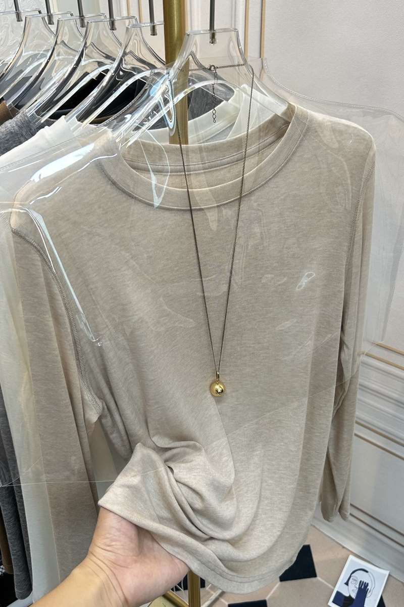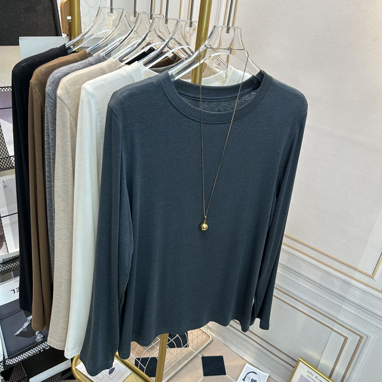아울렛 ~ 소프트 왁스 크루 넥 울 텐셀 마스크 긴 소매 티셔츠 여성의 2025 년 봄과 가을 새로운 슬림베이스 셔츠스토어 가기