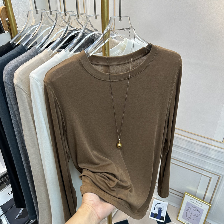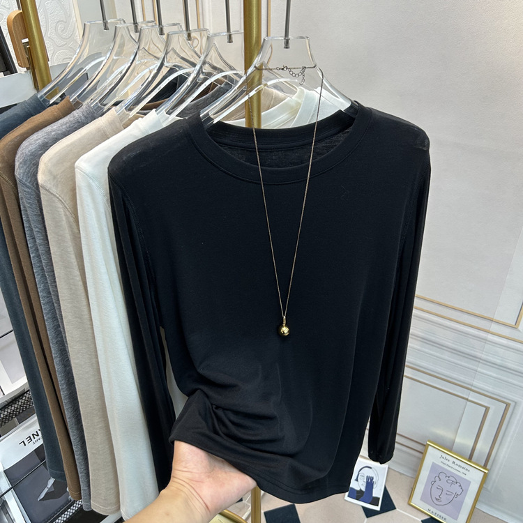 아울렛 ~ 소프트 왁스 크루 넥 울 텐셀 마스크 긴 소매 티셔츠 여성의 2025 년 봄과 가을 새로운 슬림베이스 셔츠