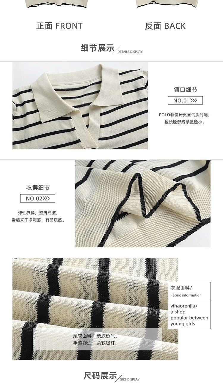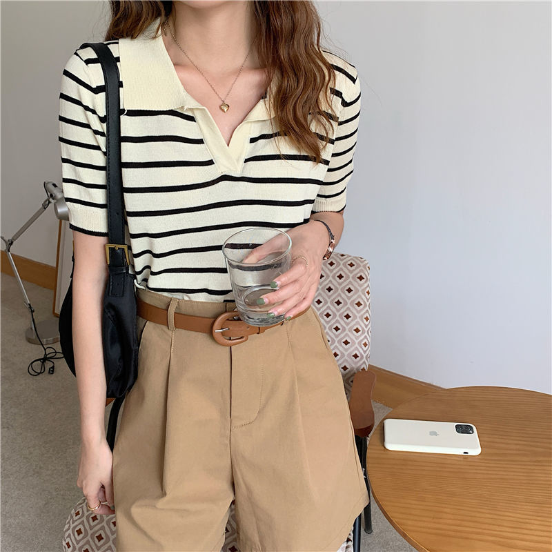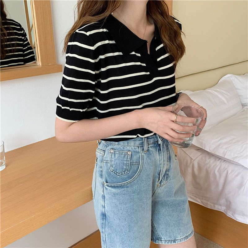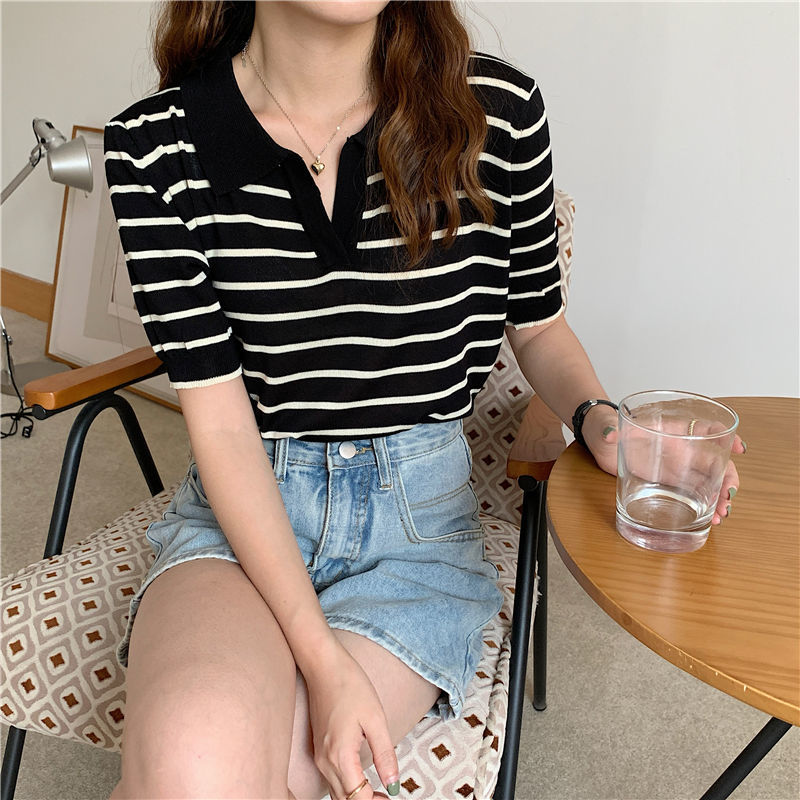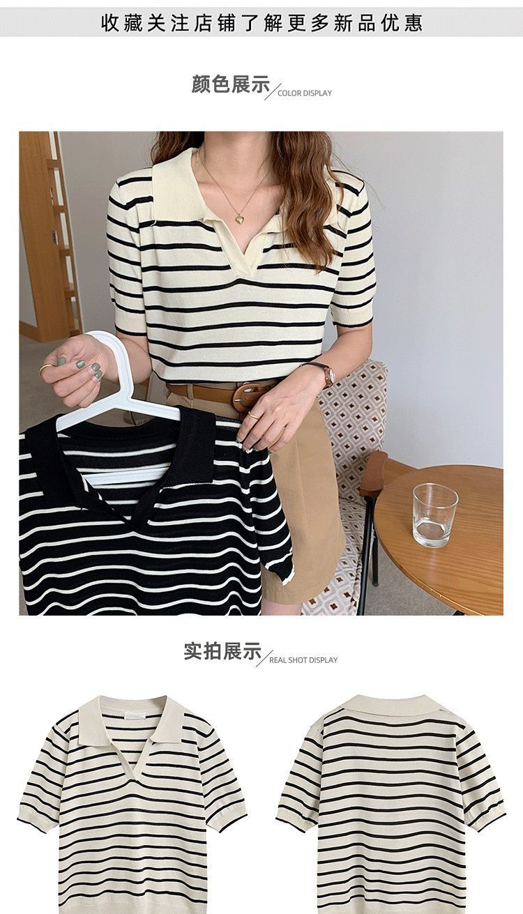 도매 패션 칼라 스트라이프 탑 여성 여름 새로운 외관 슬림 얇은 짧은 소매 아이스 실크 셔츠 스웨터