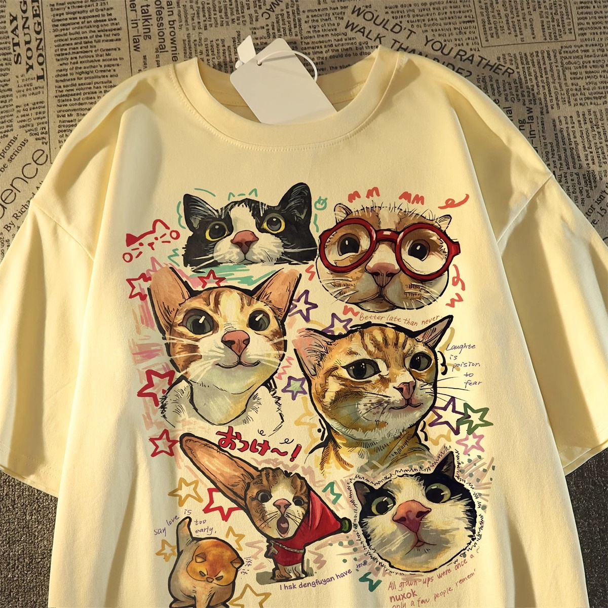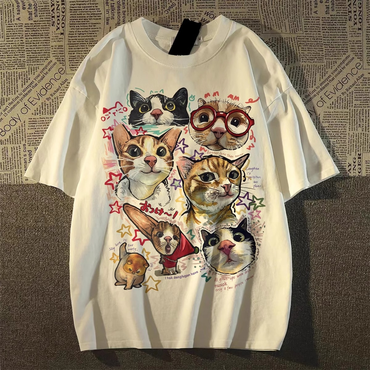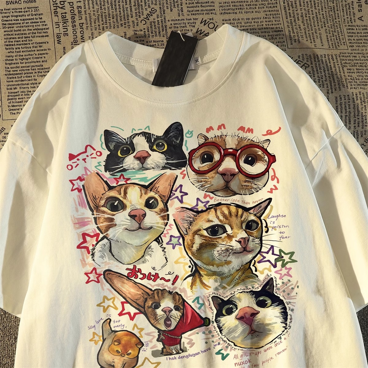 S2084 미국 달콤한 멋진 만화 고양이 인쇄 반팔 티셔츠 여성과 남성 여름 2025 새로운 느슨한 유행 브랜드 탑