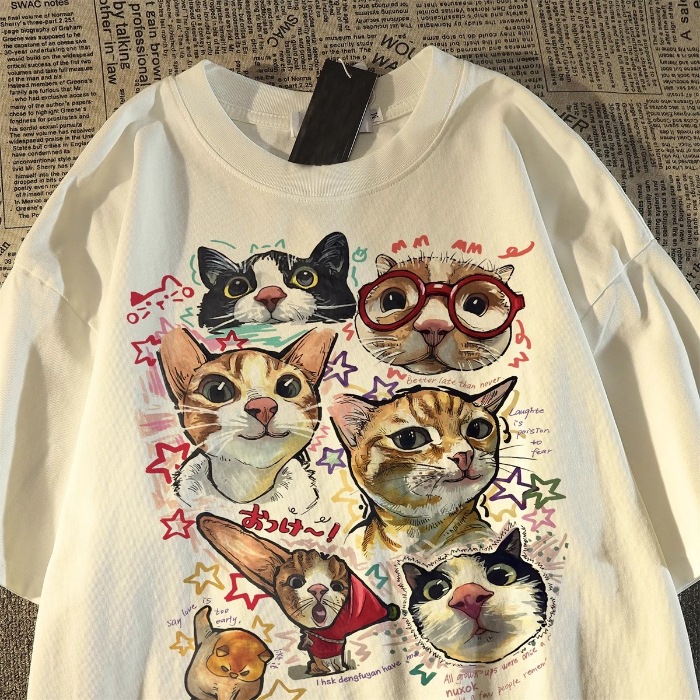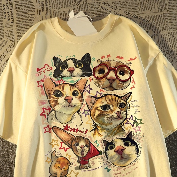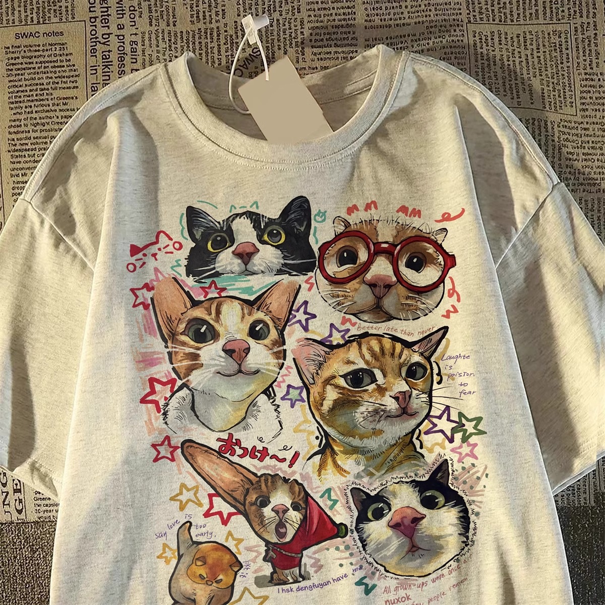 S2084 미국 달콤한 멋진 만화 고양이 인쇄 반팔 티셔츠 여성과 남성 여름 2025 새로운 느슨한 유행 브랜드 탑스토어 가기