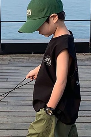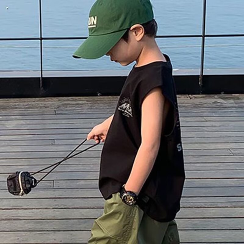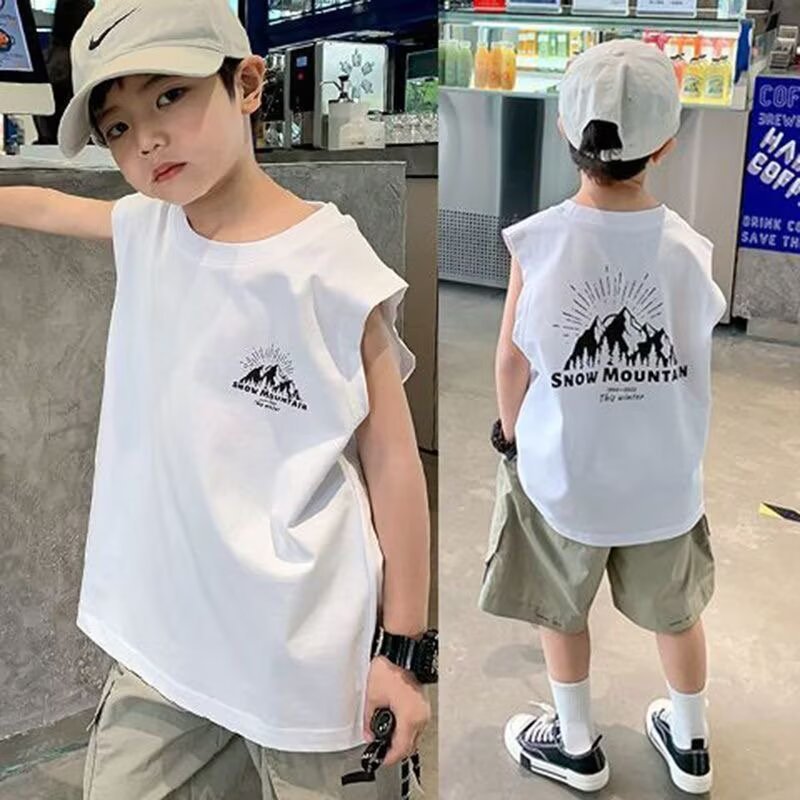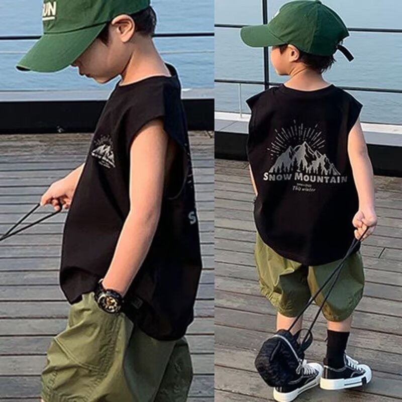 어린이 2025 년 새 한국식 소년 조끼 여름 소년 민소매 느슨한 탑 어린이 프린트 티셔츠 둥근 목스토어 가기