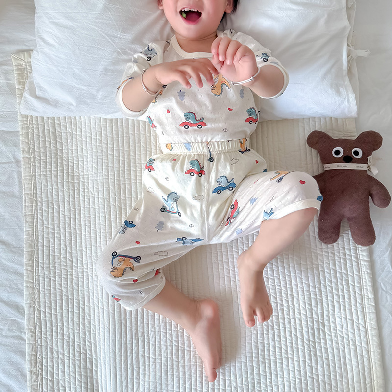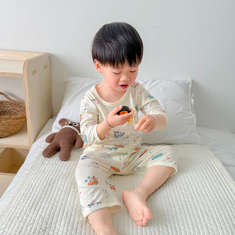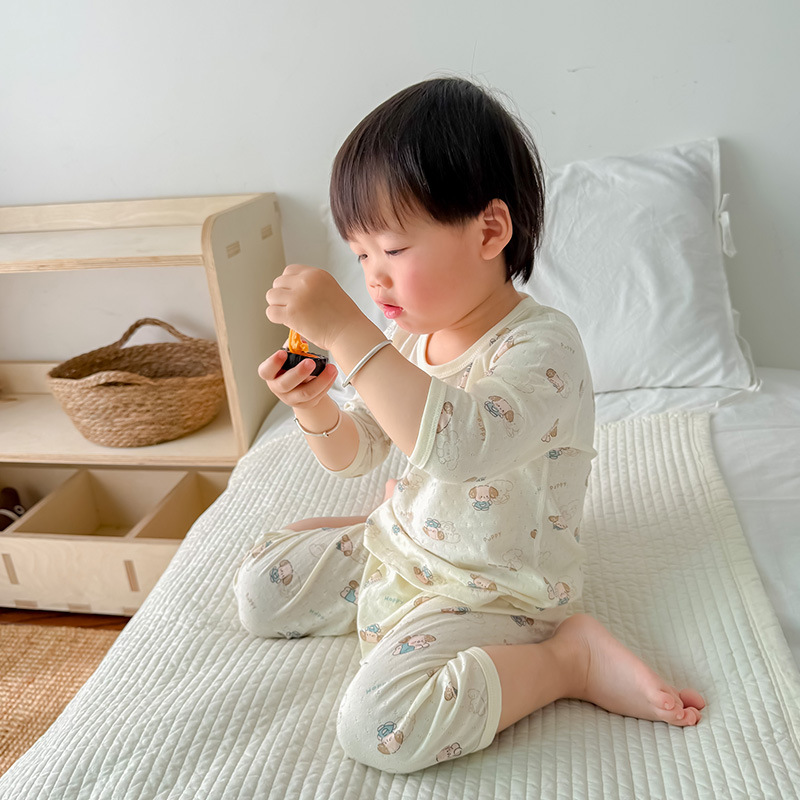 여름 아기의 집 옷 얇은 순수한면 반소매 호흡 에어컨 옷 어린이 잠옷 소년 소녀 짧은 소매 세트