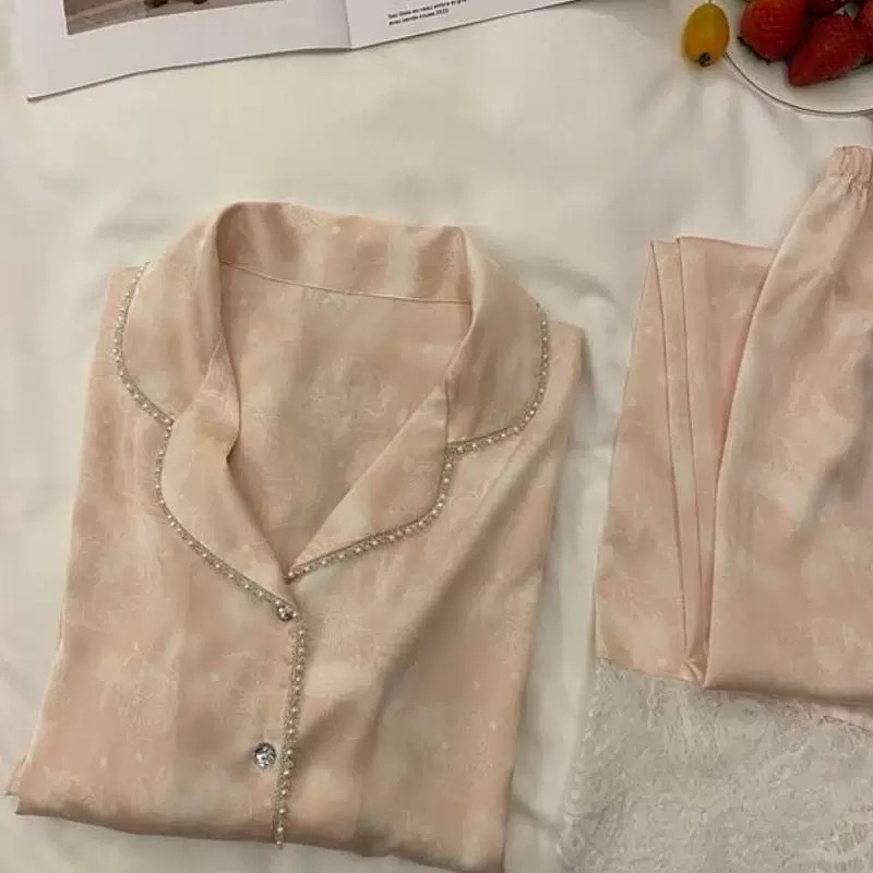 아이스 실크 파자마 여성 진주 봄과 가을 여름 긴팔 얇은 실크 하이 엔드 센스 홈 의류 Ins 파자마 세트스토어 가기