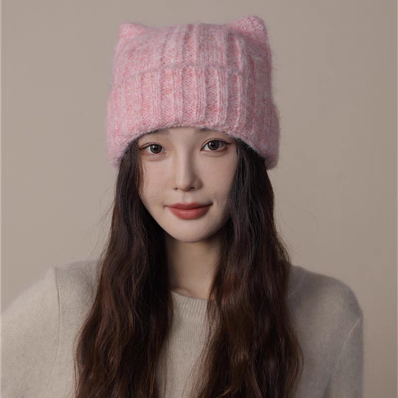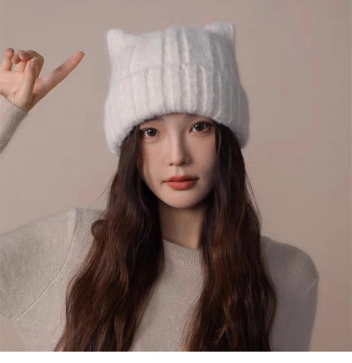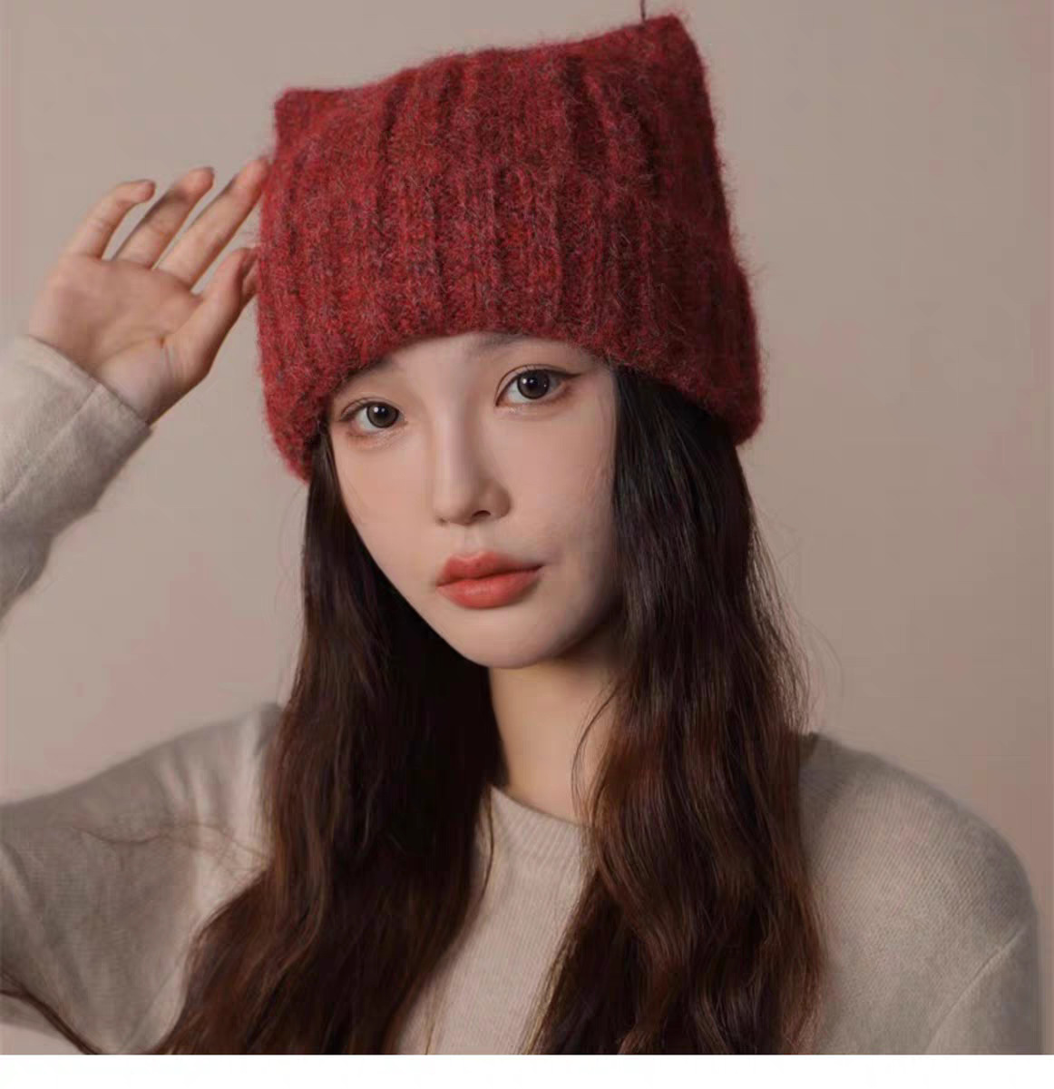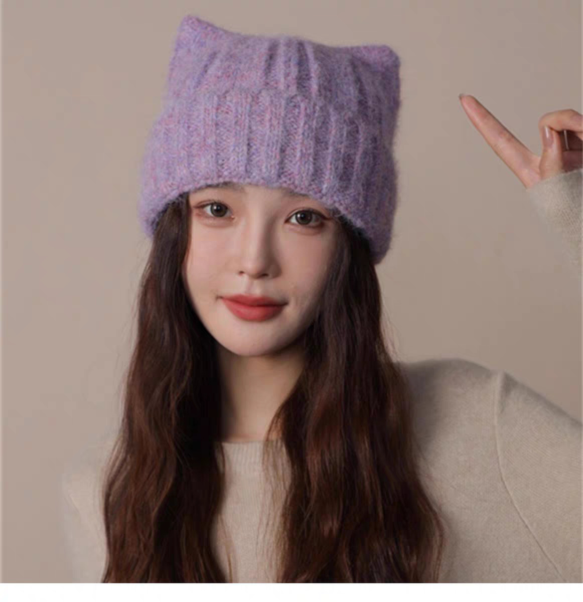 한국 새로운 귀여운 고양이 귀 부드러운 봉제 니트 모자 차가운 모자 모직 모자 여성 패션 올 매치 모자 조수