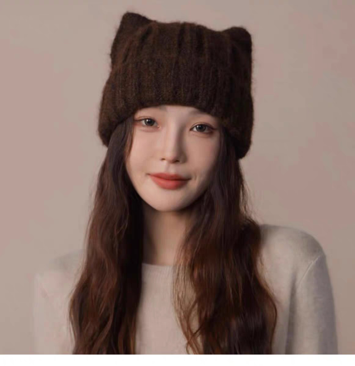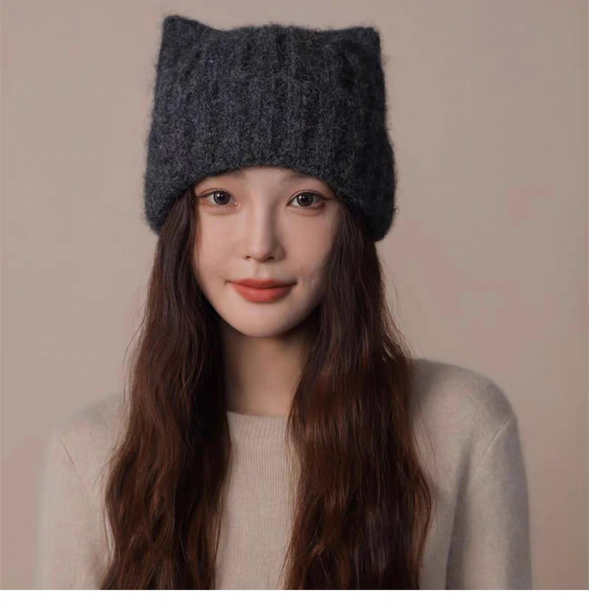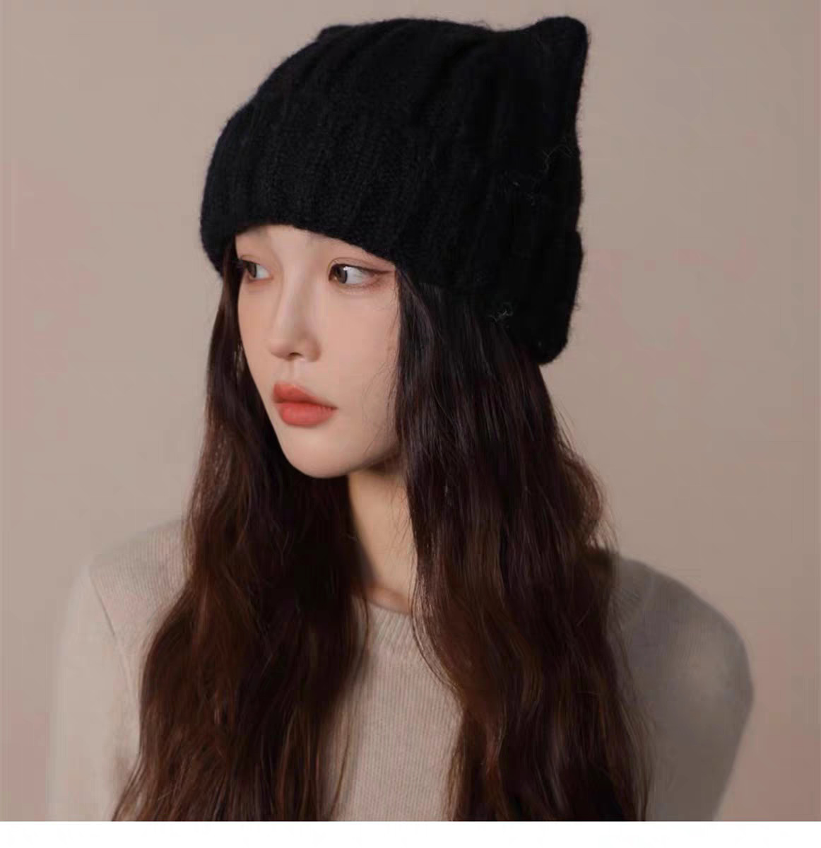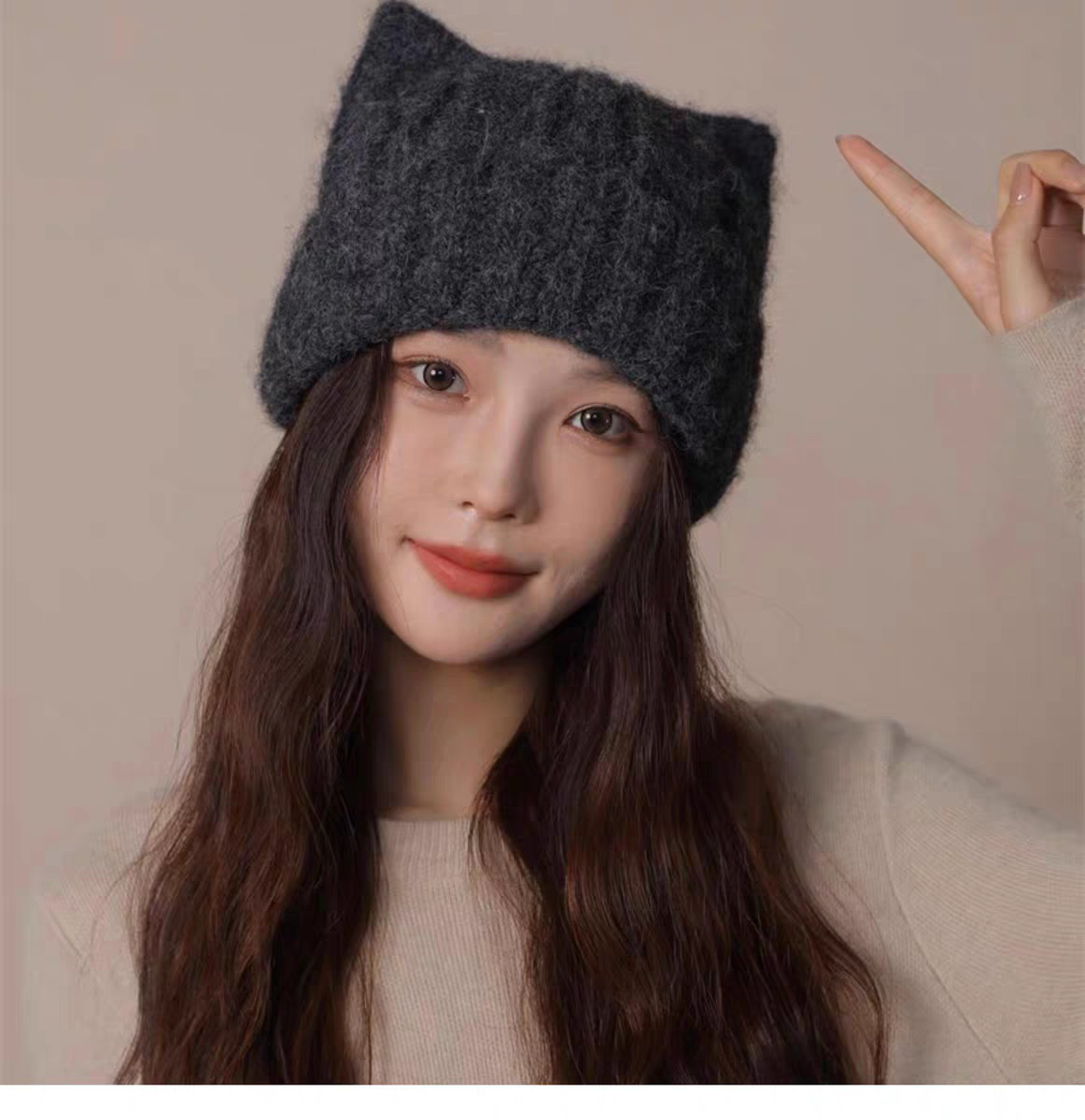 한국 새로운 귀여운 고양이 귀 부드러운 봉제 니트 모자 차가운 모자 모직 모자 여성 패션 올 매치 모자 조수