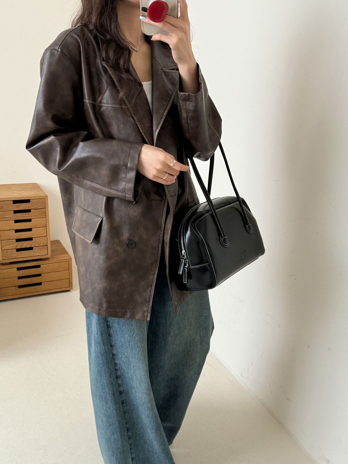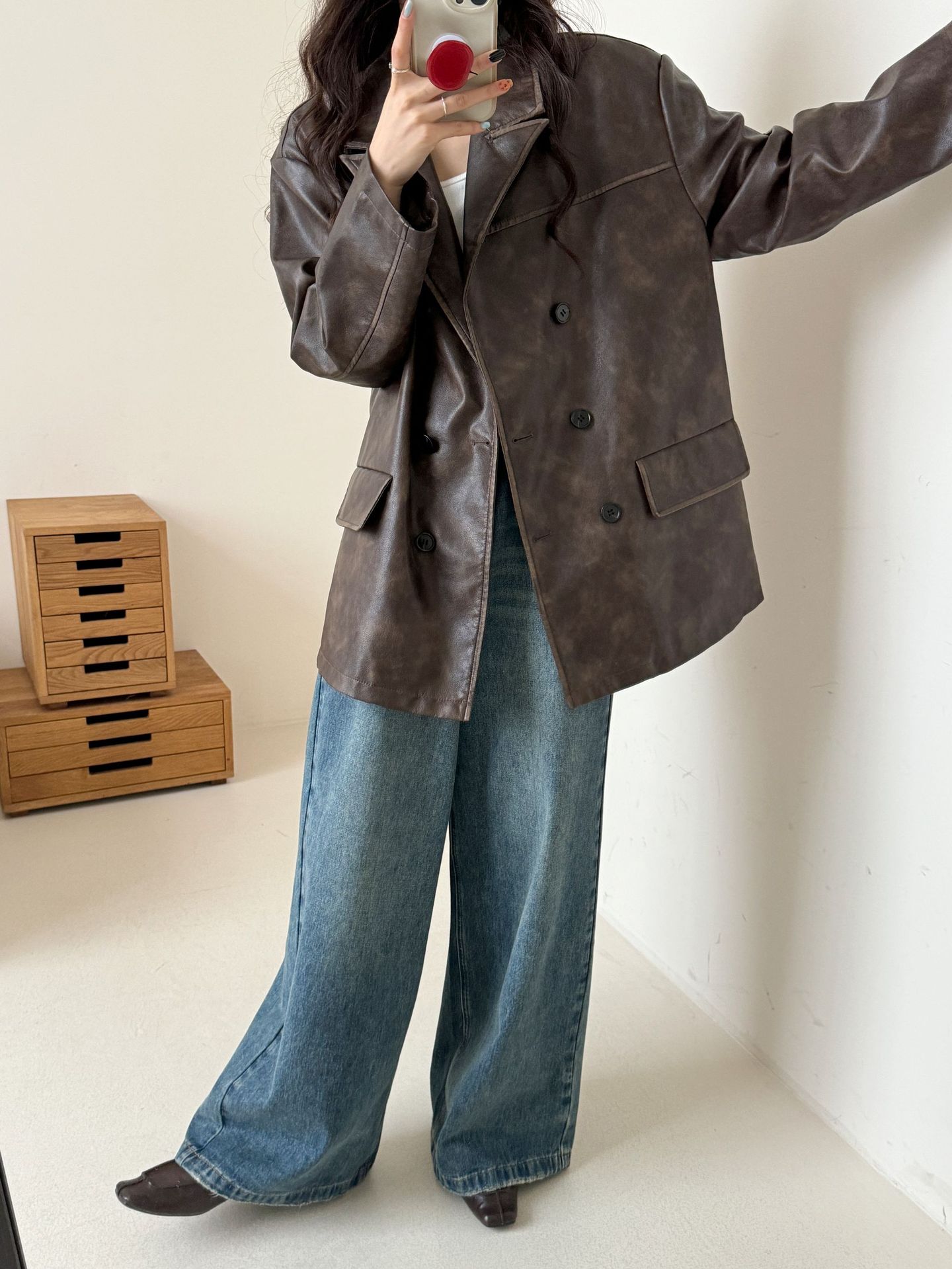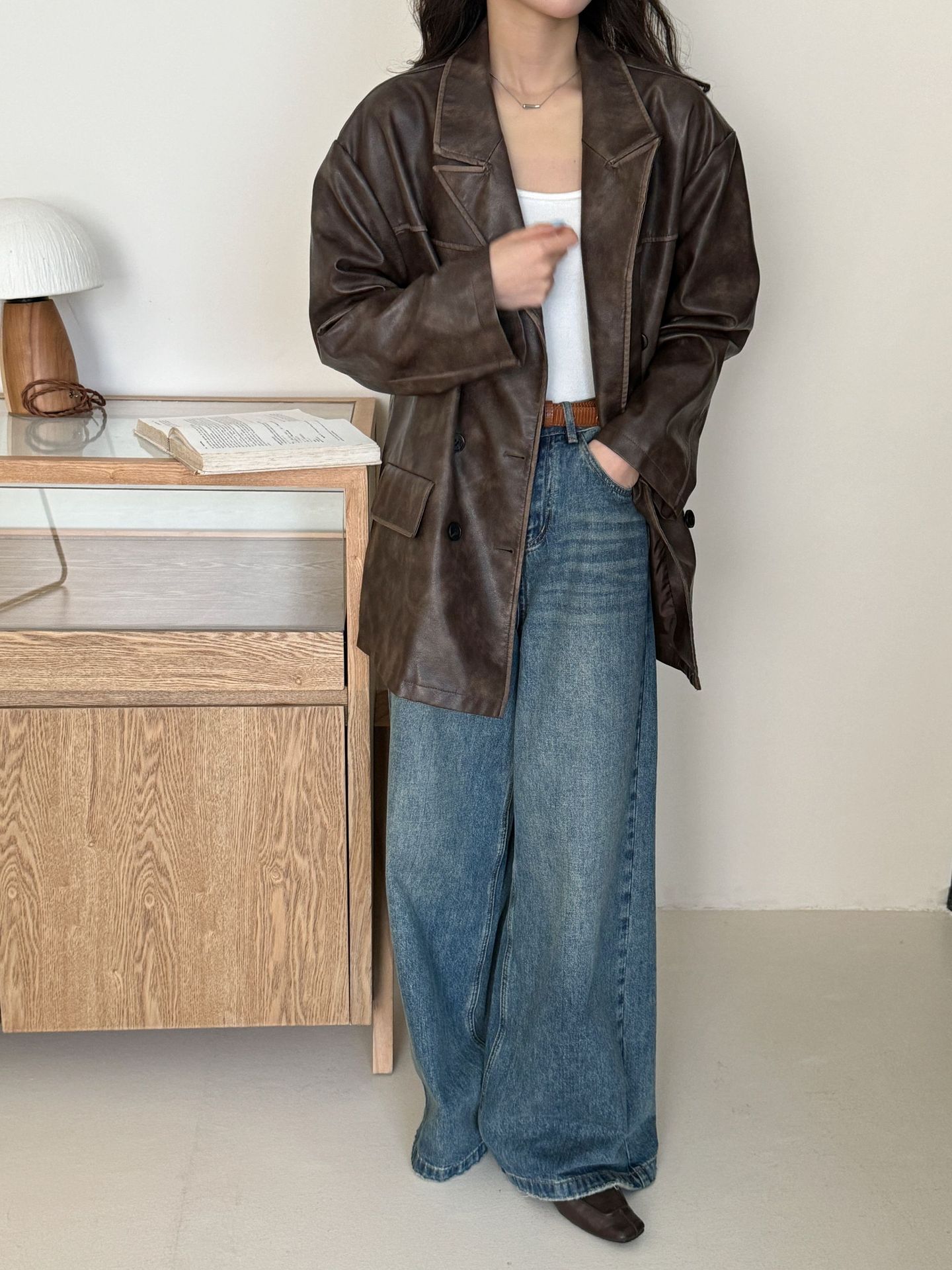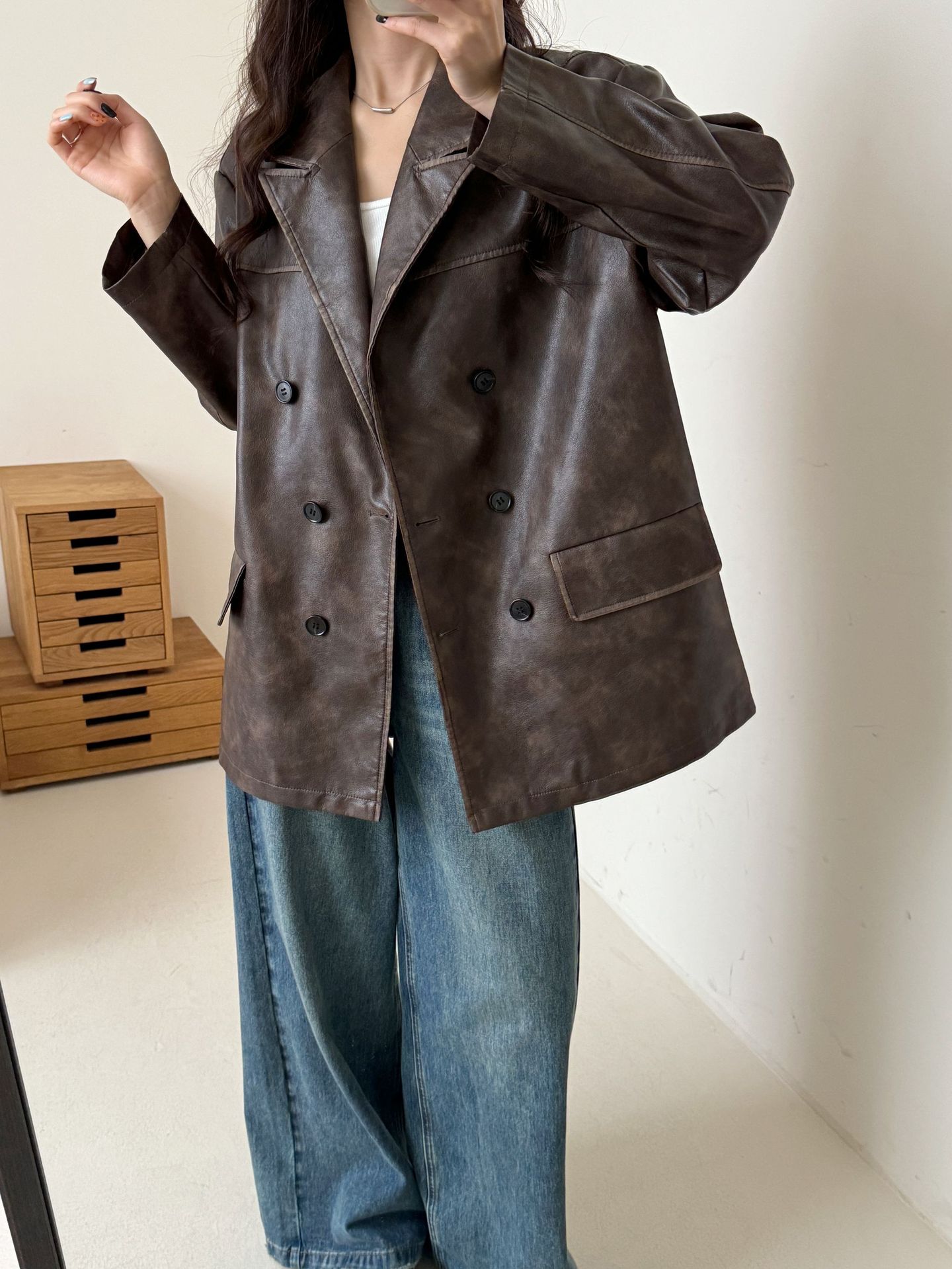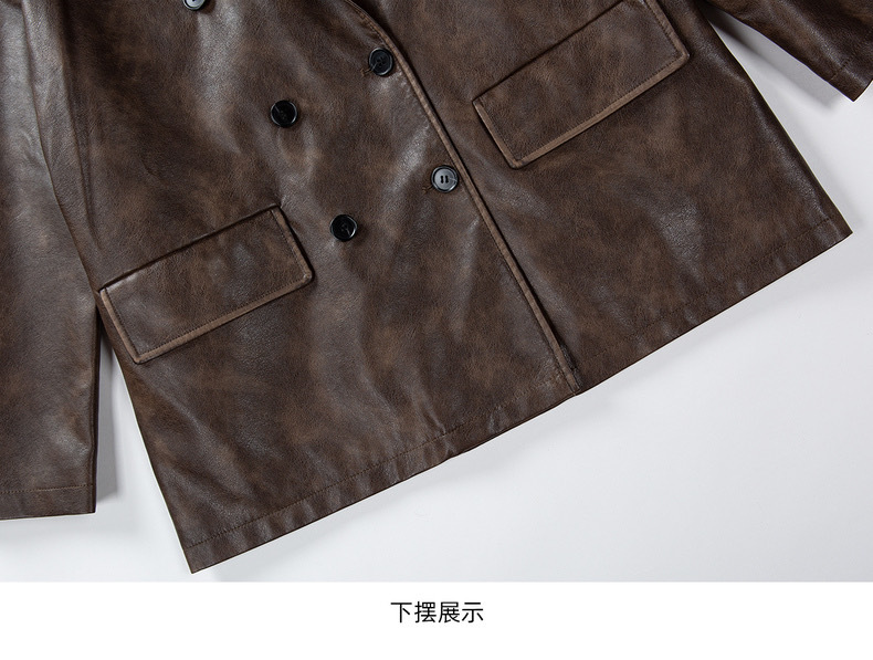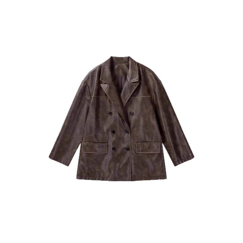 레트로 브라운 아메리칸 스타일 루즈핏 수트 PU 가죽 자켓 여성용 윈드브레이커 문학적 스타일의 짧은 레트로 자켓스토어 가기